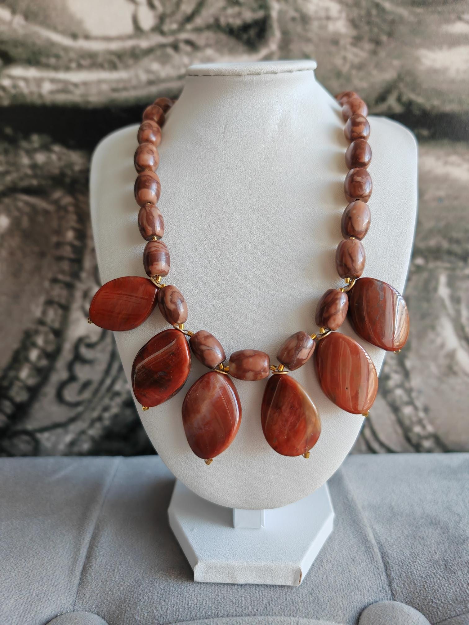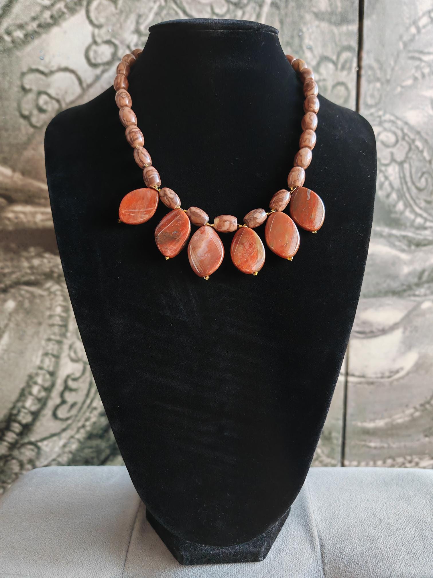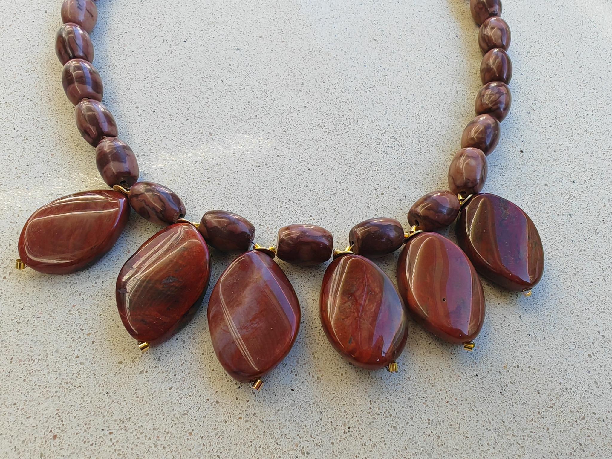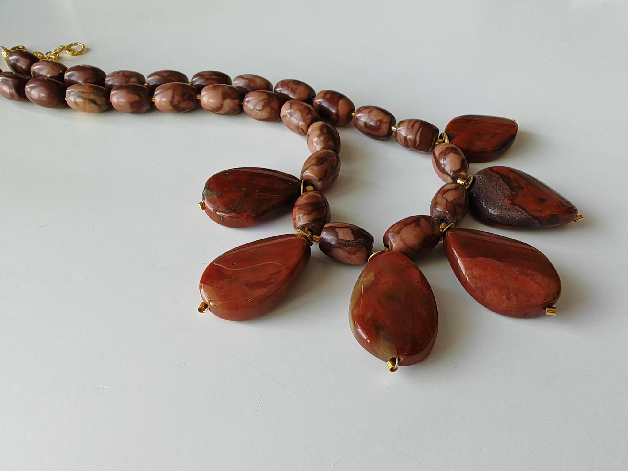 Handmade jasper necklace in rust/brown tones with 6 pendants. The necklace length is approximately 51 cm plus an extension chain. The necklace is made of barrel-shaped jasper beads (14 mm x 11 mm) in chocolate/rust tones and oval, curved beads in brown/rust (30 mm x 20 mm x 10 mm). The clasp, extension chain, metal beads, and discs (6 mm) are gold-colored.