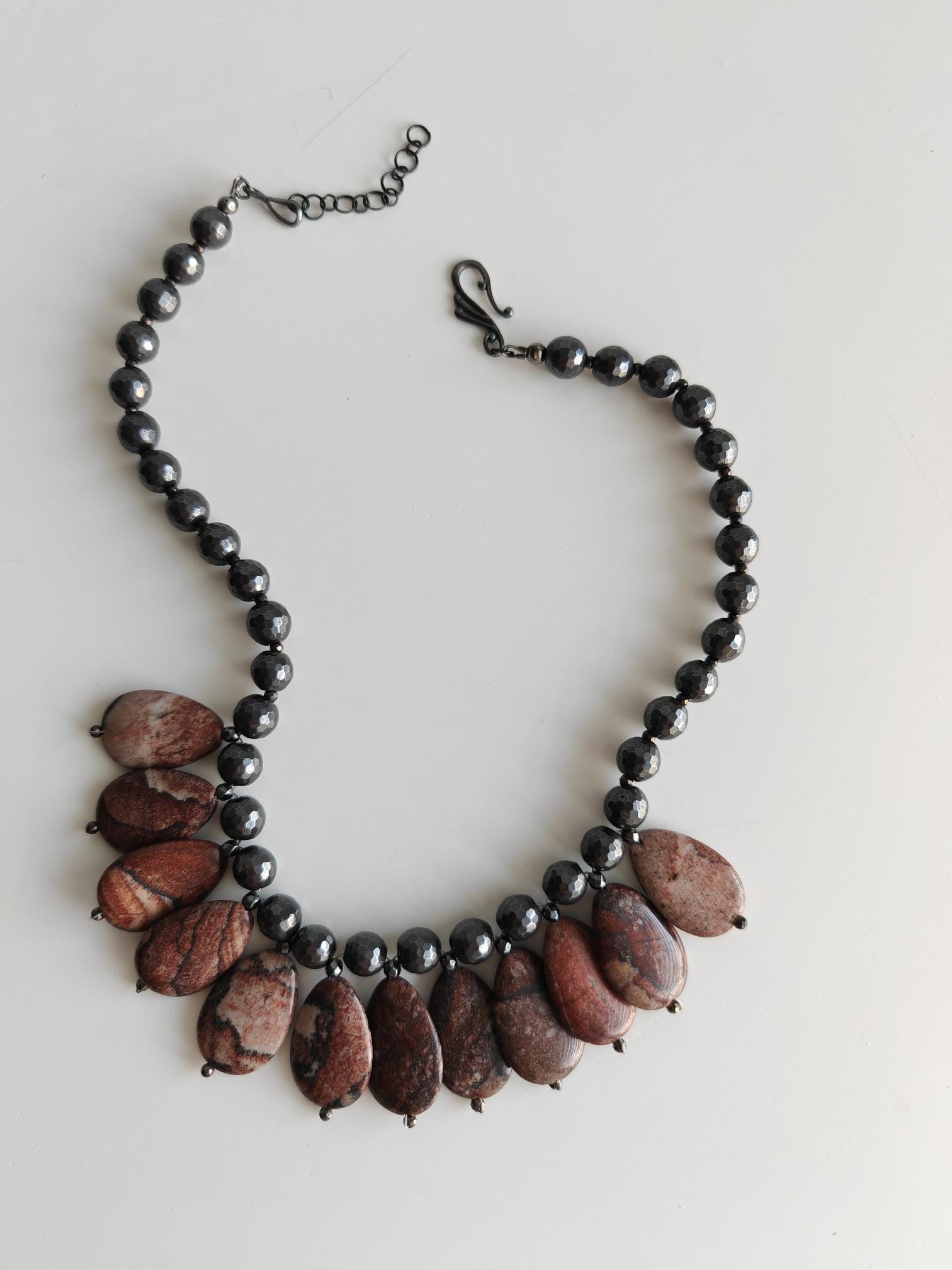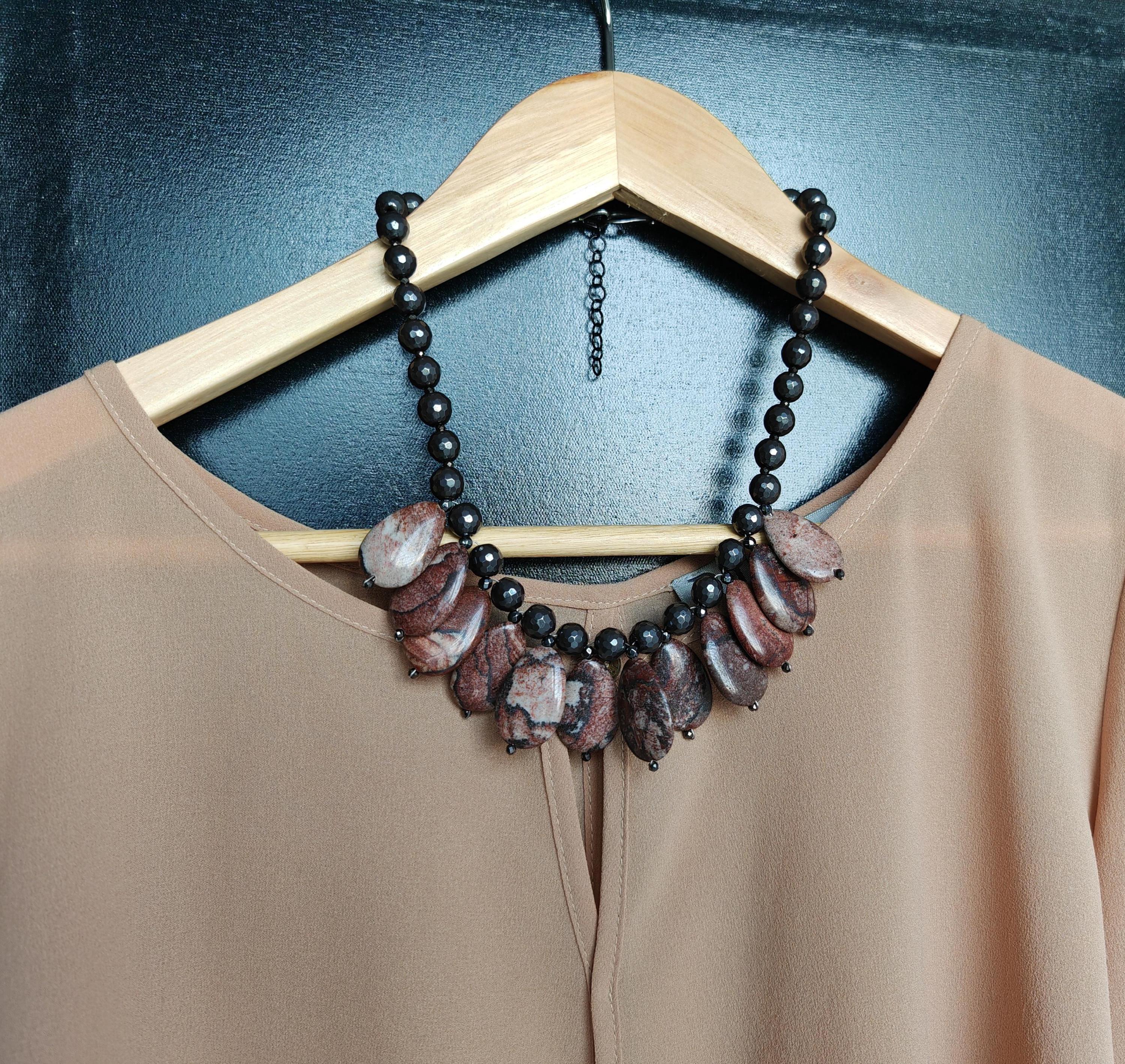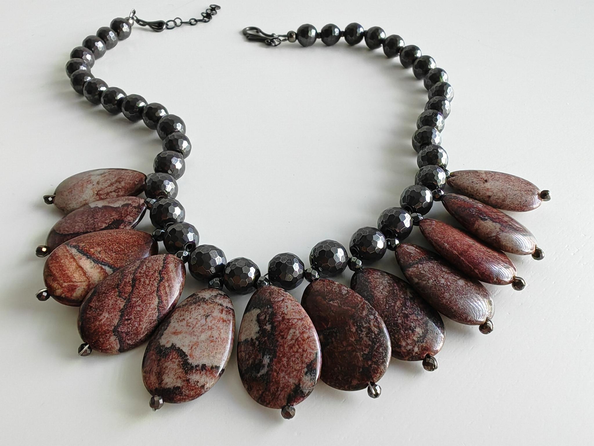 This handmade jasper necklace in a teardrop design in brown and black is approximately 49 cm long. The necklace is crafted from teardrop-shaped jasper beads in dark brown, burgundy, and black (30 mm x 19 mm x 6 mm), faceted hematite beads (10 mm and 4 mm) in black and anthracite, and faceted spinel beads (3 mm) in black and anthracite. The clasp and extension chain are black.
