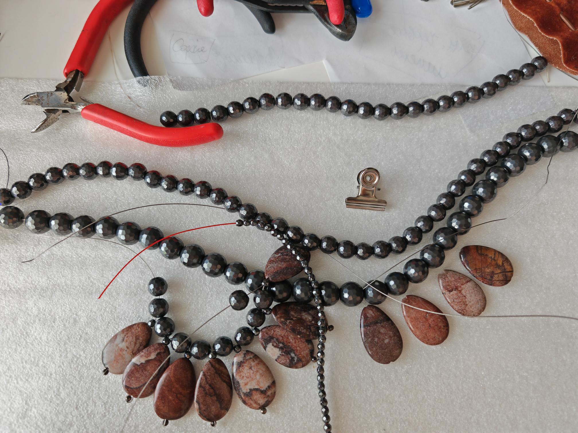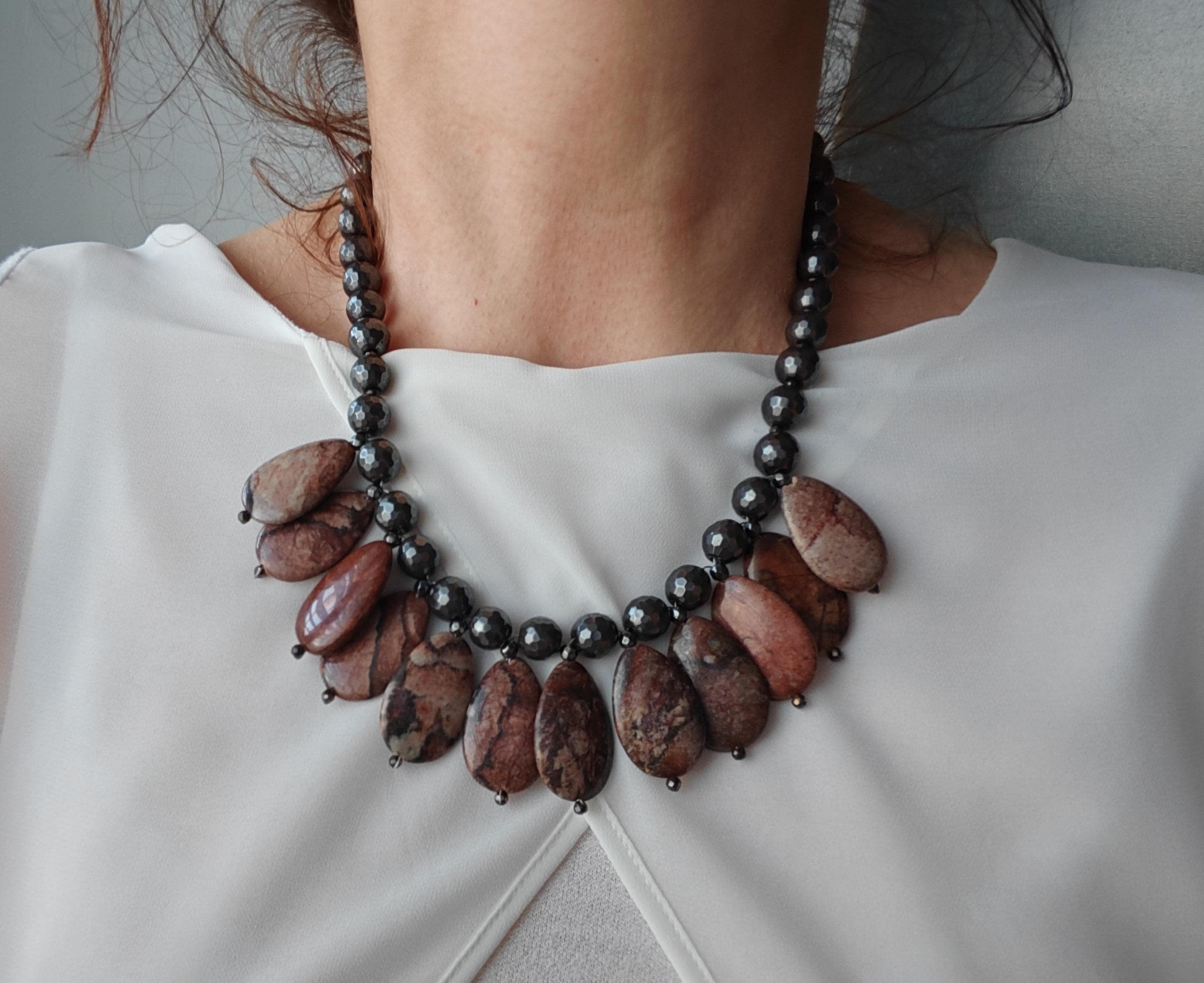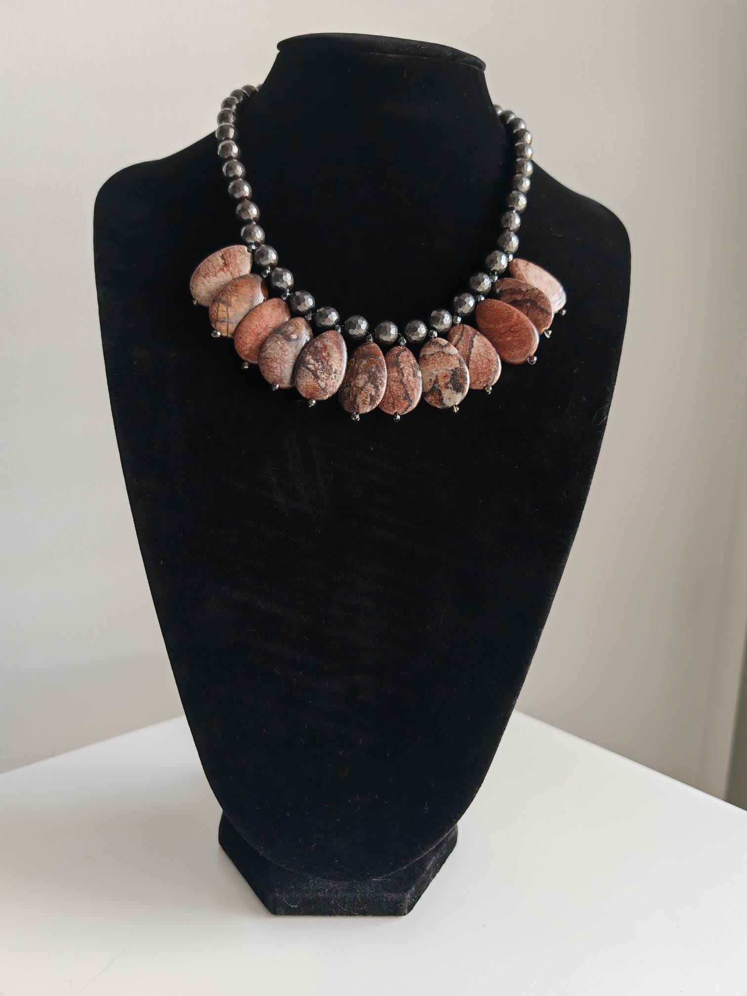 This handmade jasper necklace in a teardrop design in brown and black is approximately 49 cm long. The necklace is crafted from teardrop-shaped jasper beads in dark brown, burgundy, and black (30 mm x 19 mm x 6 mm), faceted hematite beads (10 mm and 4 mm) in black and anthracite, and faceted spinel beads (3 mm) in black and anthracite. The clasp and extension chain are black.