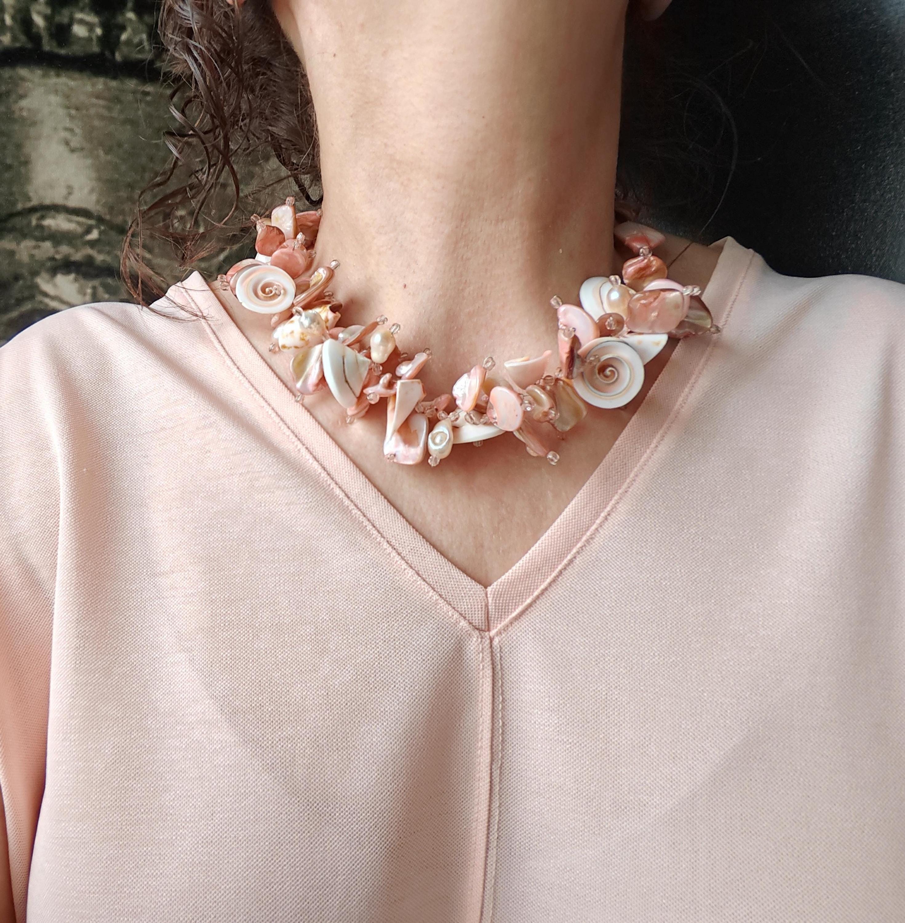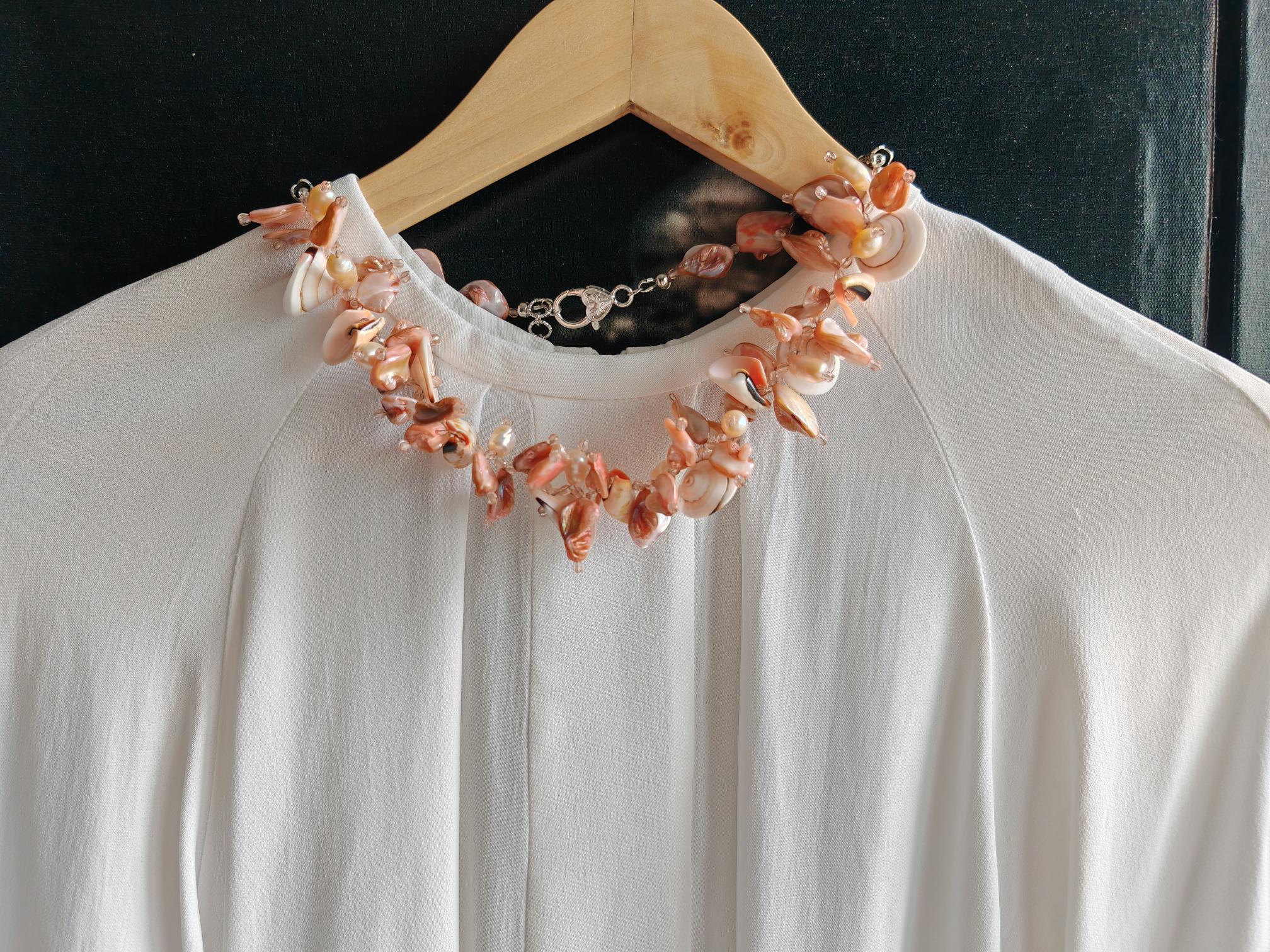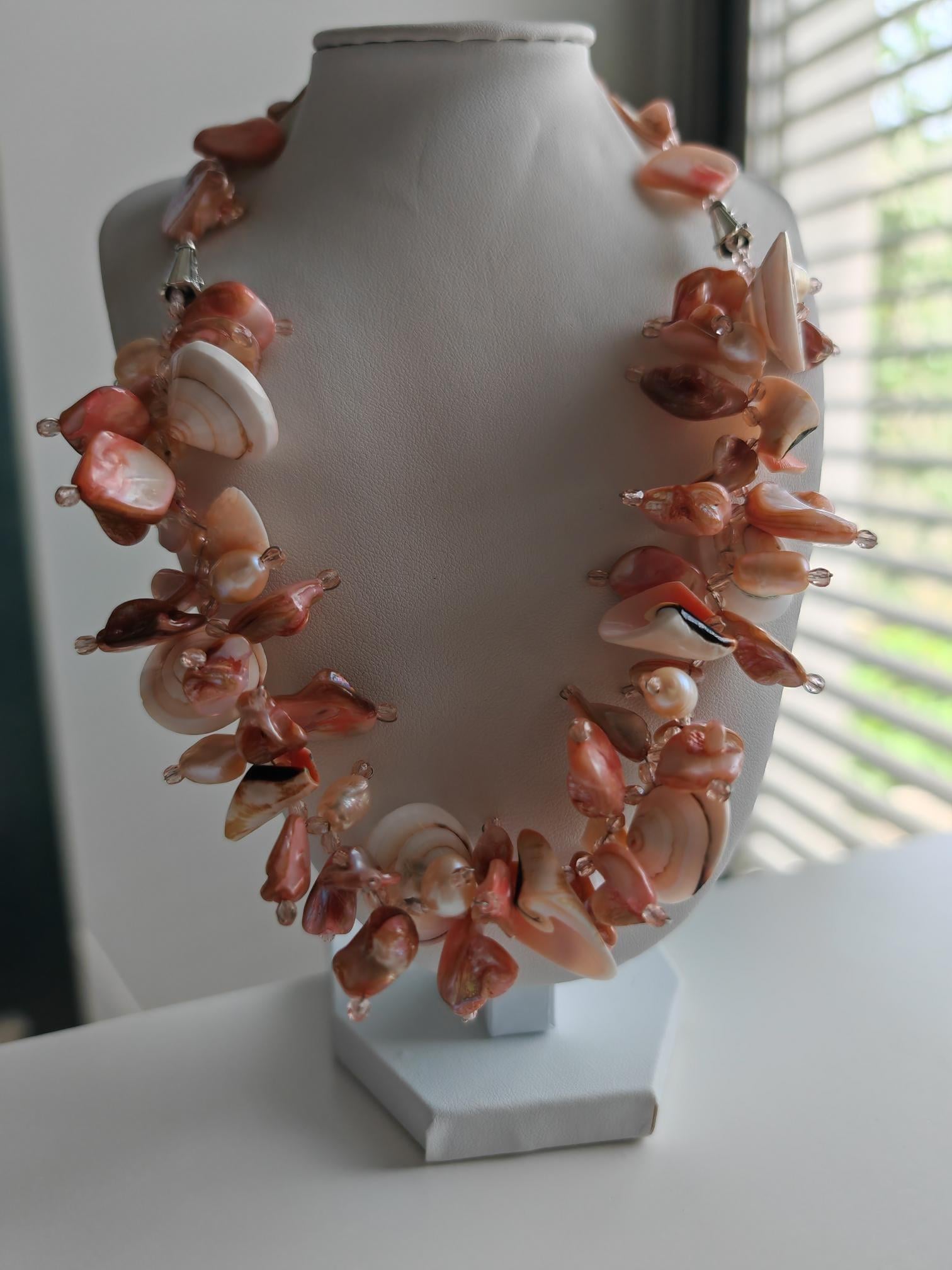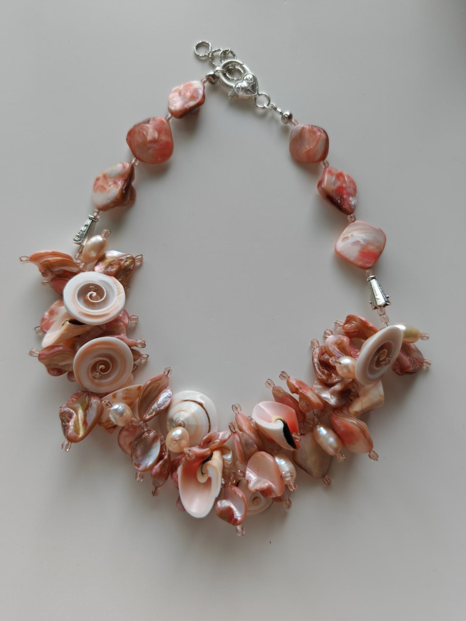 Handmade necklace, approximately 48 cm long, in rose gold. The necklace is made from rose-toned beads: square mother-of-pearl beads, freshwater pearls (10 mm - 13 mm), round shells (22 mm x 10 mm), conical shells (25 mm x 15 mm), and Bohemian glass beads (4 mm). The necklace is cheerful and unique. The clasp, extension chain, and bead caps are silver-colored.