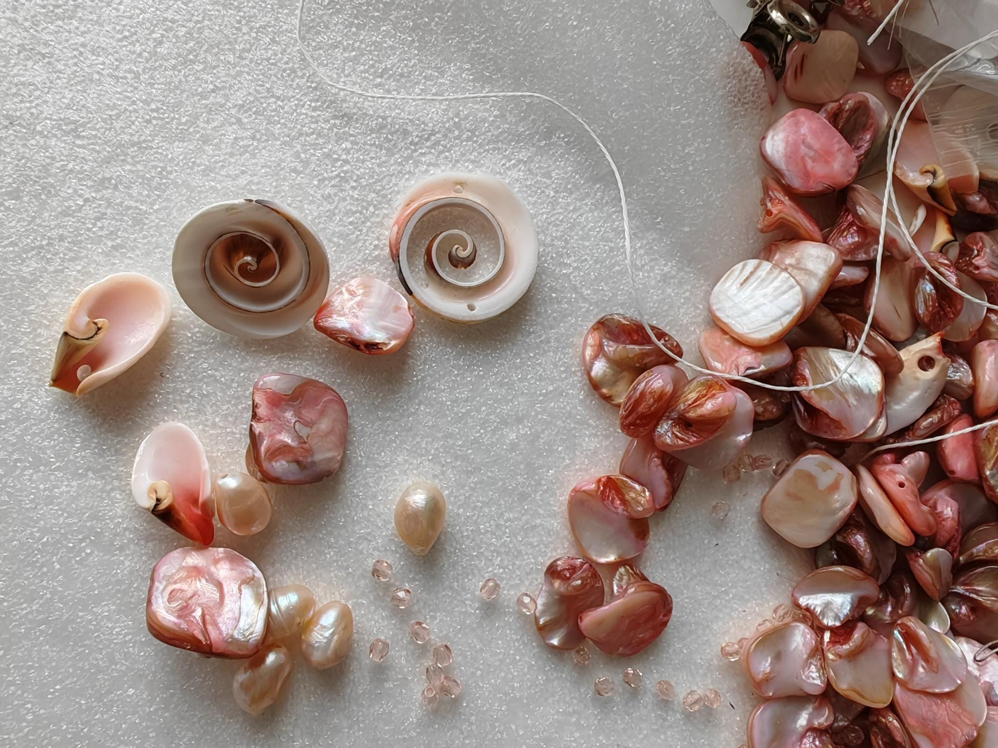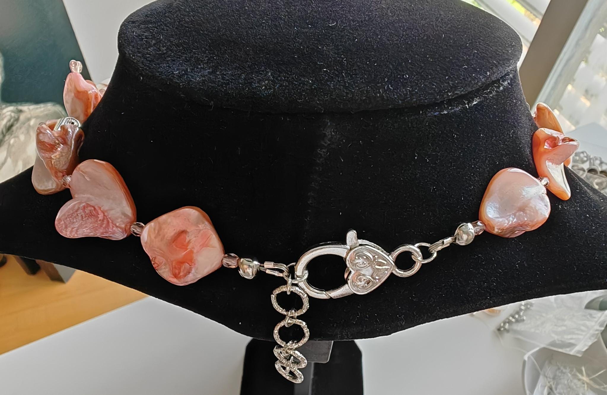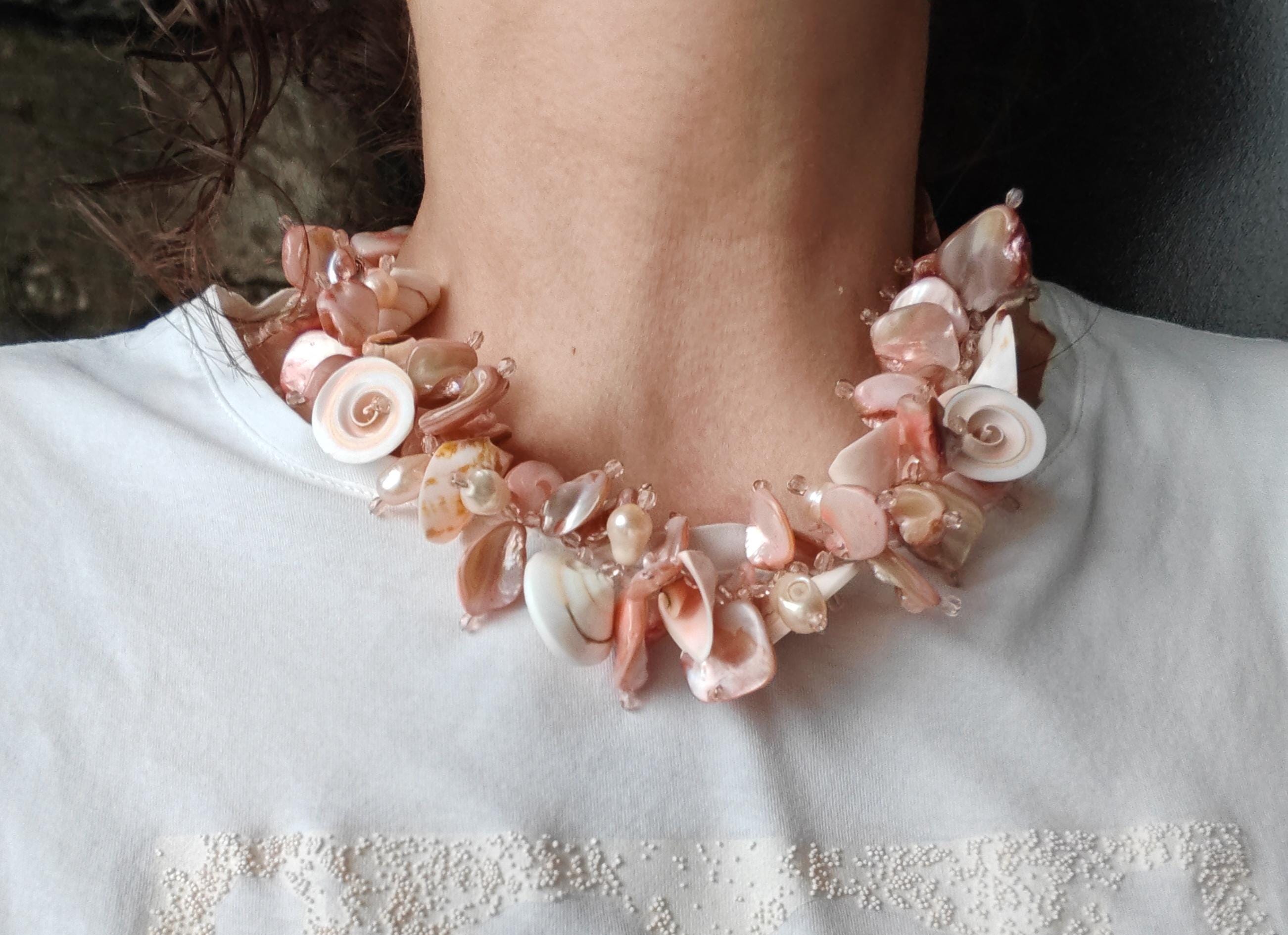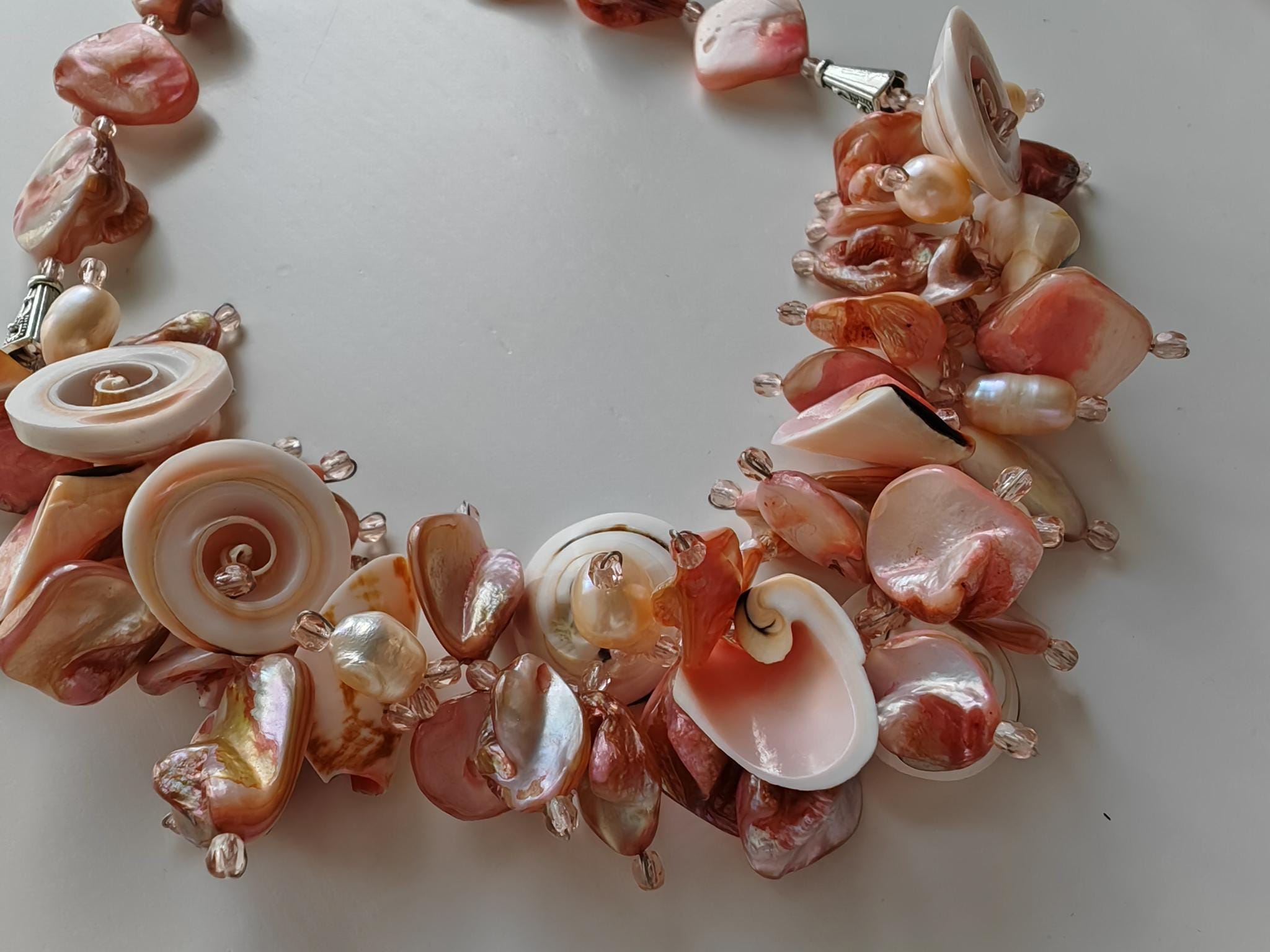 Handmade necklace, approximately 48 cm long, in rose gold. The necklace is made from rose-toned beads: square mother-of-pearl beads, freshwater pearls (10 mm - 13 mm), round shells (22 mm x 10 mm), conical shells (25 mm x 15 mm), and Bohemian glass beads (4 mm). The necklace is cheerful and unique. The clasp, extension chain, and bead caps are silver-colored.