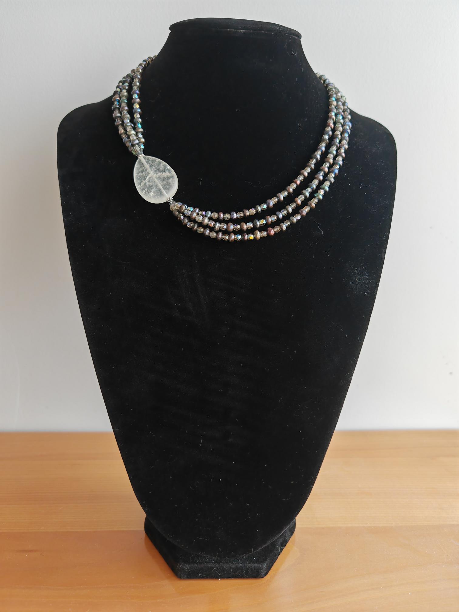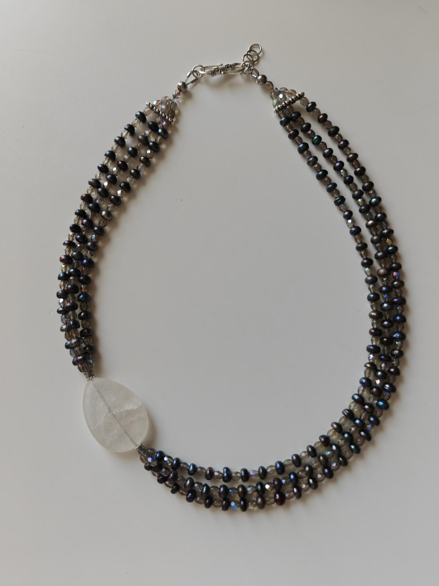 This three-strand grey necklace in a monochromatic design is approximately 50 cm long. The delicate piece is crafted from grey freshwater pearls (approx. 6 mm, with a purple shimmer), faceted light grey Bohemian glass beads (4 mm), faceted grey spinel beads (2 mm), and a cracked, teardrop-shaped rock crystal bead (39 mm x 25 mm x 9 mm). The S-clasp, dividers, metal beads, and extension chain are antique silver.