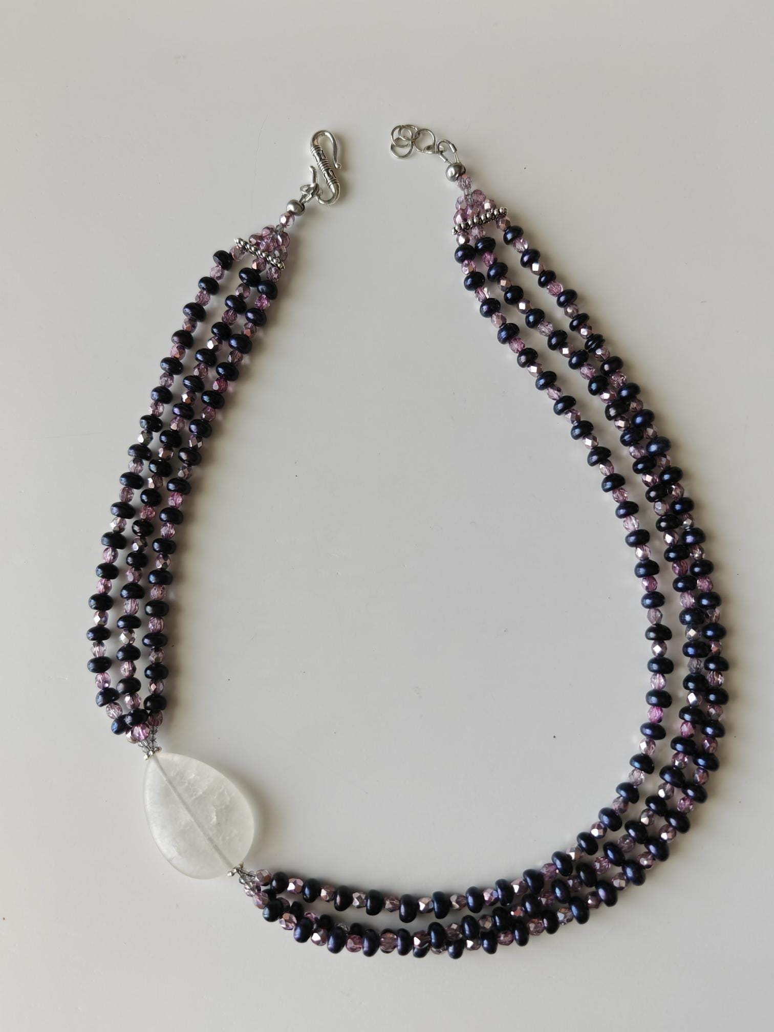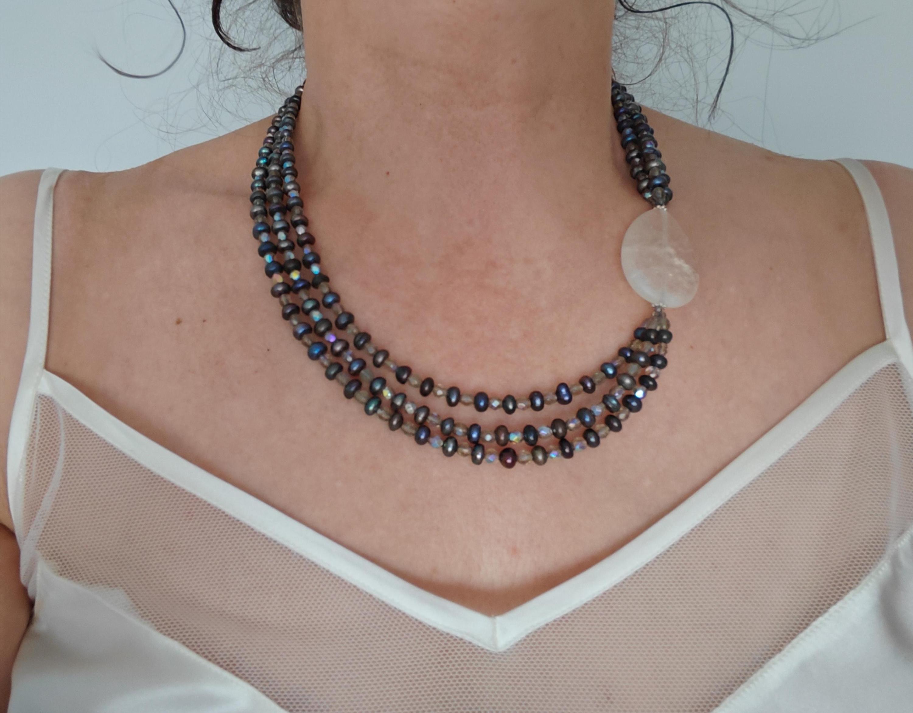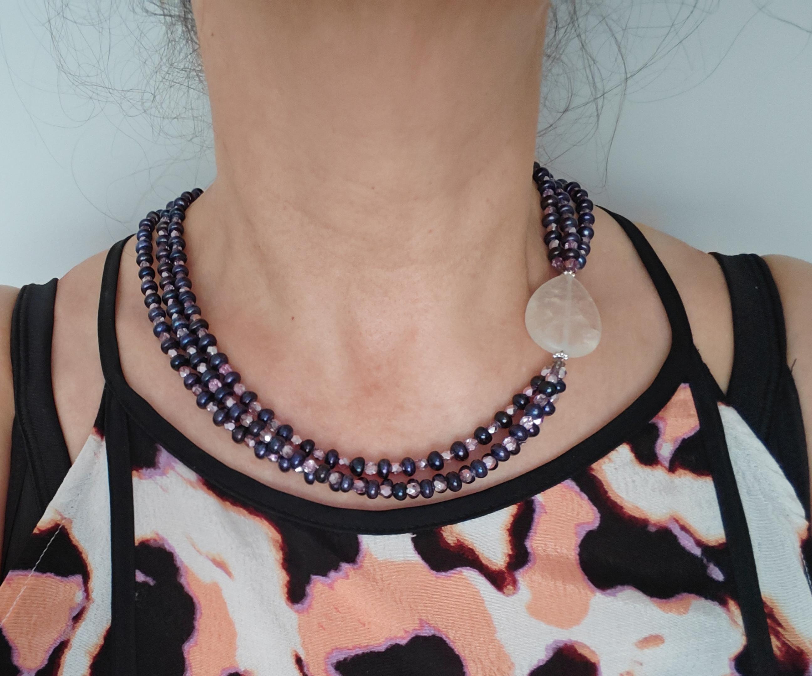 The second three-strand necklace with dark blue freshwater pearls is approximately 52 cm long. This delicate piece of jewelry is crafted from dark blue freshwater pearls (approximately 5-6 mm), faceted Bohemian glass beads in amethyst (4 mm), faceted gray spinel beads (2 mm), and a cracked, teardrop-shaped rock crystal bead (39 mm x 25 mm x 9 mm). The S-clasp, dividers, metal beads, and extension chain are antique silver.