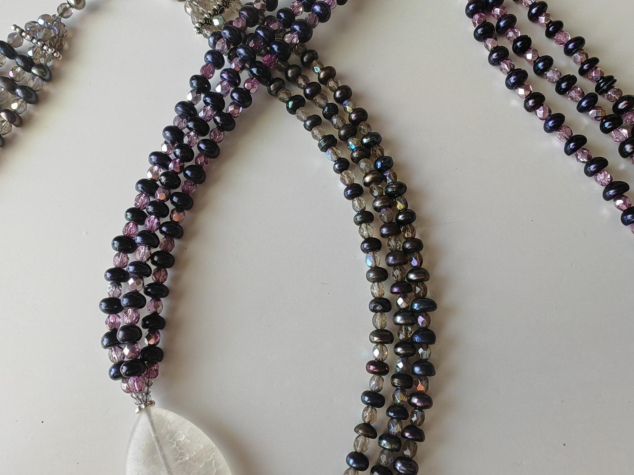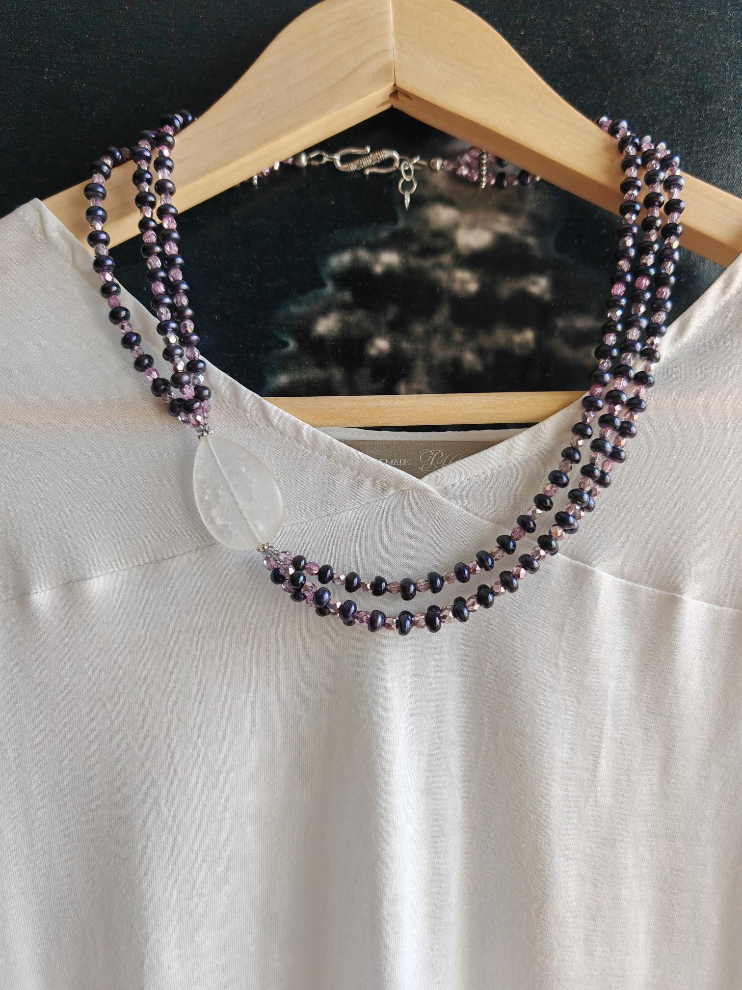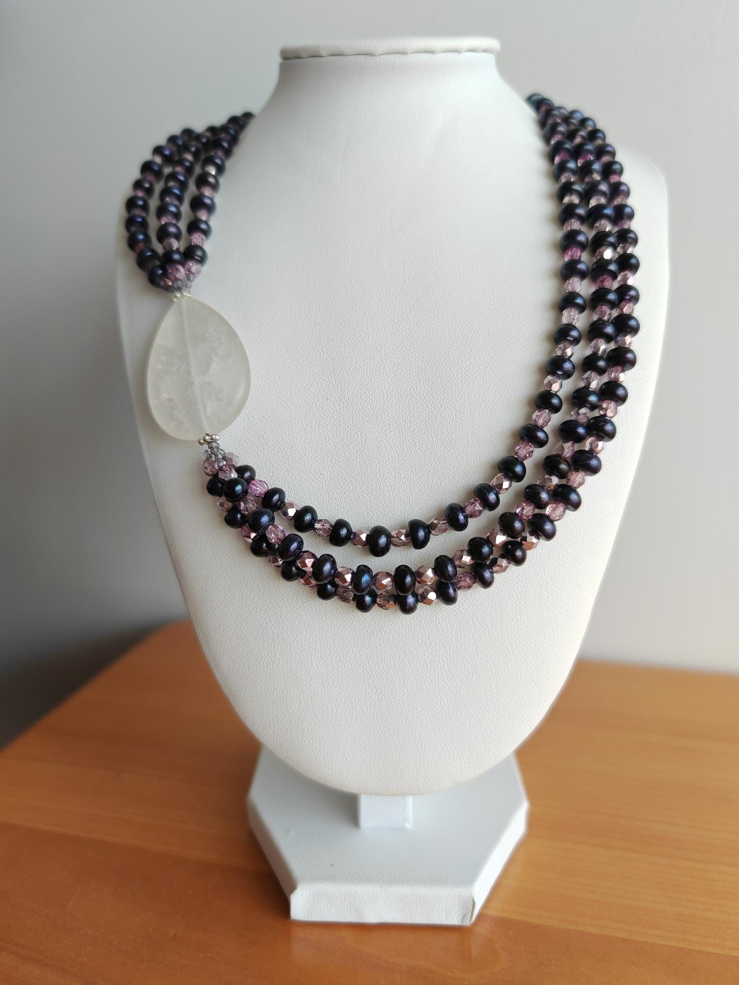 The second three-strand necklace with dark blue freshwater pearls is approximately 52 cm long. This delicate piece of jewelry is crafted from dark blue freshwater pearls (approximately 5-6 mm), faceted Bohemian glass beads in amethyst (4 mm), faceted gray spinel beads (2 mm), and a cracked, teardrop-shaped rock crystal bead (39 mm x 25 mm x 9 mm). The S-clasp, dividers, metal beads, and extension chain are antique silver.