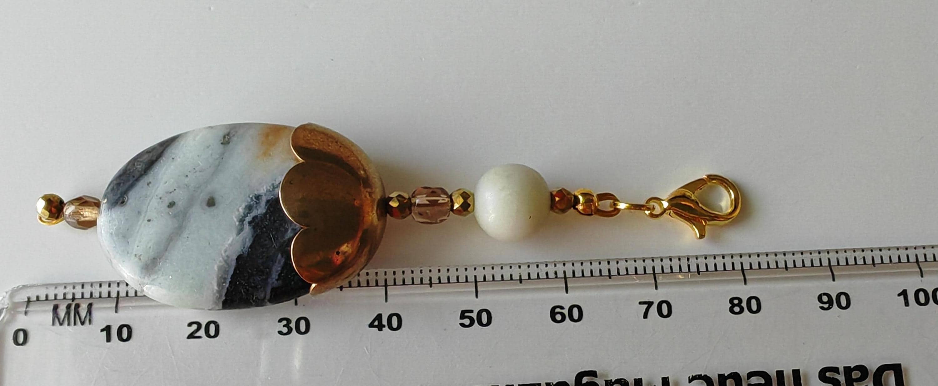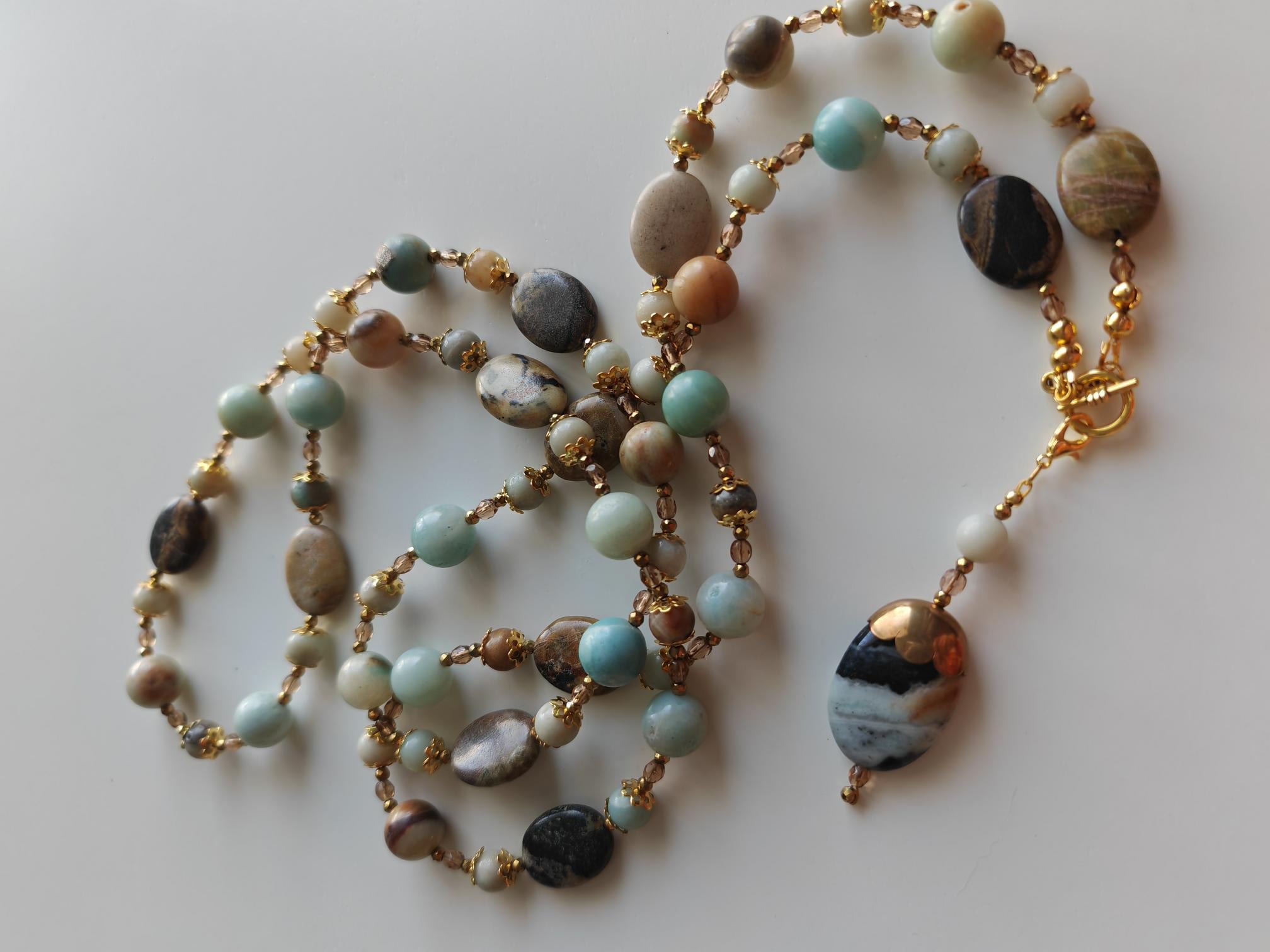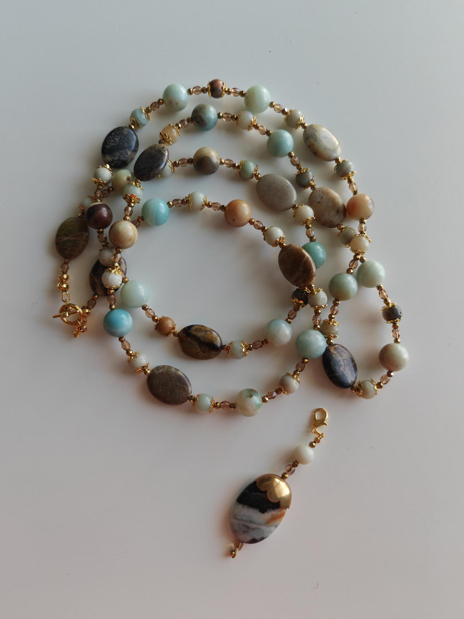 The first amazonite necklace in light blue/beige/brown is approximately 120 cm long. This colorful necklace is made of round amazonite beads in light blue/turquoise/beige/gray (12 mm and 8 mm), oval jasper beads in beige/brown/green (20 mm x 15 mm x 6 mm), faceted spinel beads in gold (3 mm), and faceted Bohemian glass beads in gray (4 mm). The detachable pendant is approximately 8 cm long. The chain clasp and the bead caps are gold-colored.