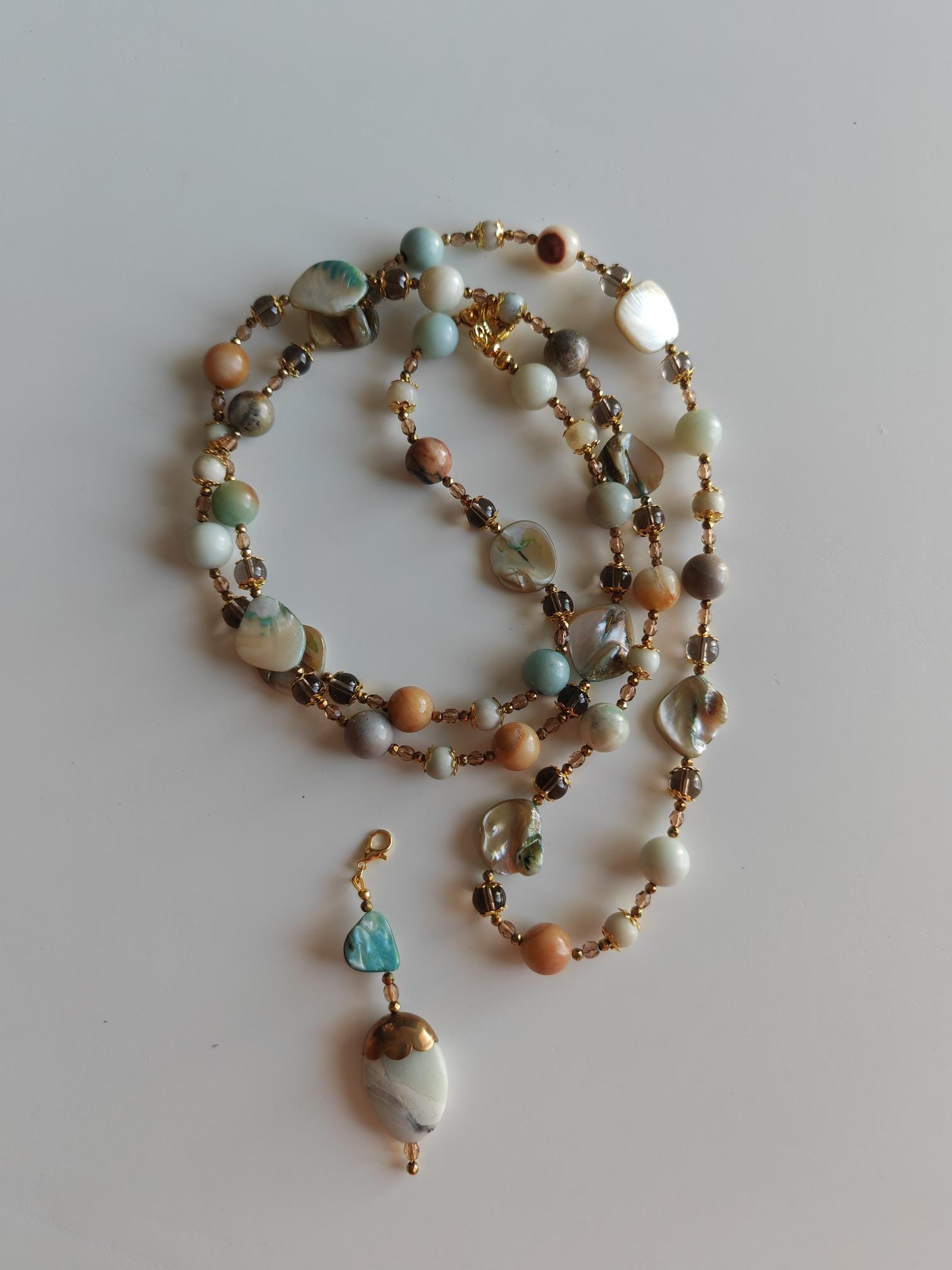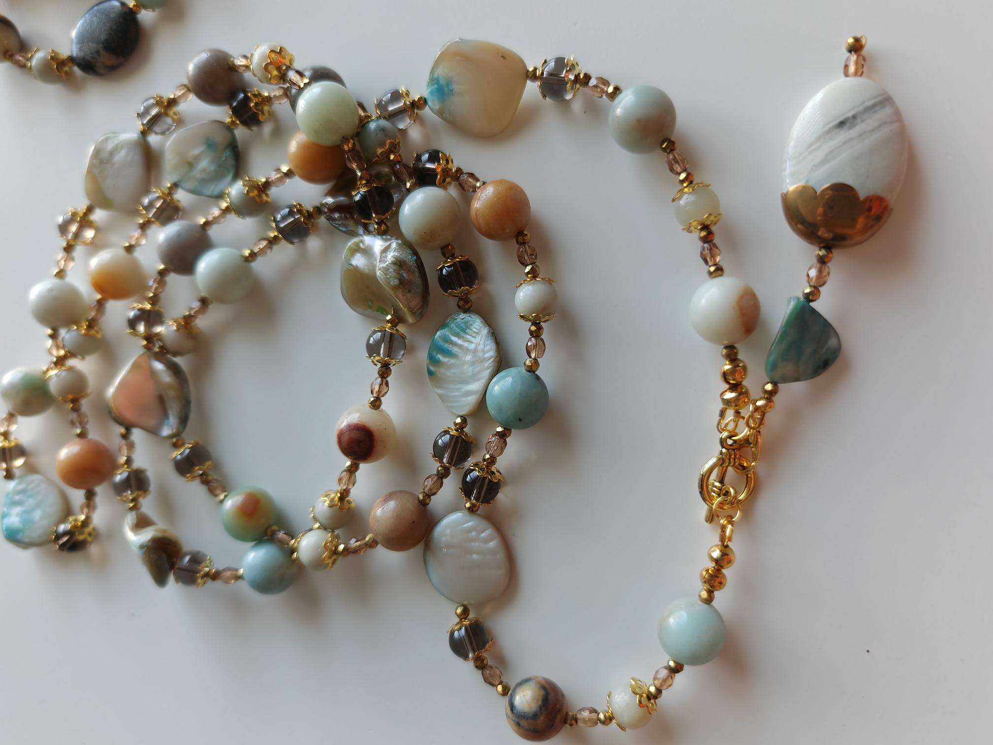The second amazonite necklace in light blue/beige is approximately 120 cm long. This colorful necklace is made from round amazonite beads in light blue/turquoise/beige/gray (12 mm and 8 mm), square mother-of-pearl beads in light blue (20 mm x 22 mm x 4 mm), clear round smoky quartz beads in gray (8 mm), faceted spinel beads in gold (3 mm), and faceted Bohemian glass beads in gray (4 mm). The removable pendant is approximately 8 cm long. The chain clasp and the bead caps are gold-colored.