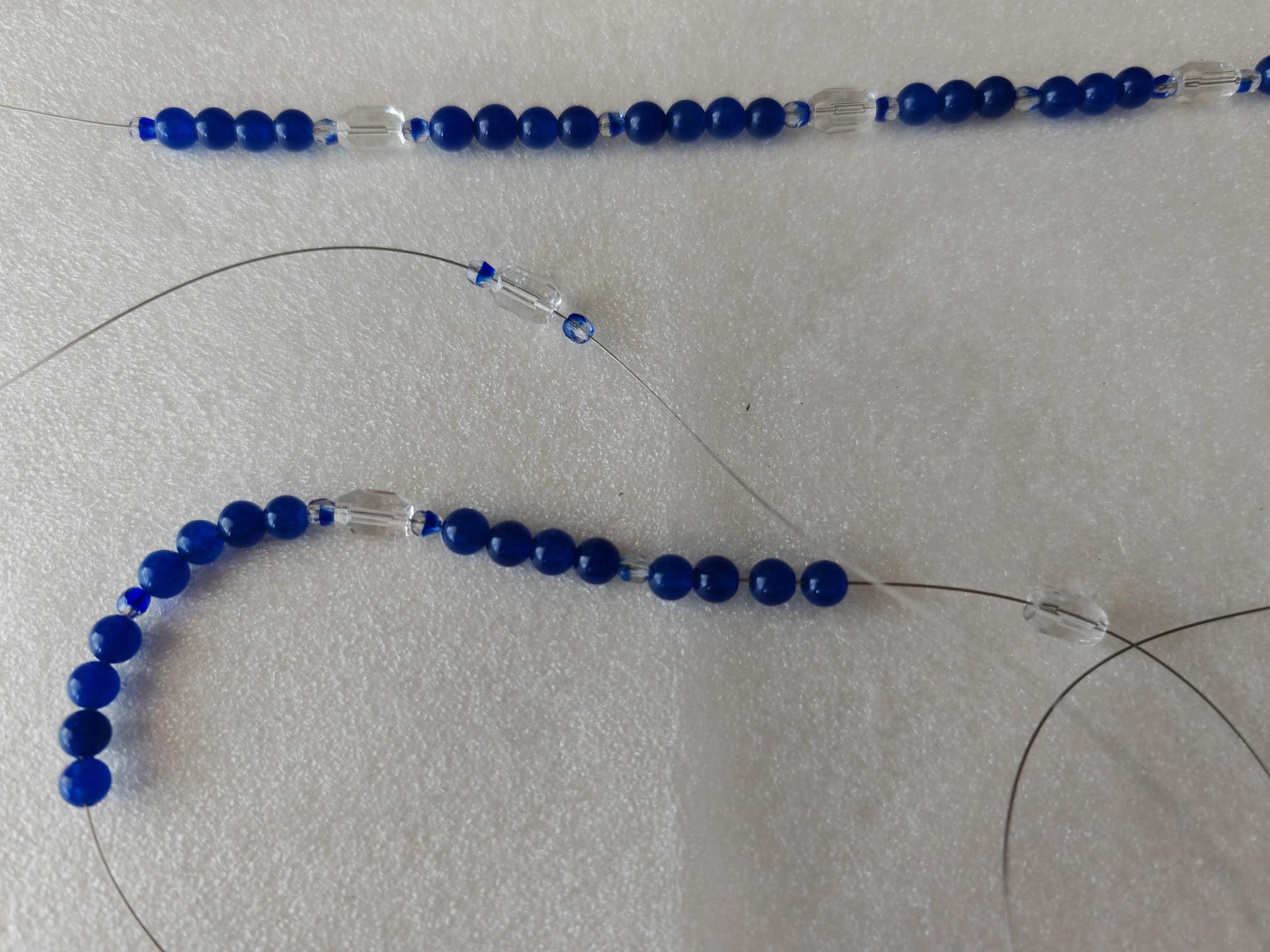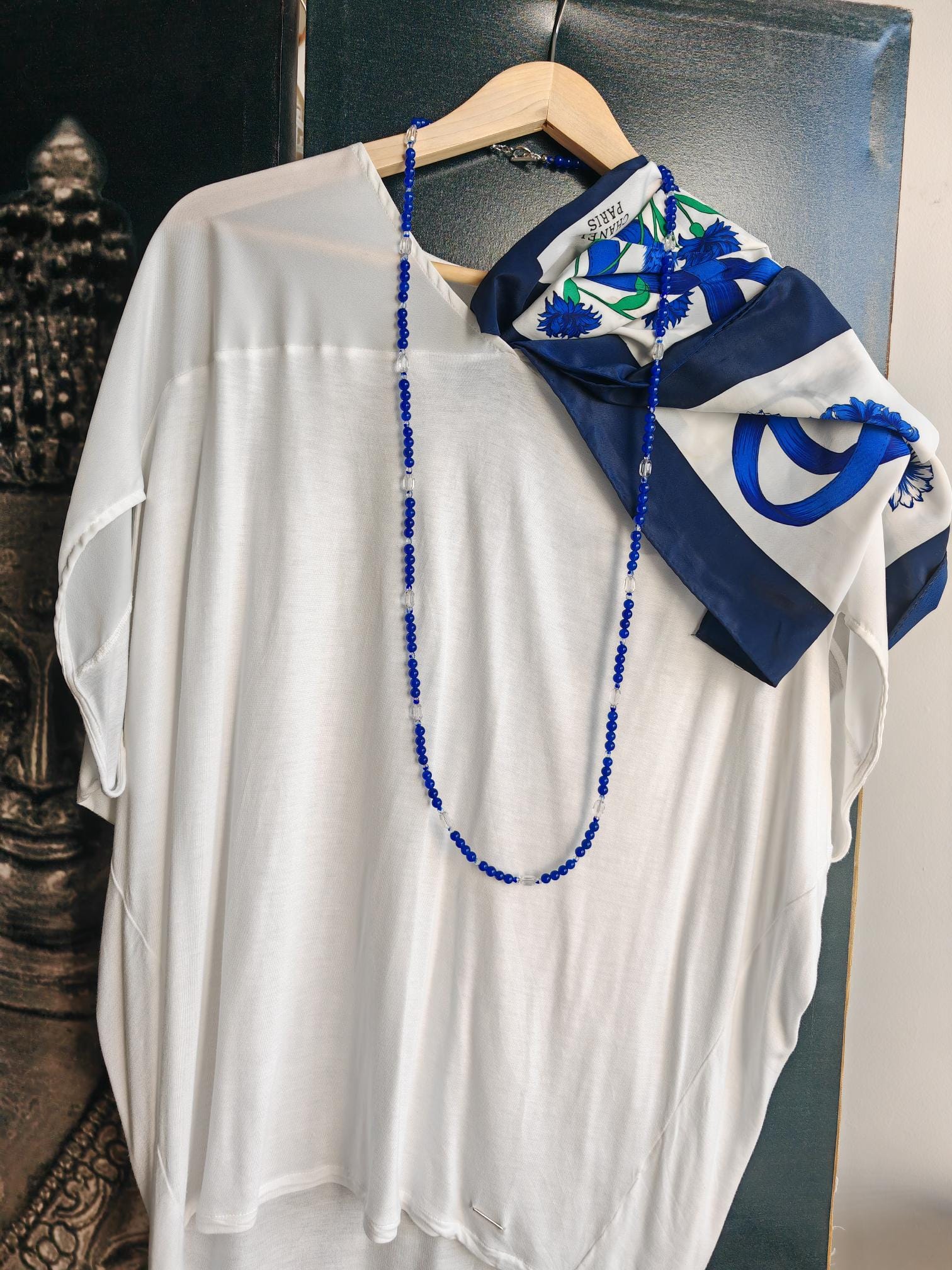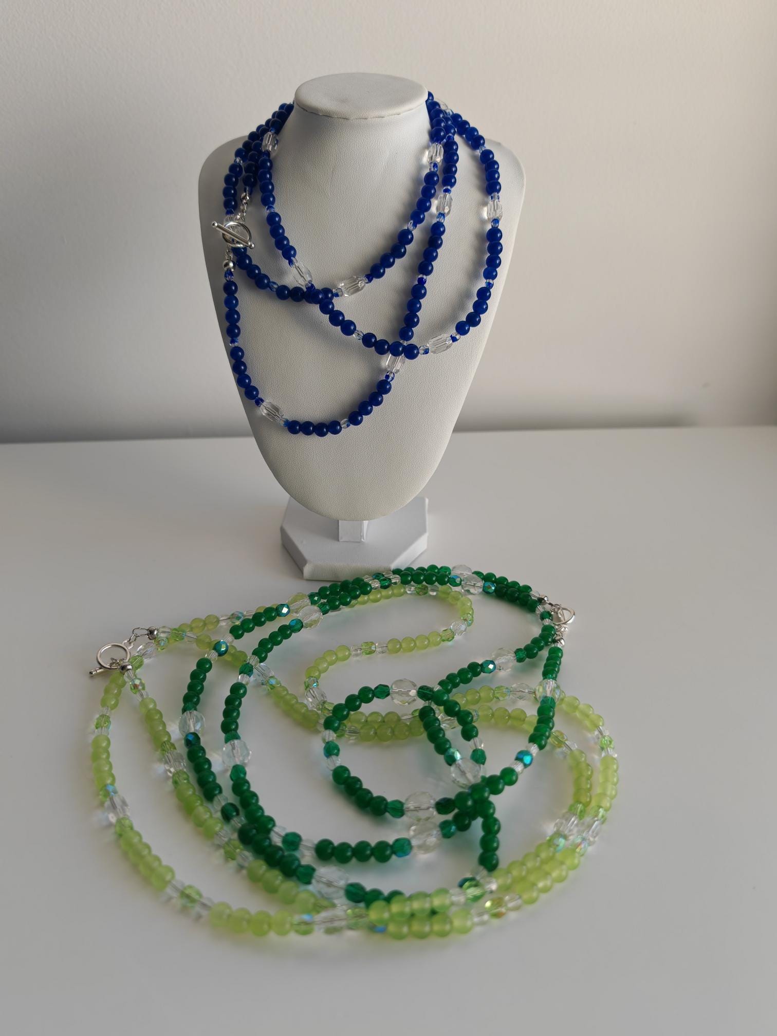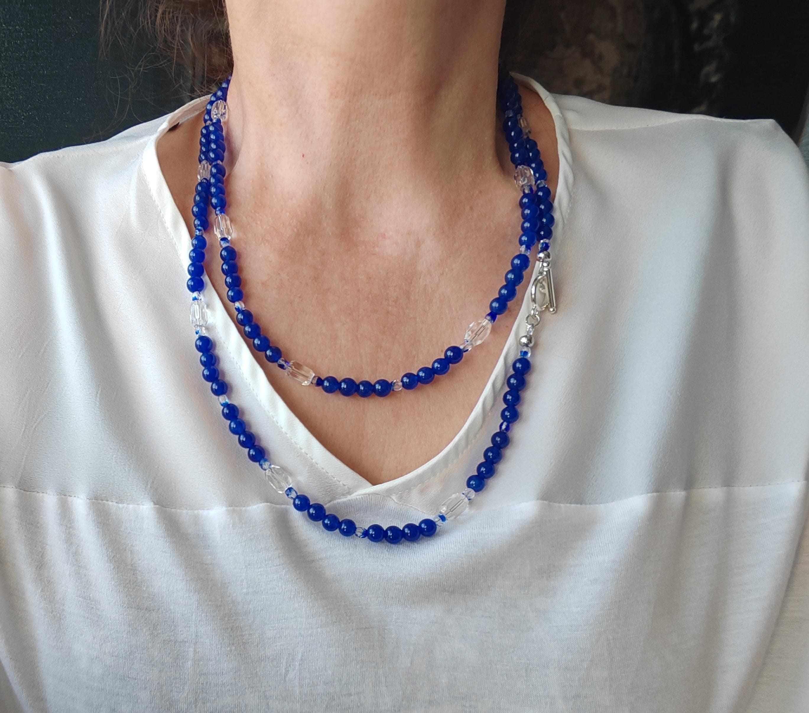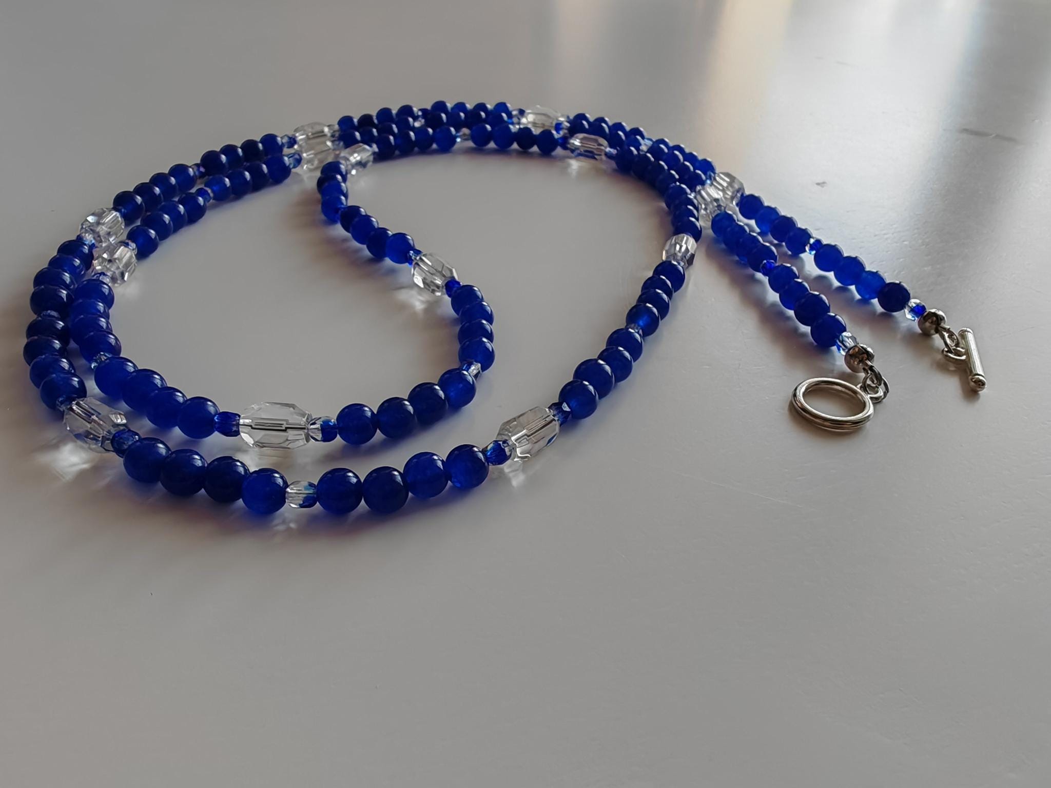 The royal blue necklace is approximately 113 cm long. The radiant necklace is crafted from dyed white jade beads (6 mm) and faceted Bohemian glass beads (4 mm transparent royal blue beads and 10 mm x 7 mm transparent barrel beads). The toggle clasp is silver. You can wear this delicate necklace in a variety of ways. You can wear it everyday as well as for special occasions.