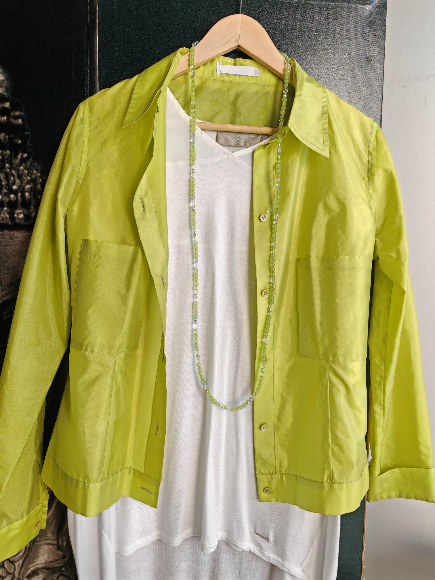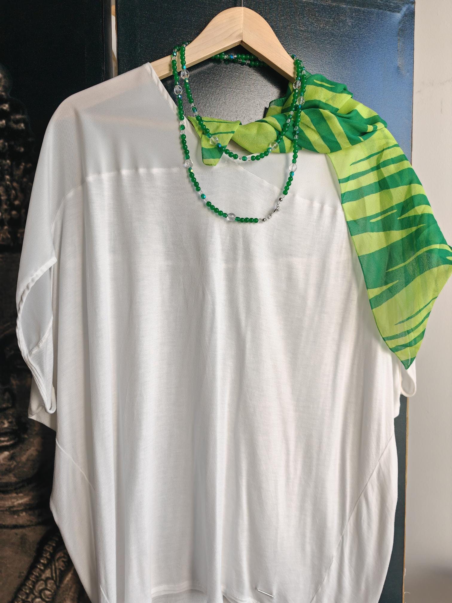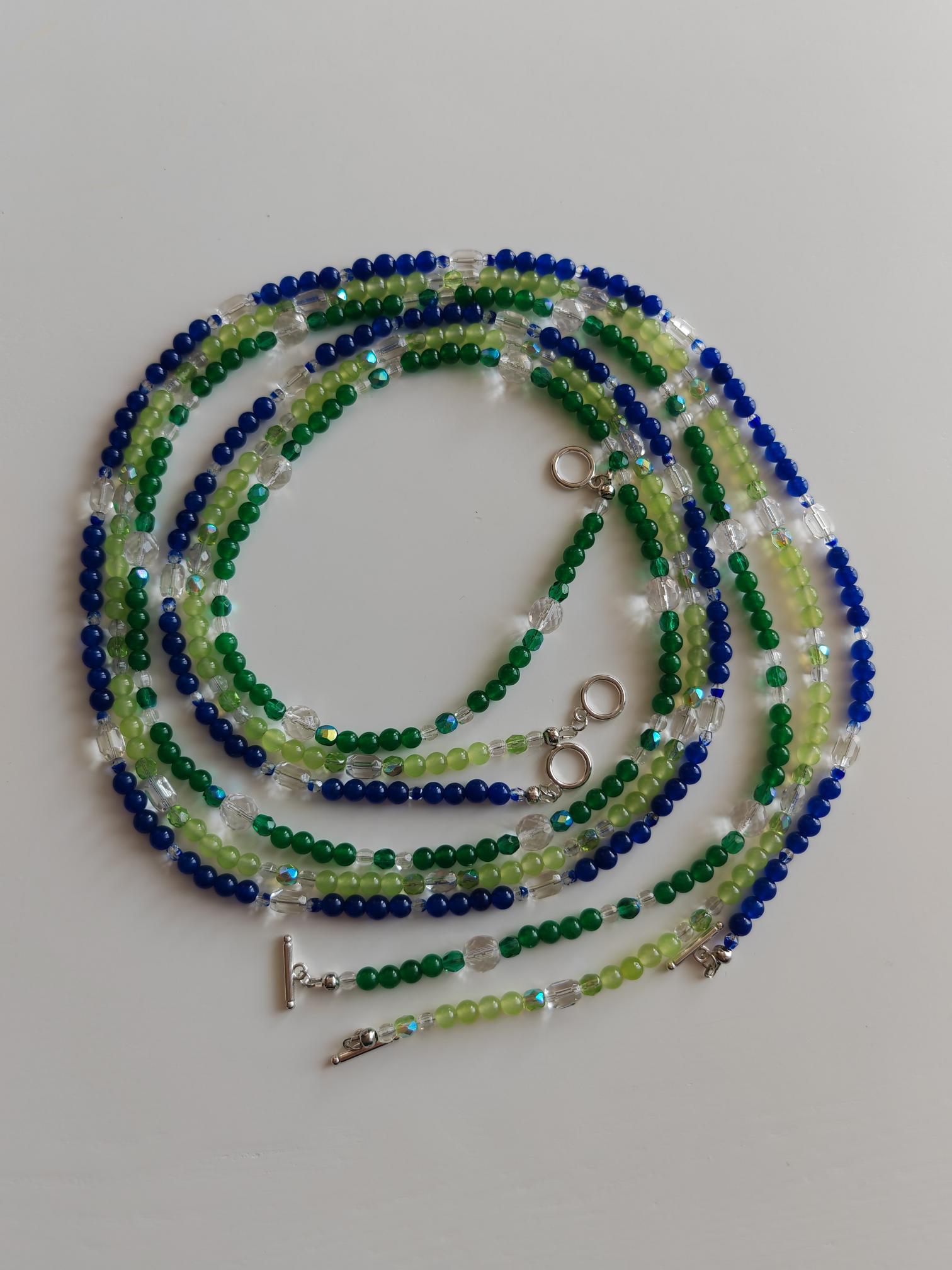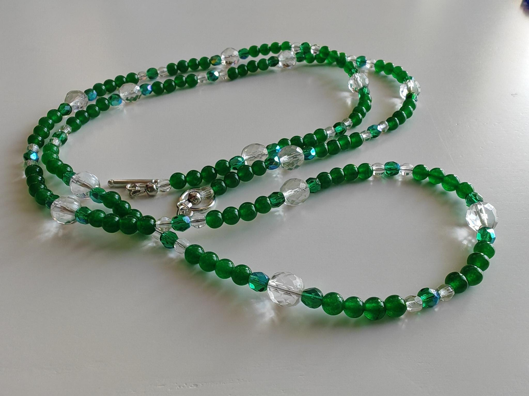The green necklace is approximately 113 cm long. The radiant necklace is made of dyed white jade beads (6 mm) and faceted Bohemian glass beads (clear 5 mm and 10 mm, and green 6 mm). The toggle clasp is silver. You can wear this delicate necklace in a variety of ways. You can wear it everyday as well as for special occasions.