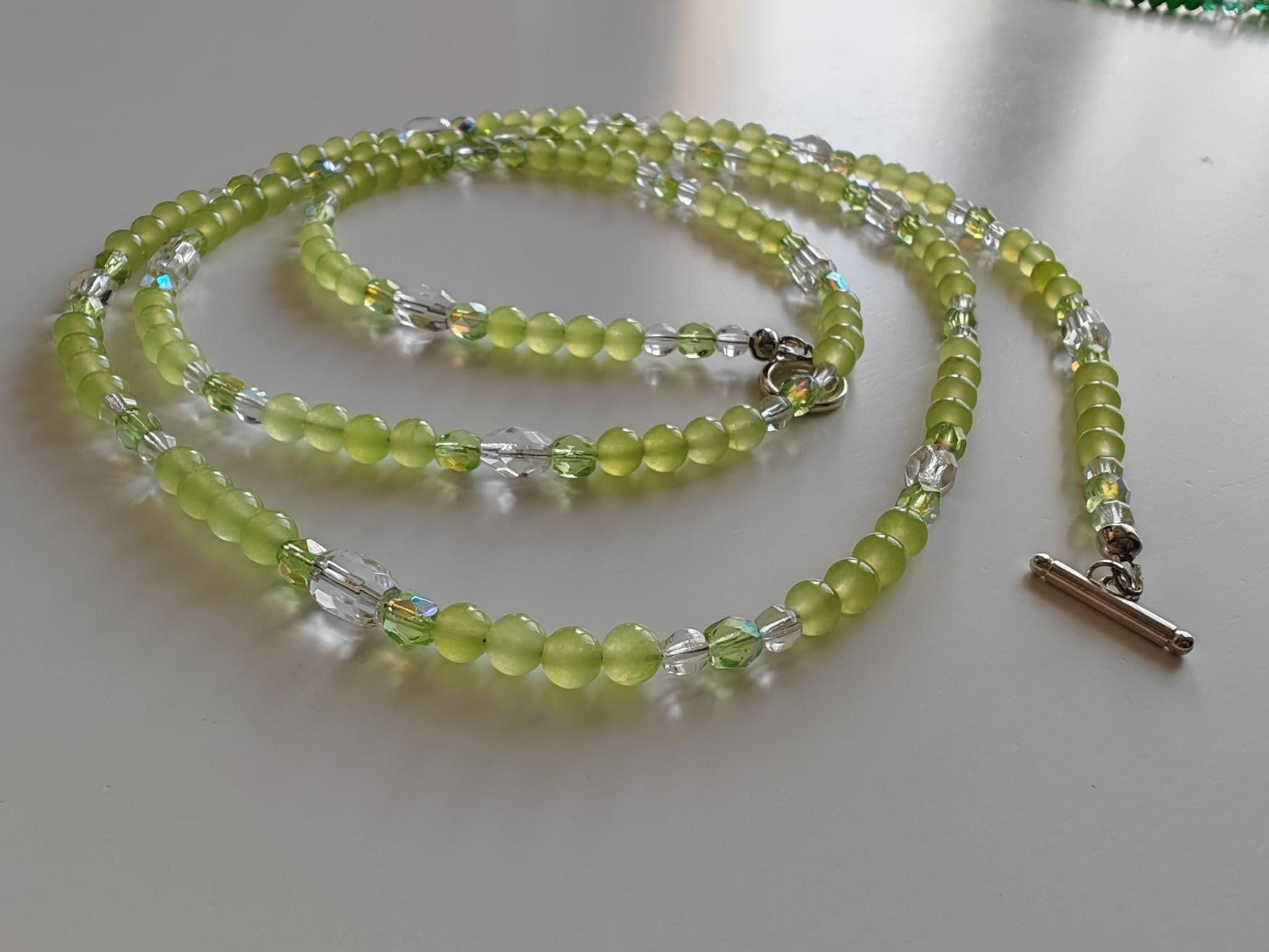 The apple-green necklace is approximately 113 cm long. The radiant necklace is made of dyed white jade beads (6 mm) and faceted Bohemian glass beads (5 mm clear, 10 mm x 7 mm barrel beads, and 6 mm green). The toggle clasp is silver. You can wear this delicate necklace in a variety of ways. You can wear it everyday as well as for special occasions.