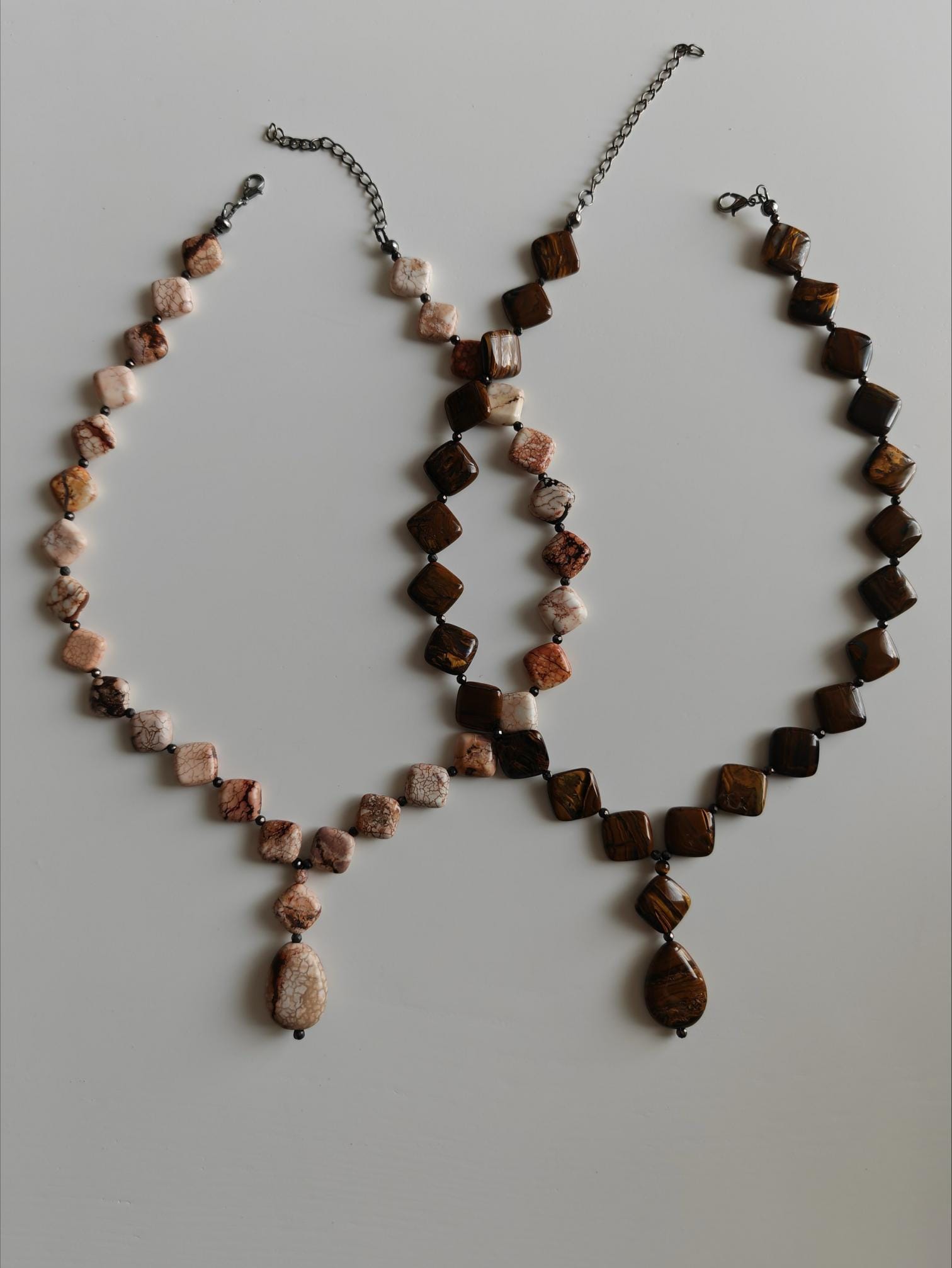 Handmade delicate necklaces with diamond-shaped beaded pendants. Two necklaces are available.