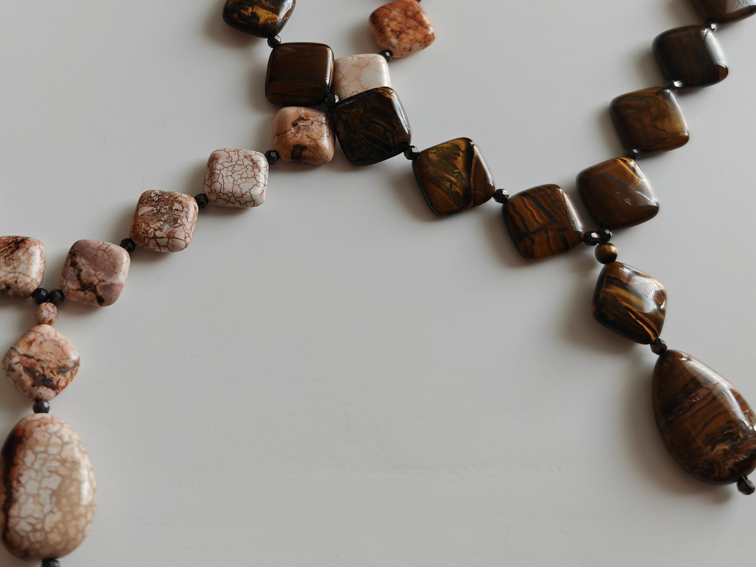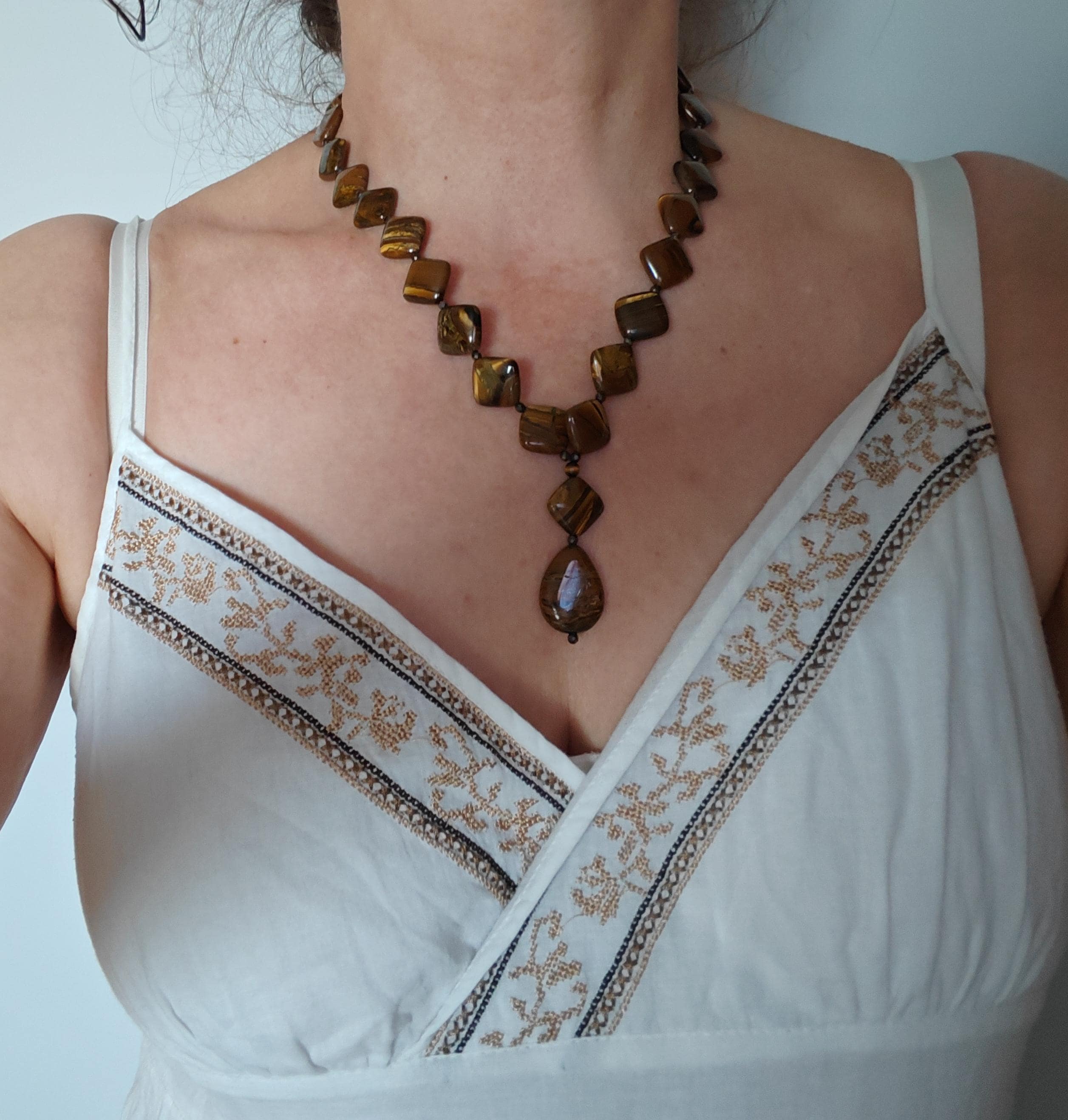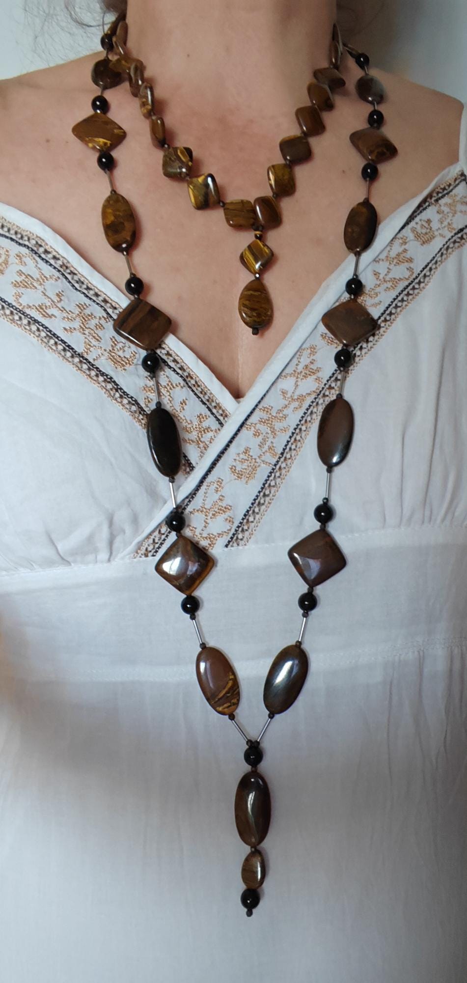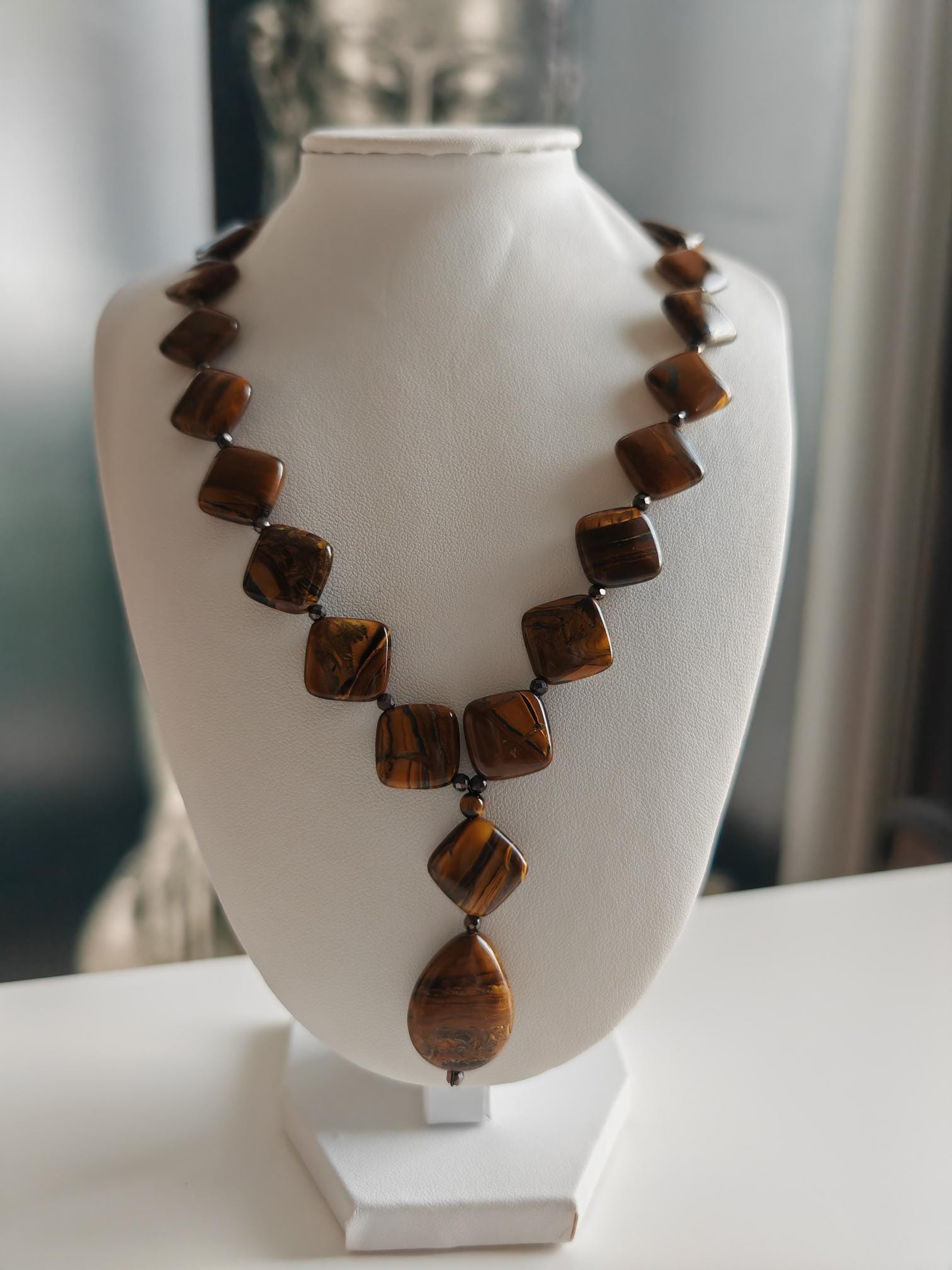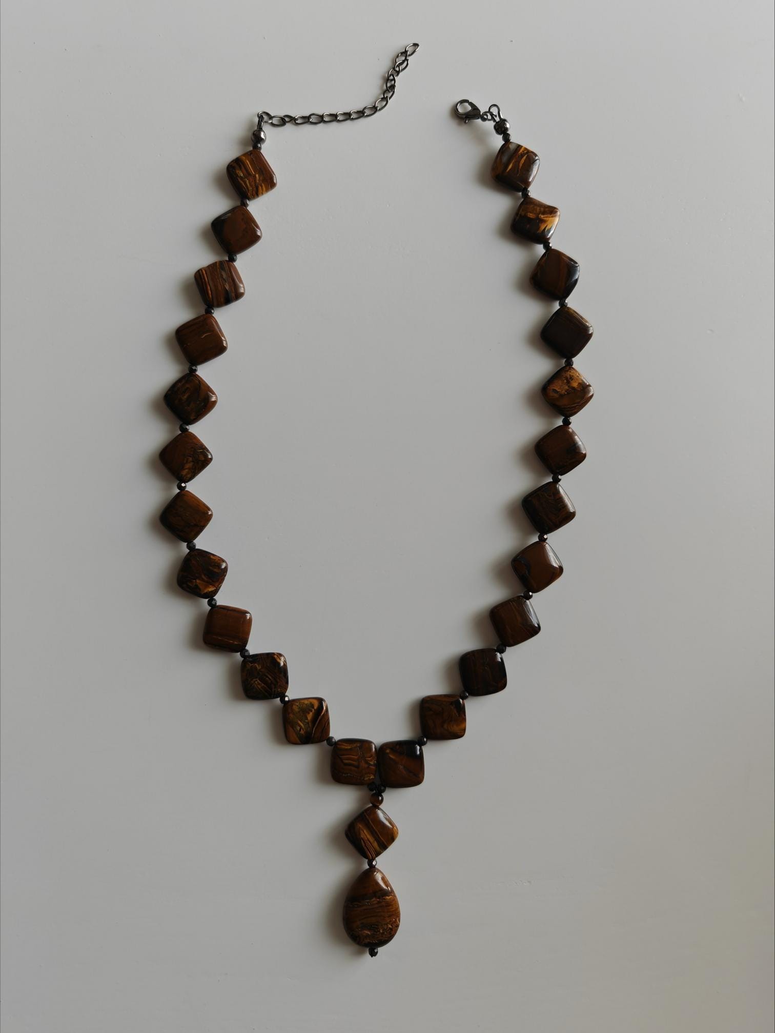 This brown and black tiger's eye necklace is approximately 48.5 cm long. The necklace is crafted from diamond-shaped tiger's eye beads (17 mm x 17 mm x 5 mm) and faceted black spinel beads (3 mm). The pendant is approximately 50 mm long and consists of one diamond-shaped bead and one teardrop-shaped bead (25 mm x 18 mm x 7 mm). The clasp and extension chain are black. You can wear this delicate necklace every day as well as for special occasions. It can be worn alone or combined with other necklaces.