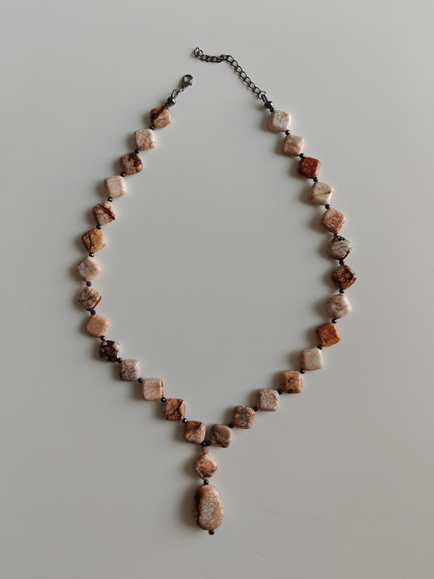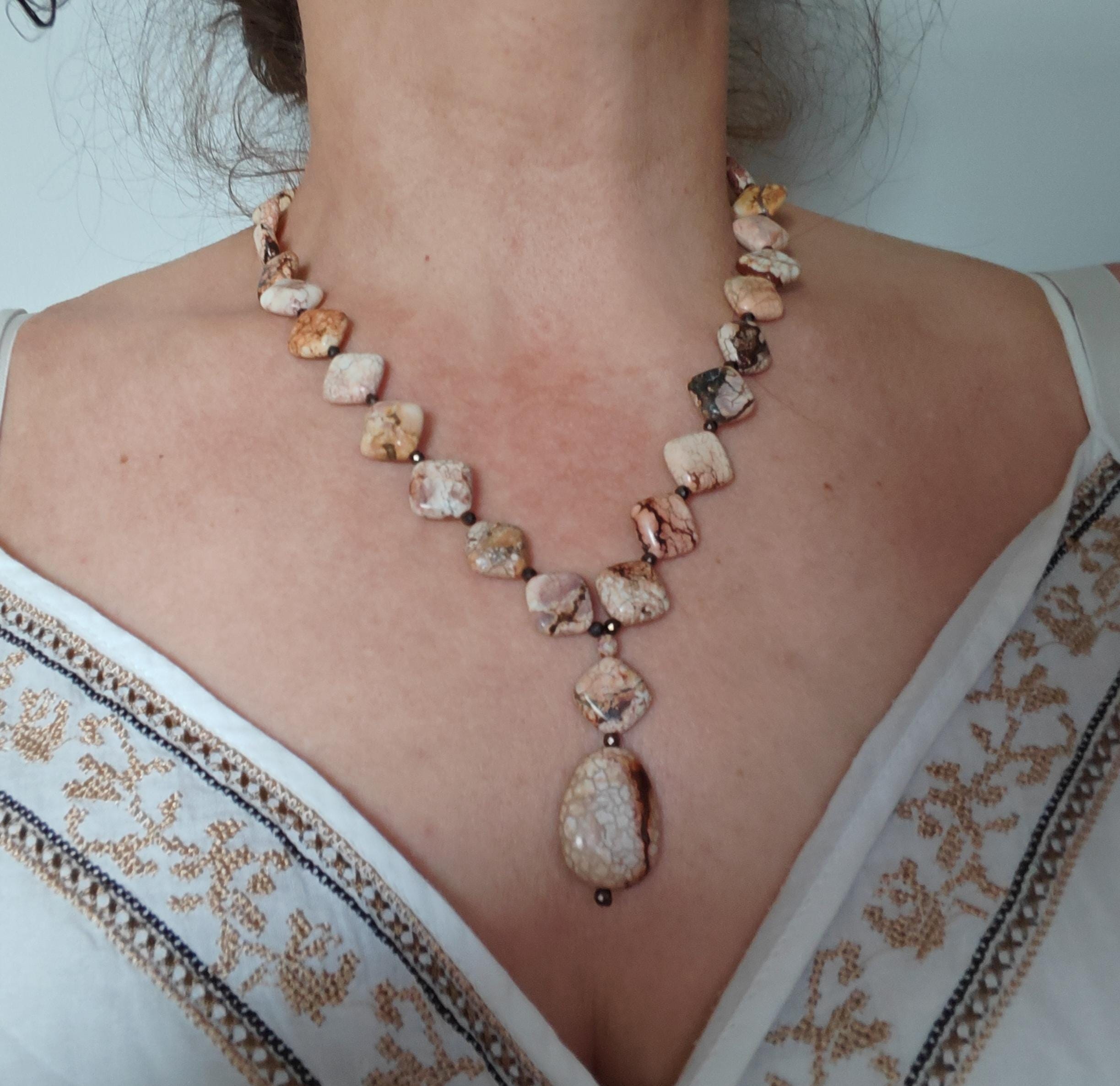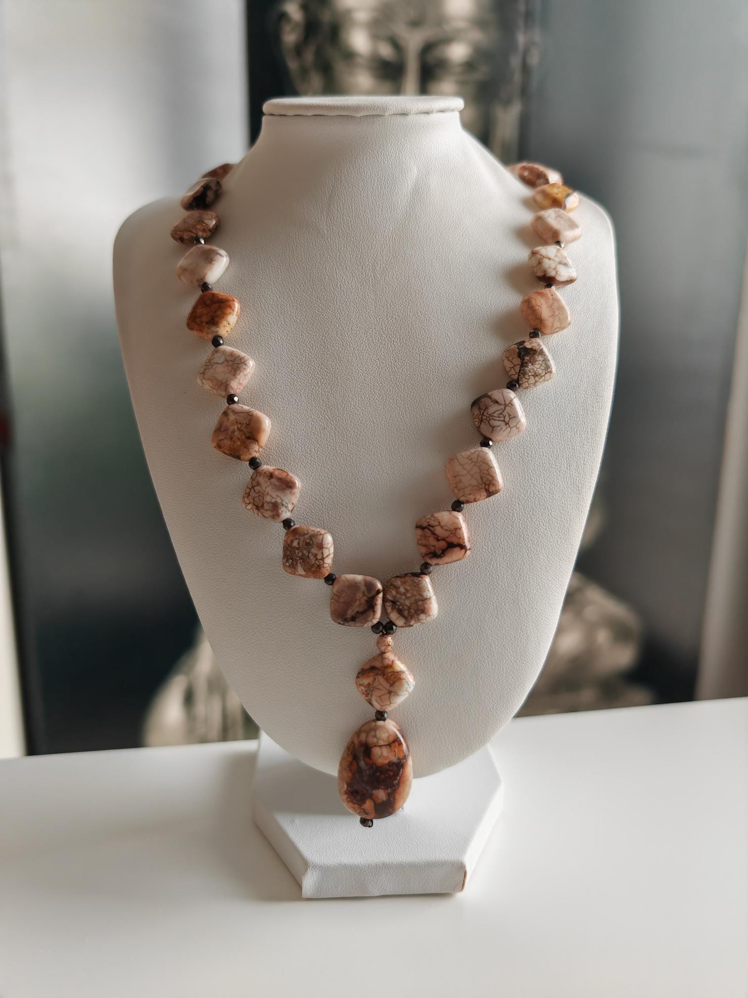 The Chrysopas necklace in beige/rose/brown/black is approximately 50 cm long. It is crafted from diamond-shaped Chrysopas beads (15 mm x 15 mm x 5 mm) and faceted black spinel beads (3 mm). The pendant is approximately 48 mm long and consists of one diamond-shaped bead and one teardrop-shaped bead (24 mm x 18 mm x 8 mm). The clasp and extension chain are black. You can wear this delicate necklace every day as well as for special occasions. It can be worn alone or combined with other necklaces.
