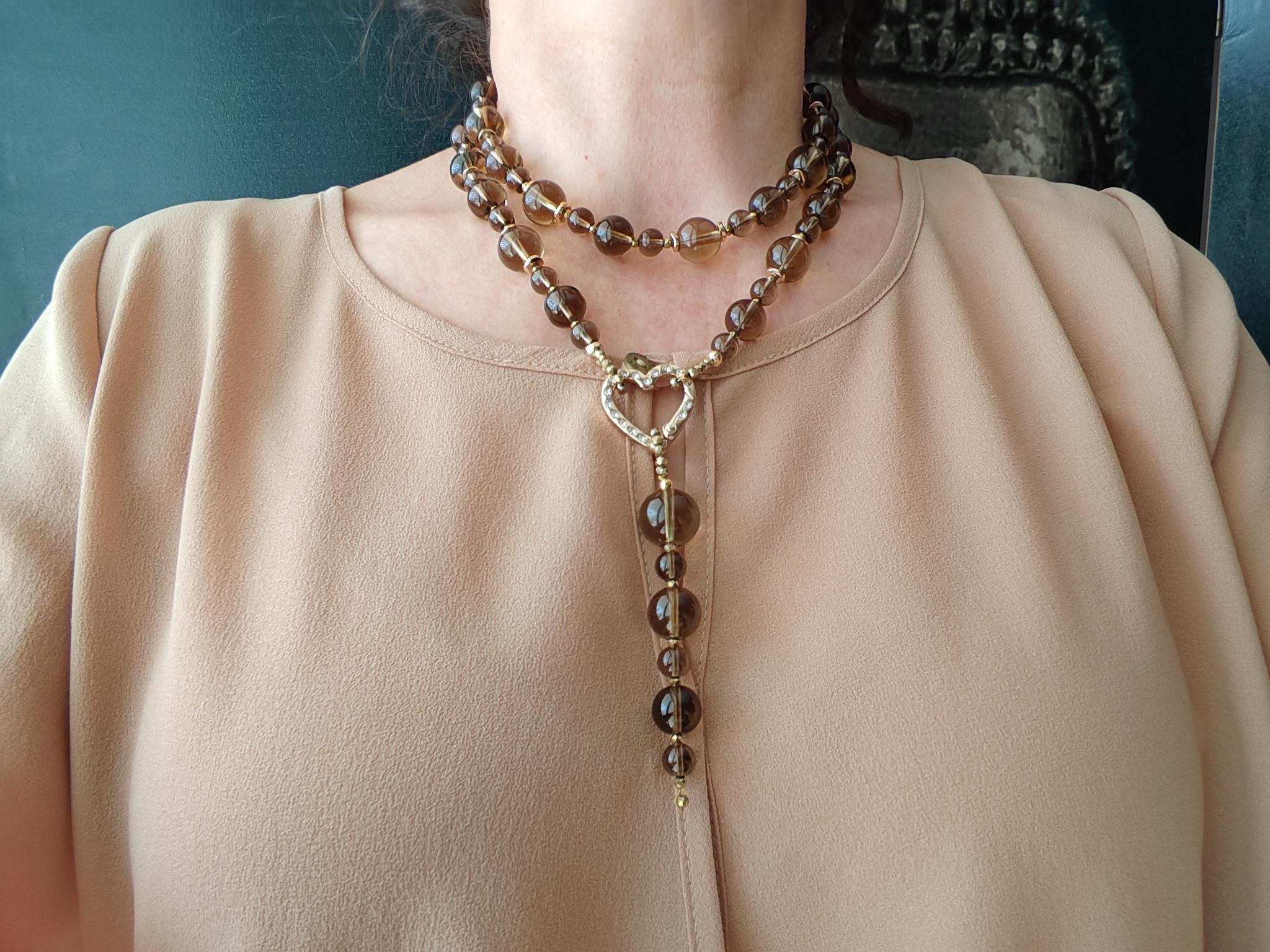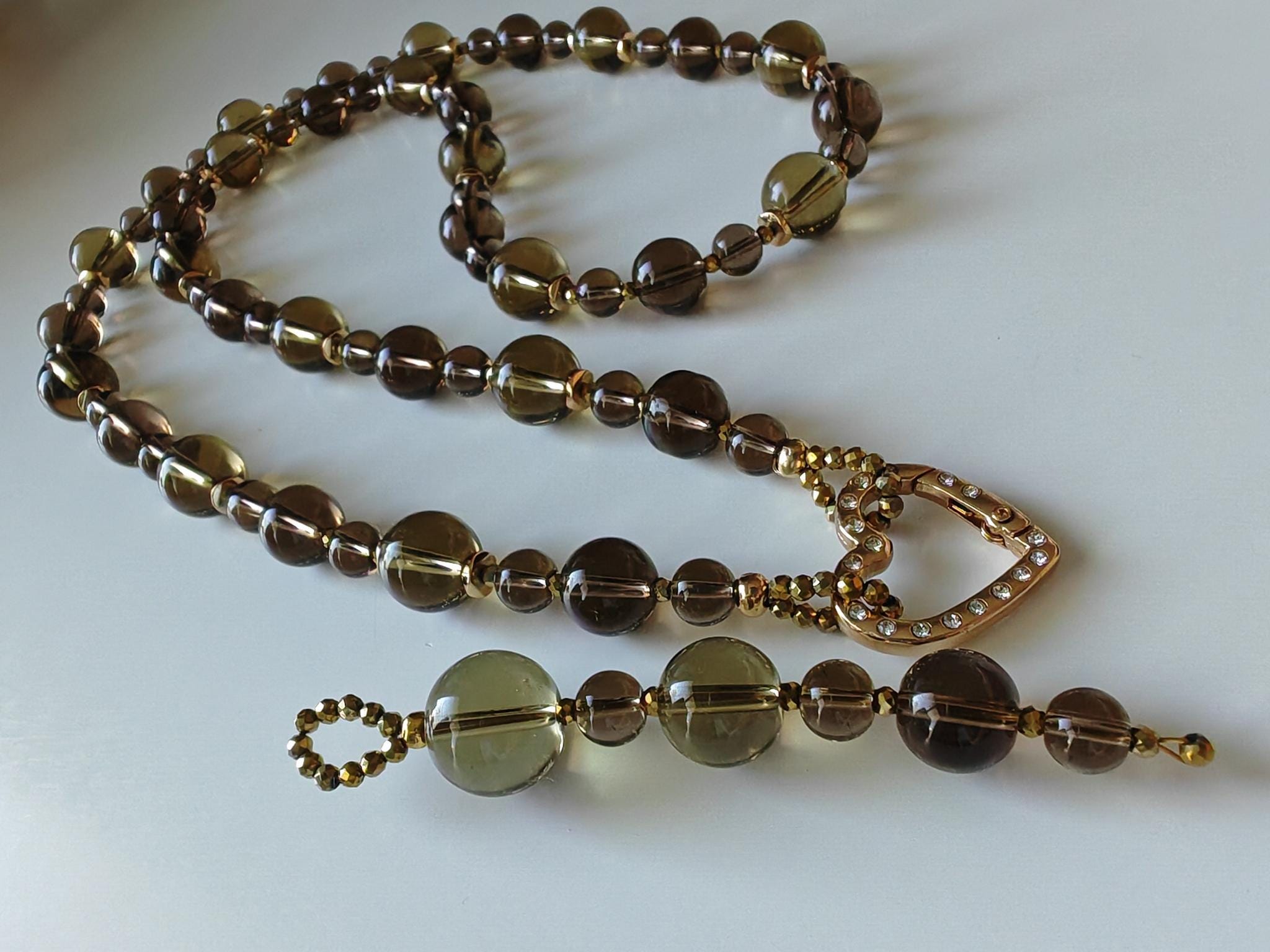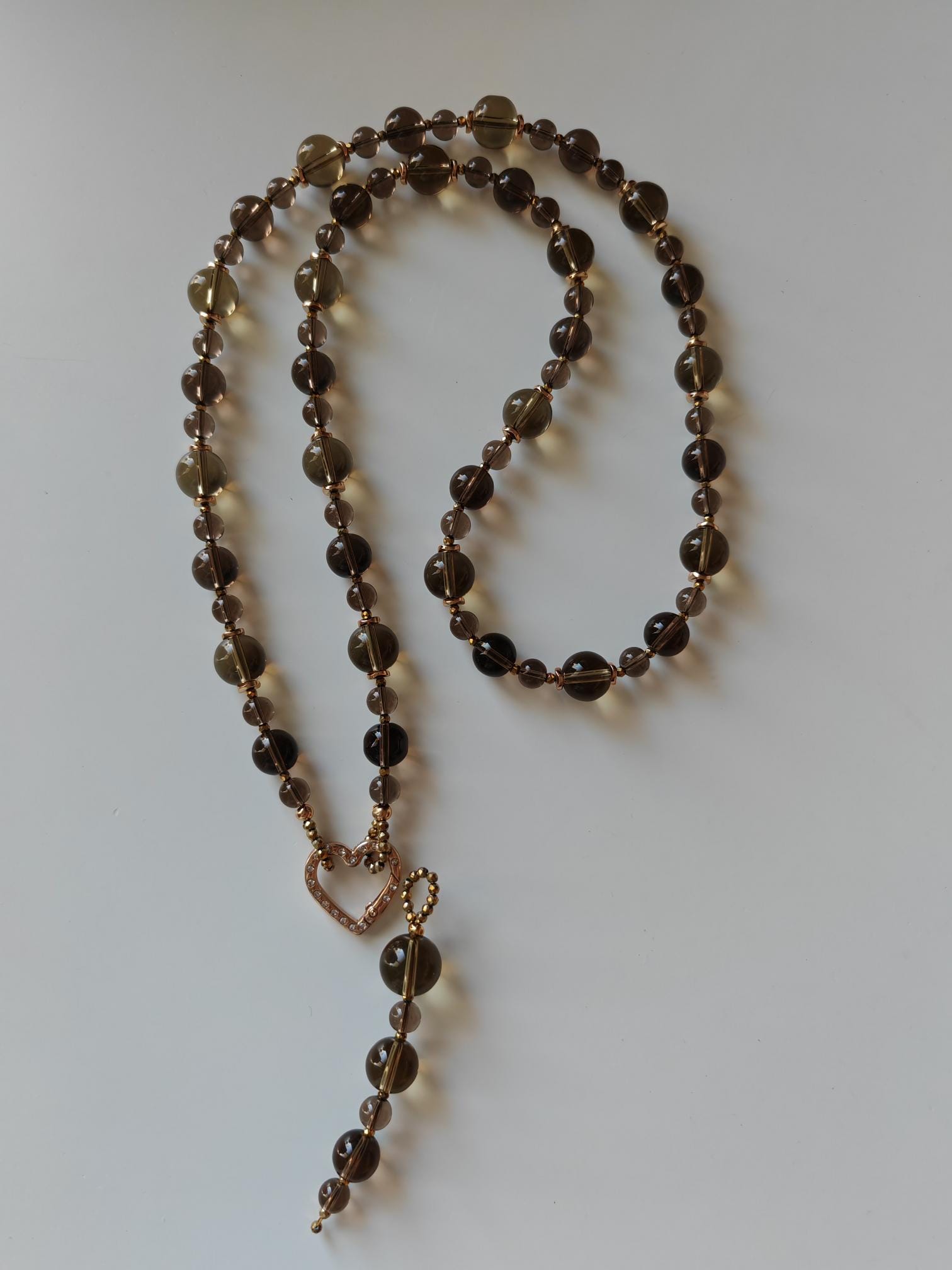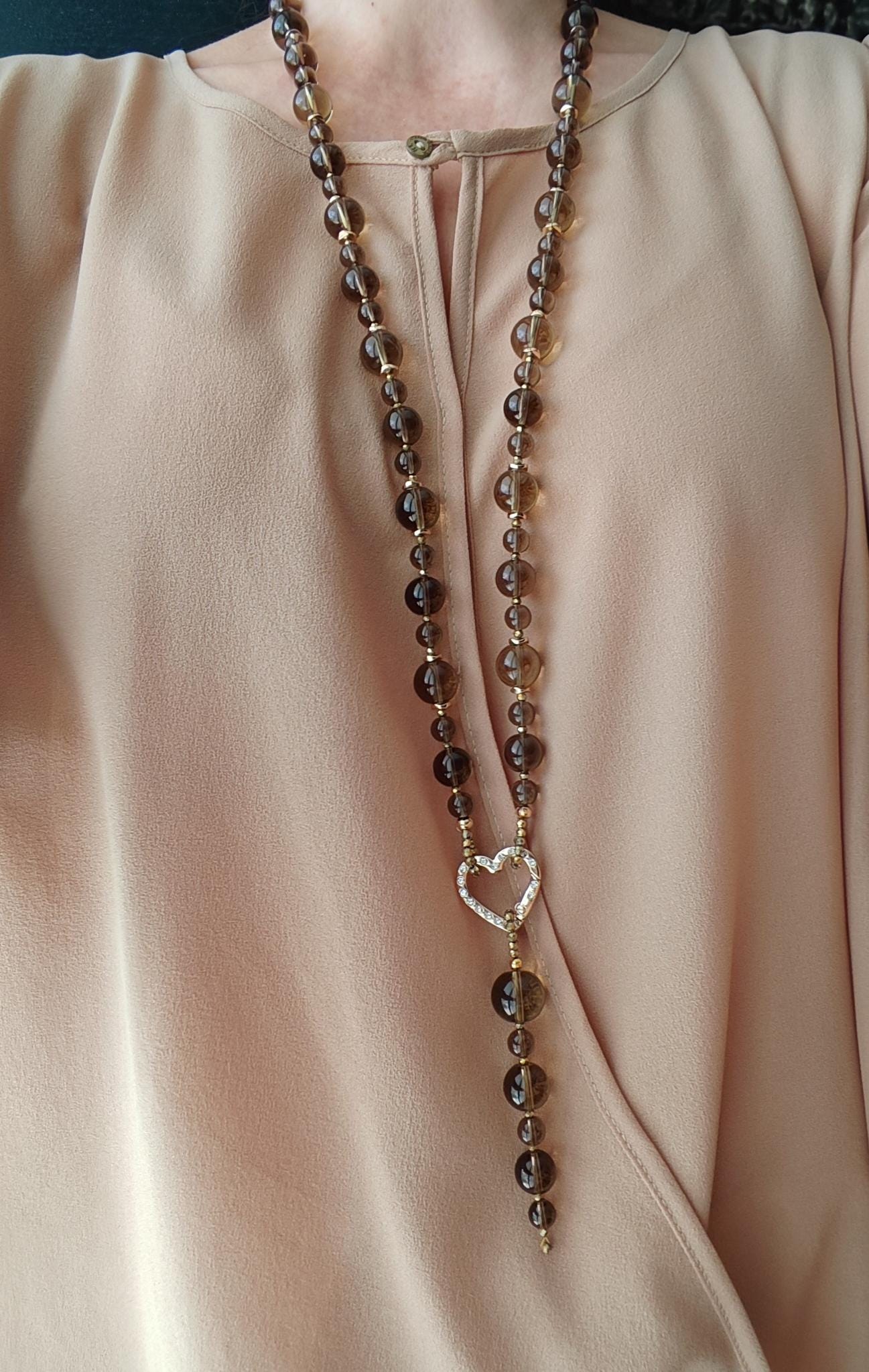 The long smoky quartz necklace with a detachable pendant is approximately 94 cm long. The gray-brown/gold piece is crafted from clear, round smoky quartz beads (14 mm, 12 mm, 8 mm), faceted gold spinel beads (3 mm), and curved gold hematite discs (6 mm). The pendant is approximately 95 mm long and is made from clear, round smoky quartz beads (16 mm, 14 mm, 12 mm, 8 mm) and faceted gold spinel beads (3 mm). The heart-shaped clasp (25 mm x 25 mm x 4 mm) is gold. You have the option of wearing this elegant necklace in various ways (see photos), both in everyday life and for special occasions. Or in combination with other necklaces.