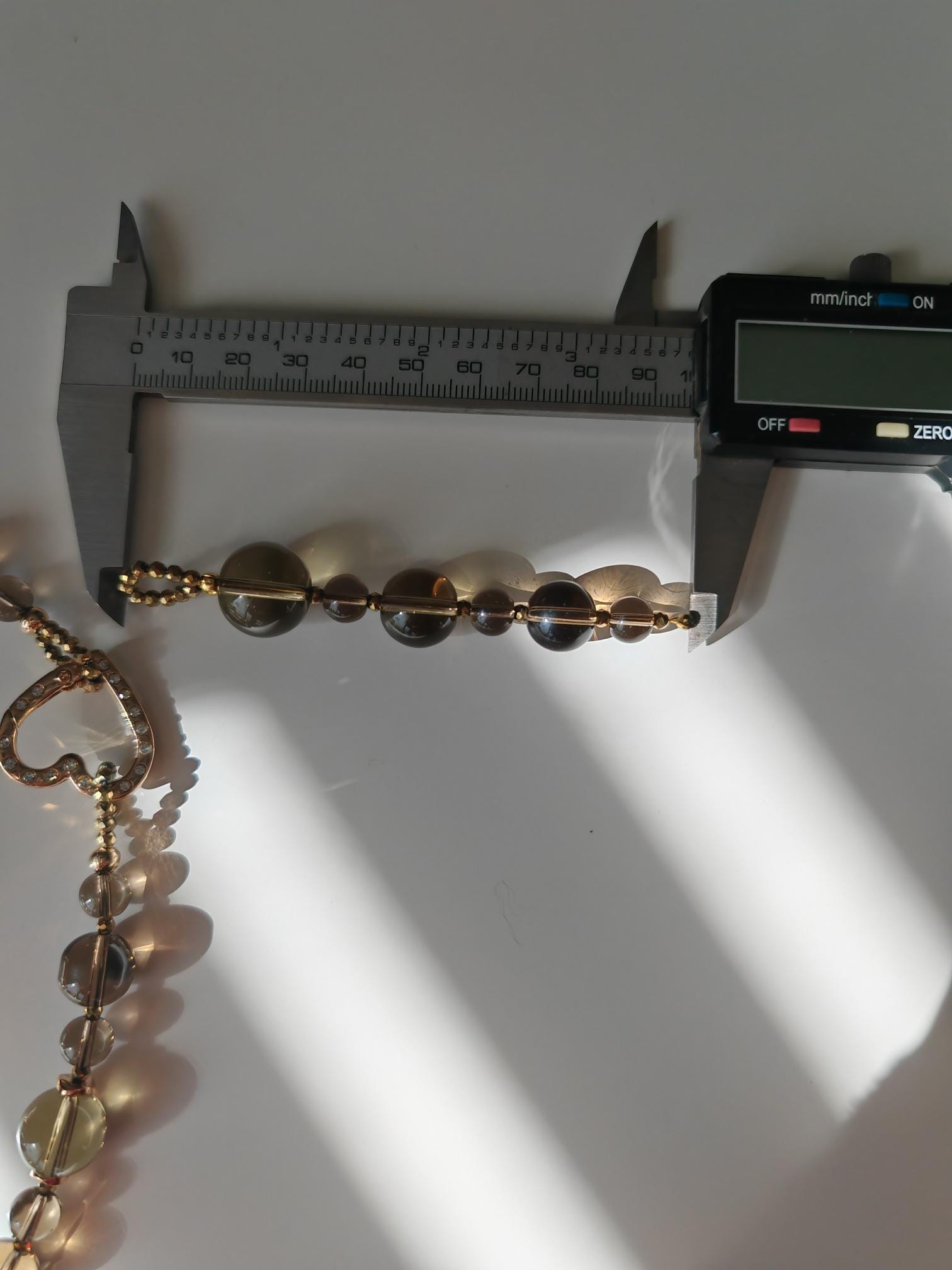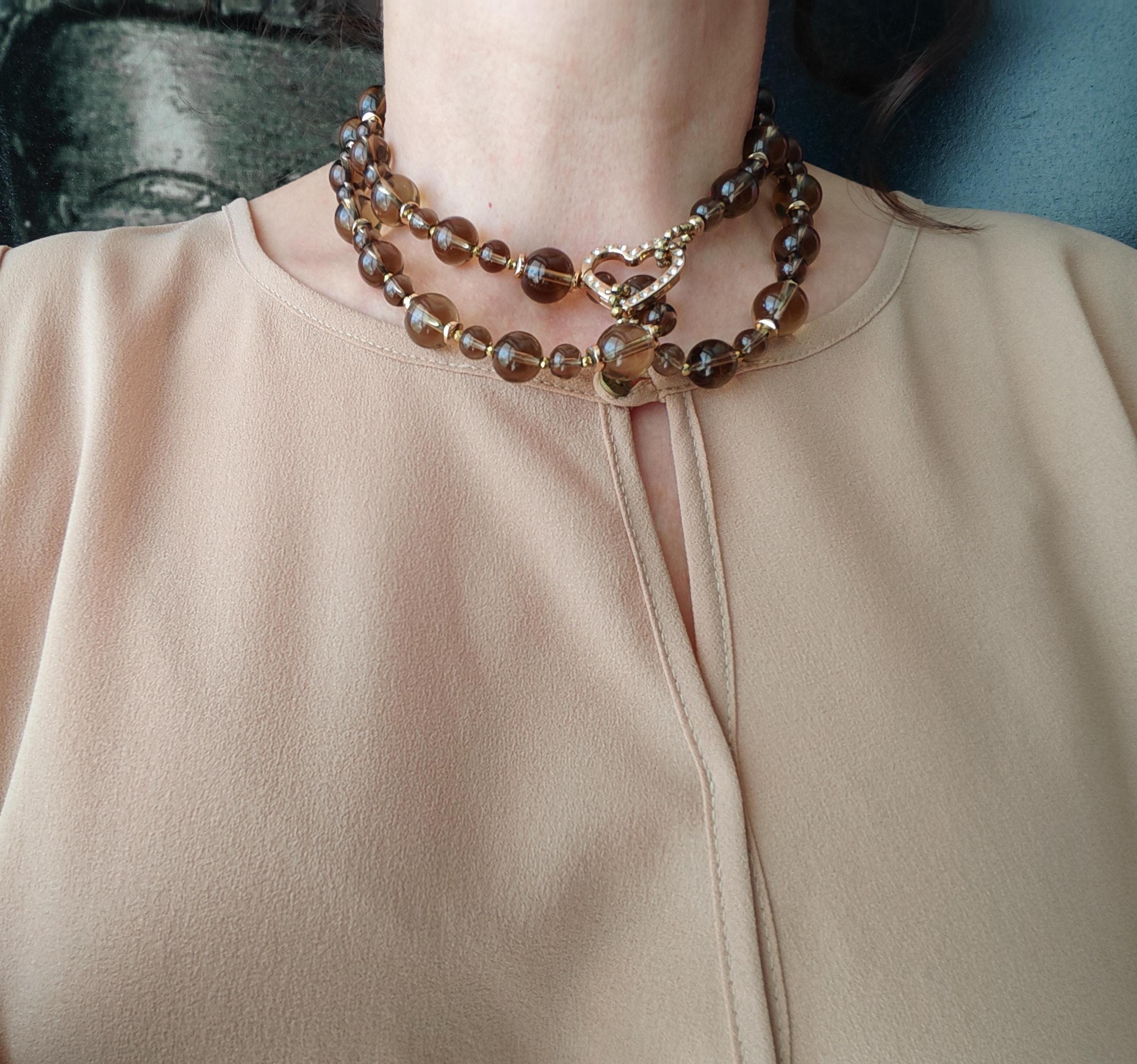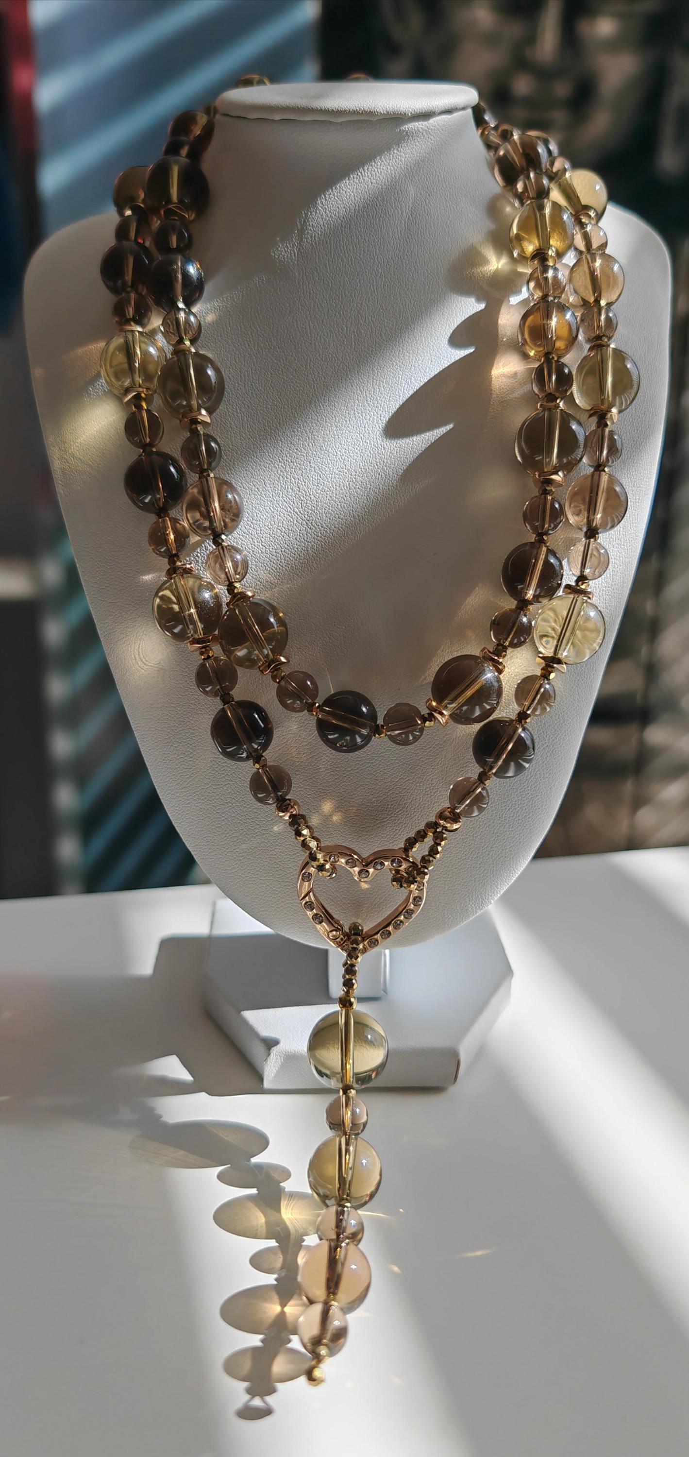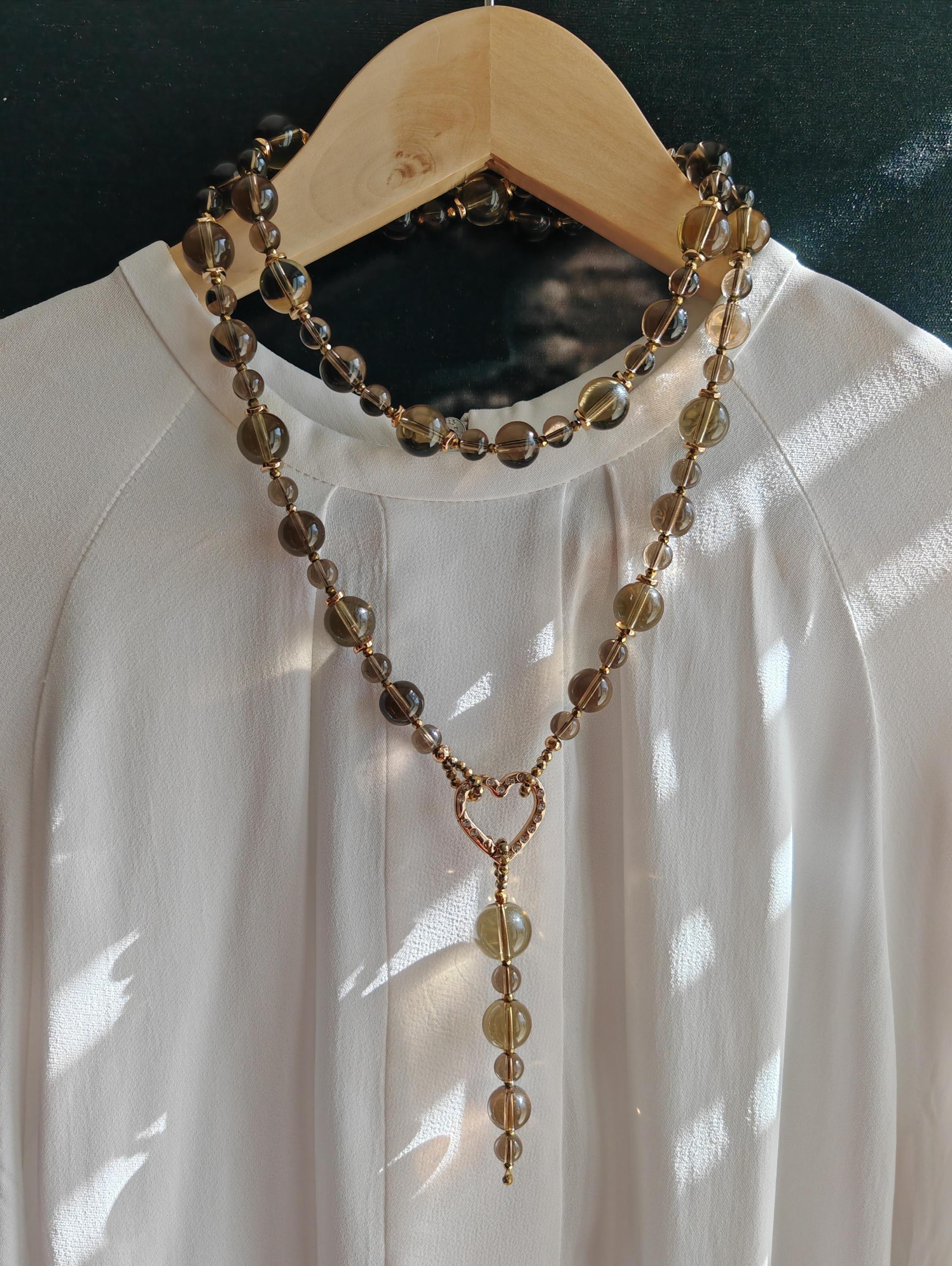The long smoky quartz necklace with a detachable pendant is approximately 94 cm long. The gray-brown/gold piece is crafted from clear, round smoky quartz beads (14 mm, 12 mm, 8 mm), faceted gold spinel beads (3 mm), and curved gold hematite discs (6 mm). The pendant is approximately 95 mm long and is made from clear, round smoky quartz beads (16 mm, 14 mm, 12 mm, 8 mm) and faceted gold spinel beads (3 mm). The heart-shaped clasp (25 mm x 25 mm x 4 mm) is gold. You have the option of wearing this elegant necklace in various ways (see photos), both in everyday life and for special occasions. Or in combination with other necklaces.