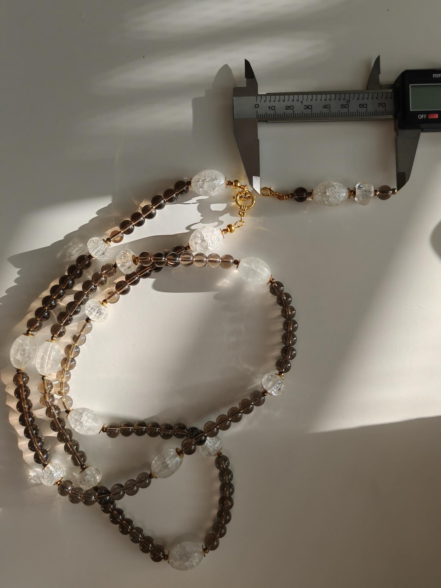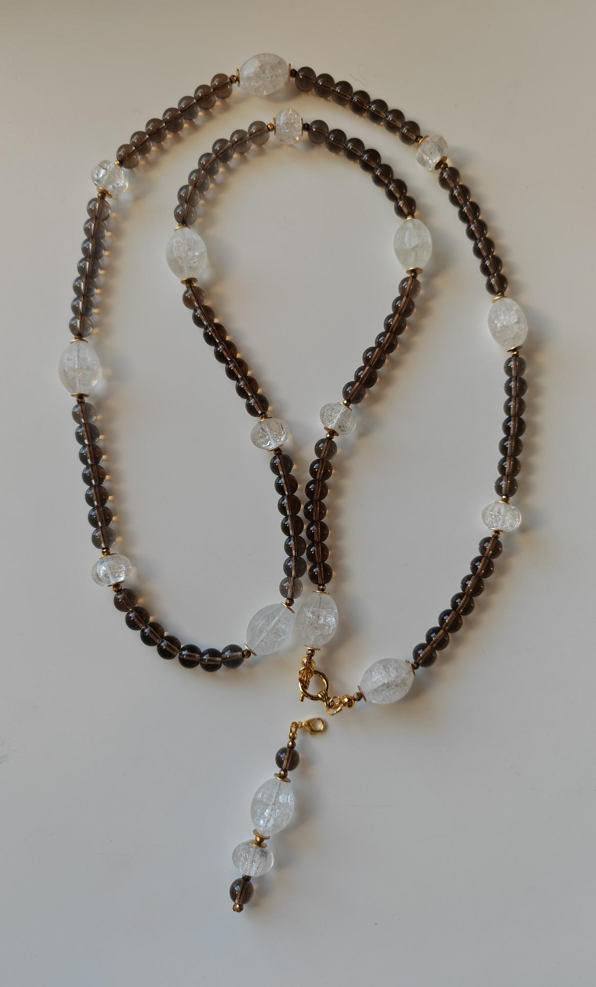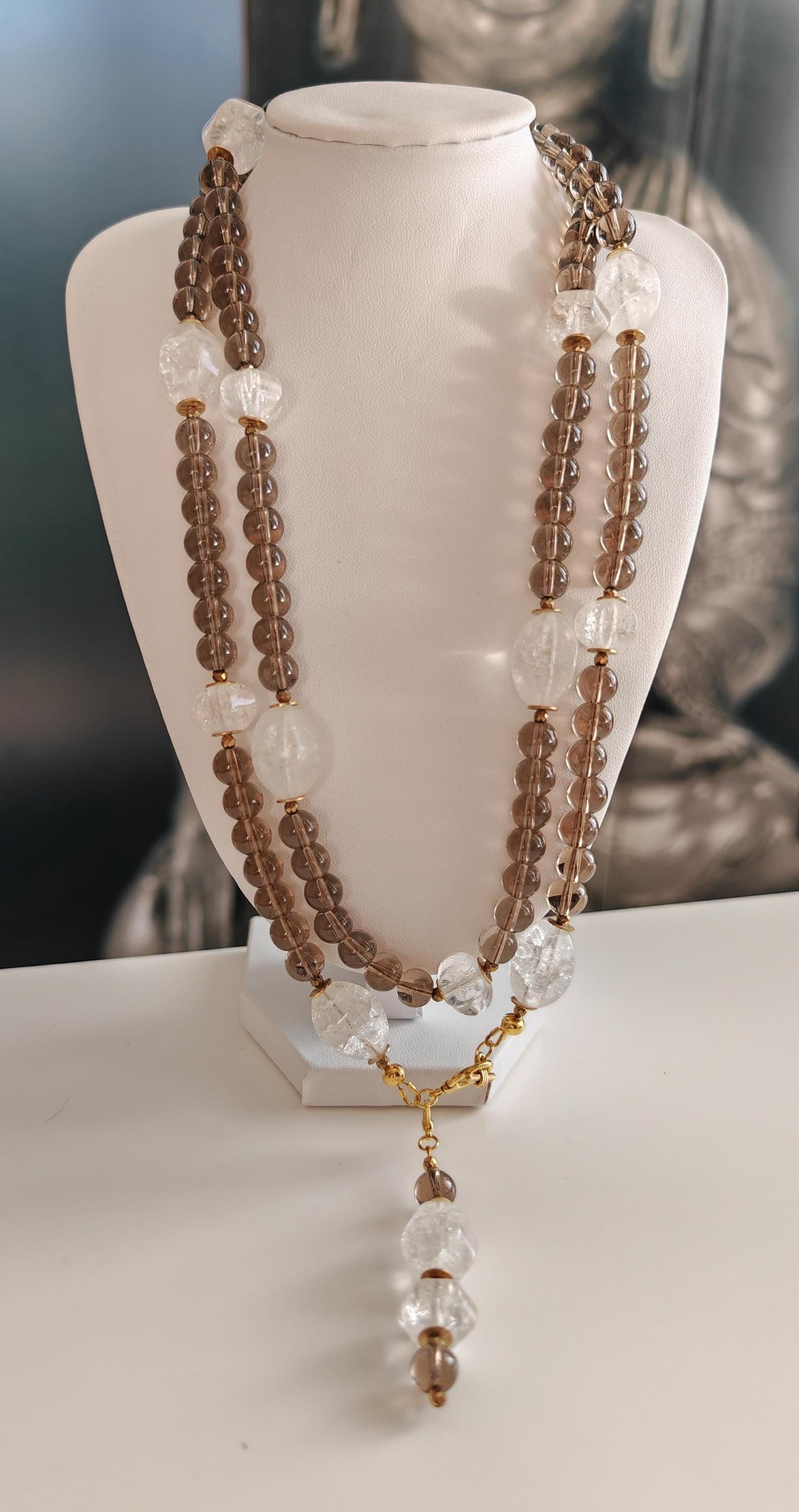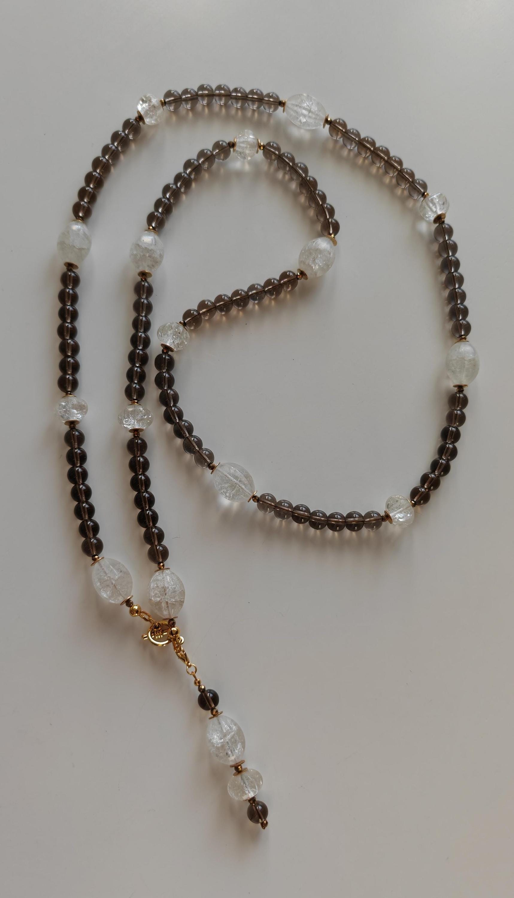 This long smoky quartz necklace with rock crystal is approximately 106 cm long and also features a detachable pendant. The gray-brown necklace is crafted from clear, round smoky quartz beads (8 mm), cracked rock crystal beads (olive beads 18 mm x 14 mm, hexagonal rondelles 12 mm x 10 mm), and faceted spinel beads in gold (3 mm). The pendant is approximately 75 mm long and is made from clear, round smoky quartz beads (8 mm), cracked rock crystal beads, and faceted spinel beads in gold (3 mm). The clasp and metal discs (6 mm) are gold-colored. You have the option of wearing this necklace in various ways (see photos), both in everyday life and for special occasions. Or in combination with other necklaces. Elegant and timeless!