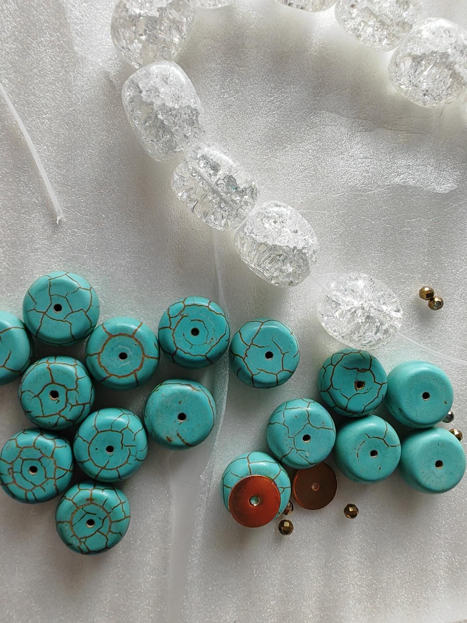This short, two-tone necklace is 60 cm long, plus an extension chain. The pendant is 35 mm long. The elegant necklace is crafted from cracked rock crystal beads (15 mm x 12 mm cubes, 4 mm round beads), turquoise howlite coins (14 mm x 7 mm), and faceted gold spinel beads (3 mm). The round turquoise pendant bead is 30 mm. The clasp, extension chain, and disc-shaped metal beads (10 mm and 6 mm) are gold-colored.