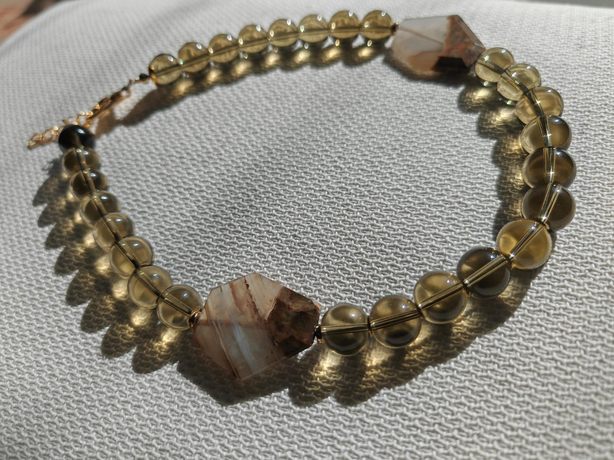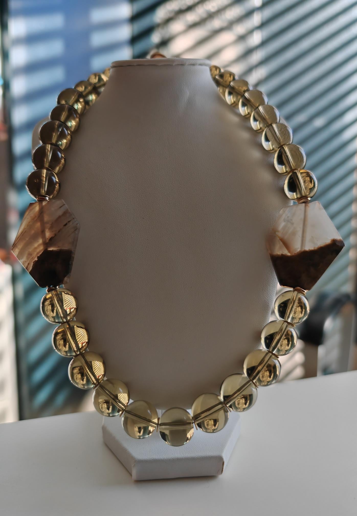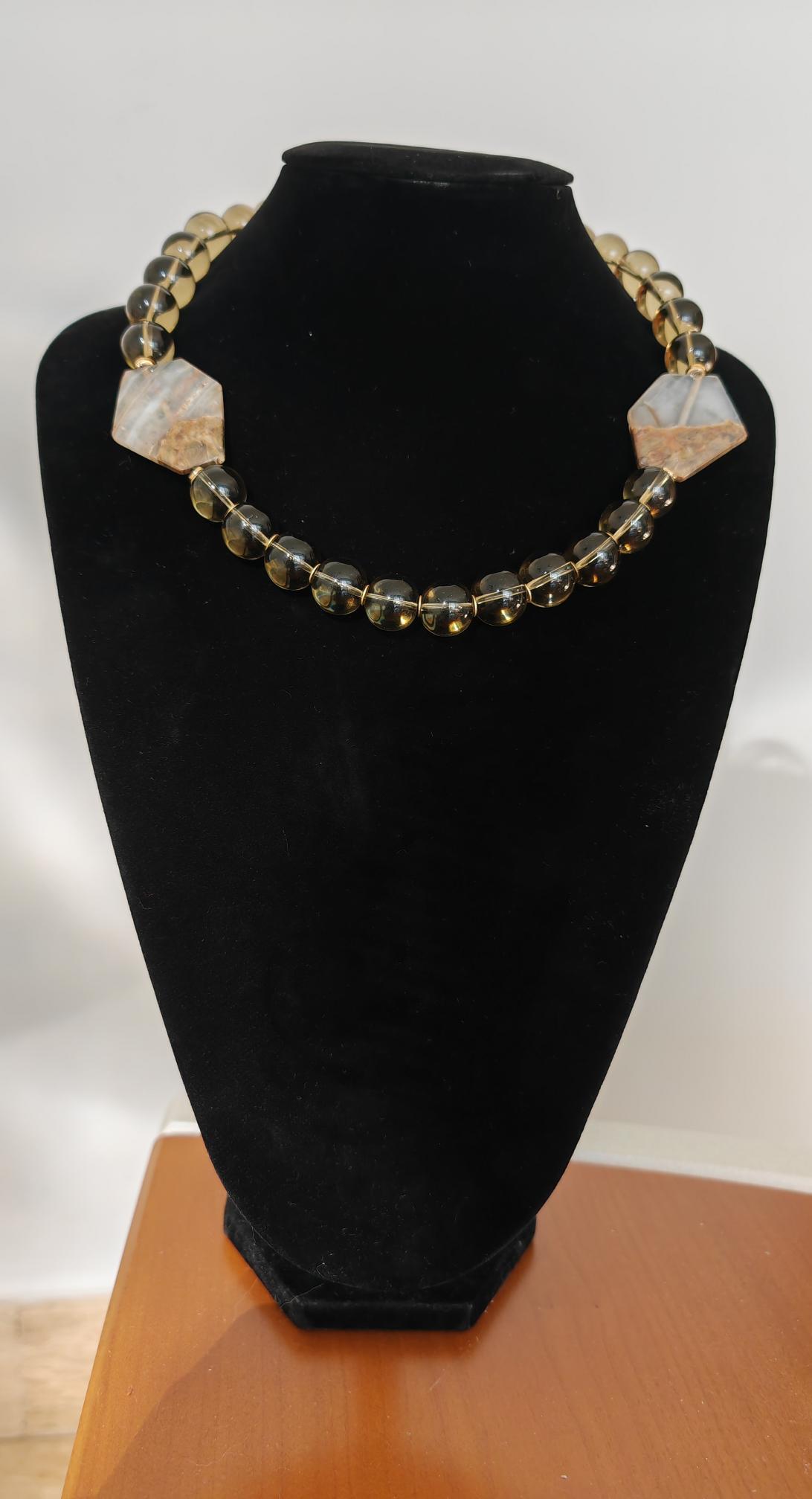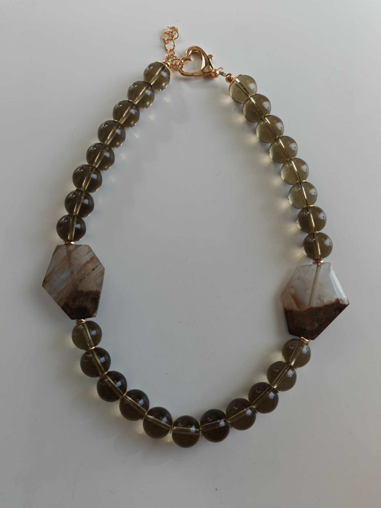 Handmade solid smoky quartz necklace with two large stones. The necklace length is 57 cm plus a 4.5 cm extension chain. This statement necklace in gray-brown is crafted from large, round smoky quartz beads (16 mm). Two large (approx. 40 mm x 35 mm x 7 mm) hexagonal agate stones in beige/brown are incorporated into the necklace. The heart-shaped clasp, extension chain, bead caps, curved hematite discs (approx. 5 mm), and metal beads (6 mm discs) are gold-colored. A beautiful Mother's Day gift!