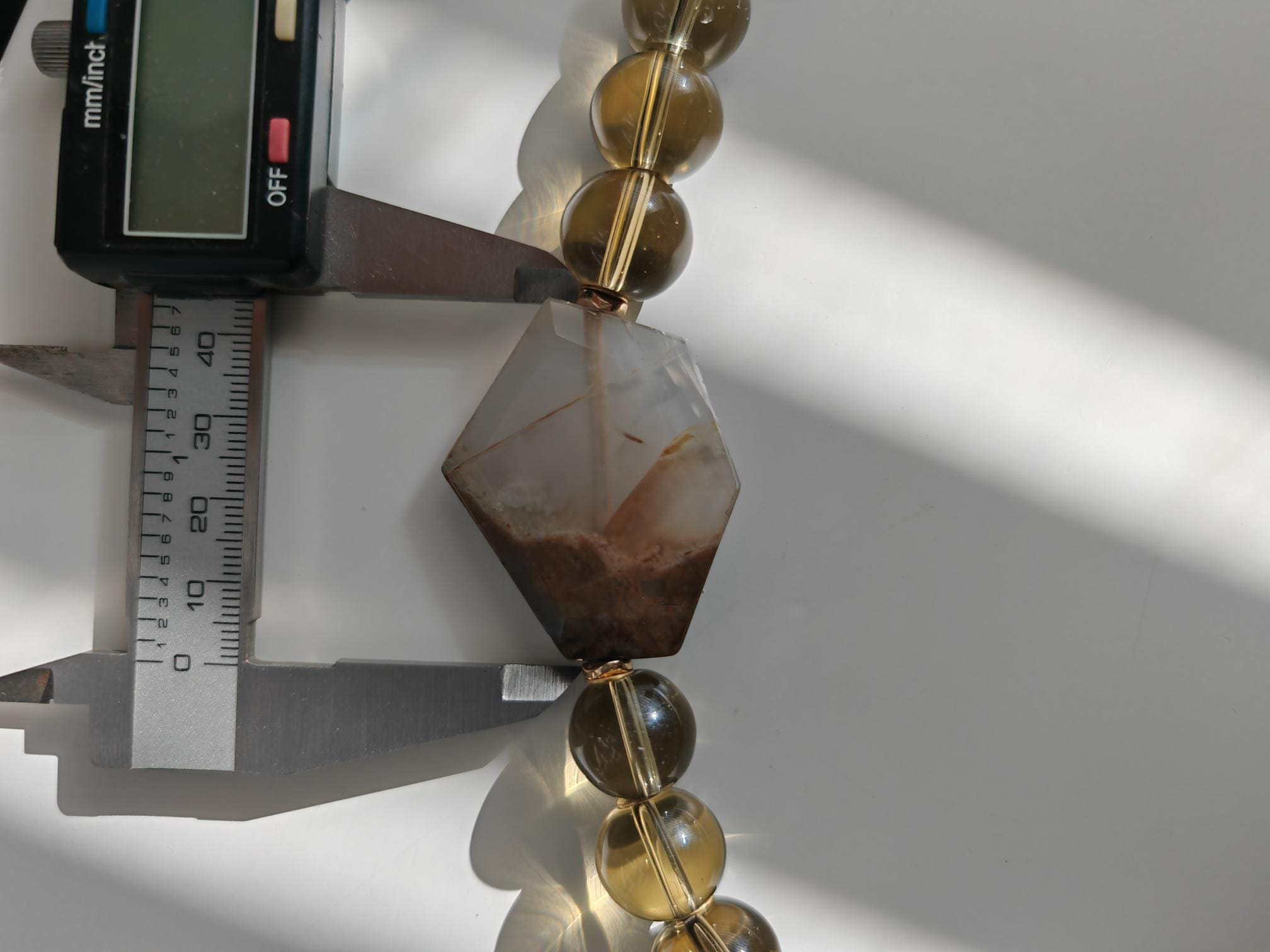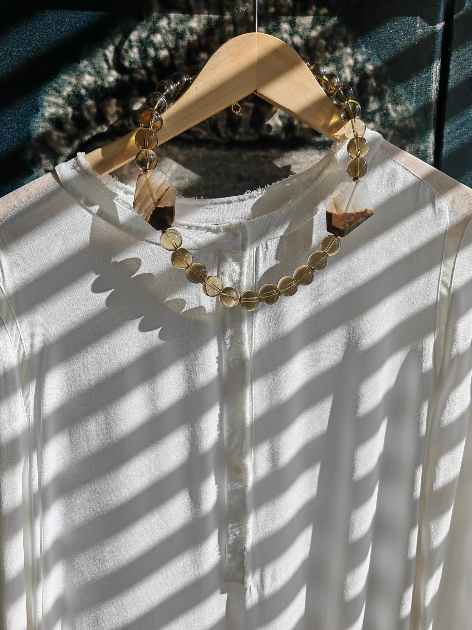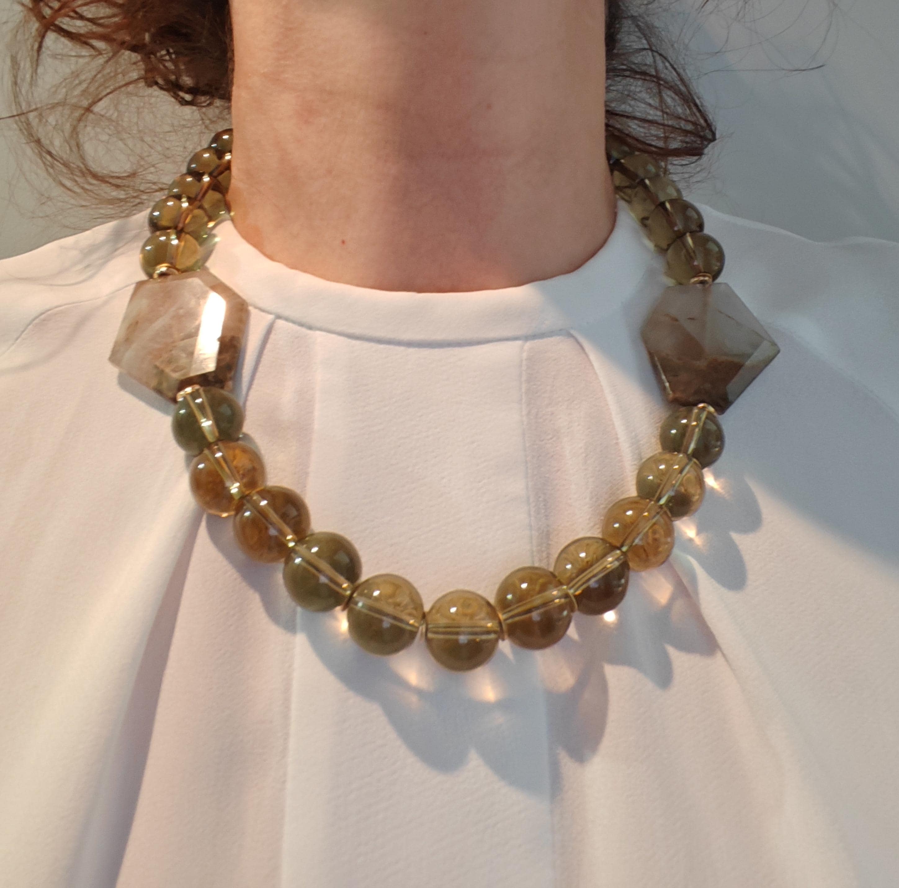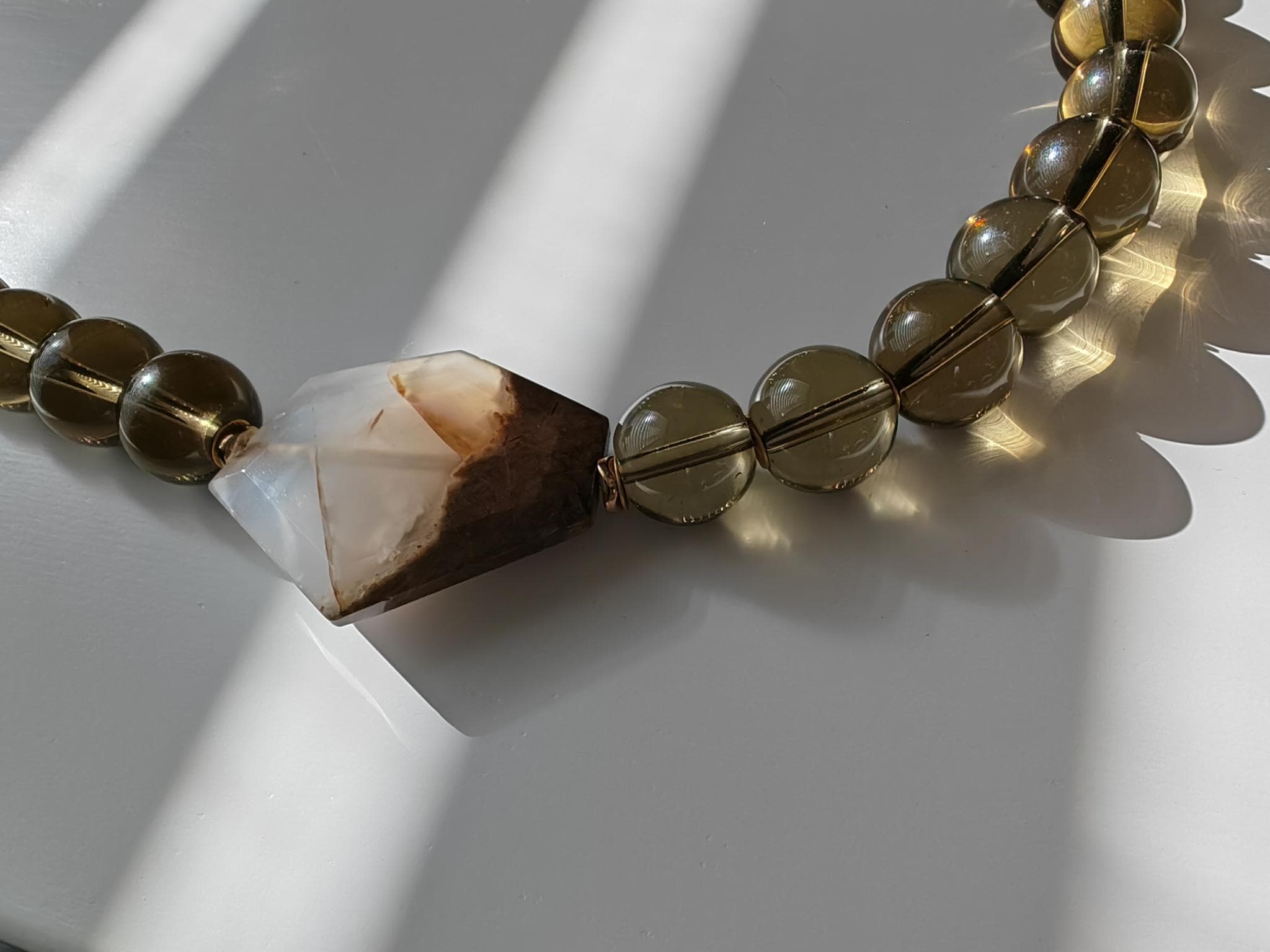Handmade solid smoky quartz necklace with two large stones. The necklace length is 57 cm plus a 4.5 cm extension chain. This statement necklace in gray-brown is crafted from large, round smoky quartz beads (16 mm). Two large (approx. 40 mm x 35 mm x 7 mm) hexagonal agate stones in beige/brown are incorporated into the necklace. The heart-shaped clasp, extension chain, bead caps, curved hematite discs (approx. 5 mm), and metal beads (6 mm discs) are gold-colored. A beautiful Mother's Day gift!