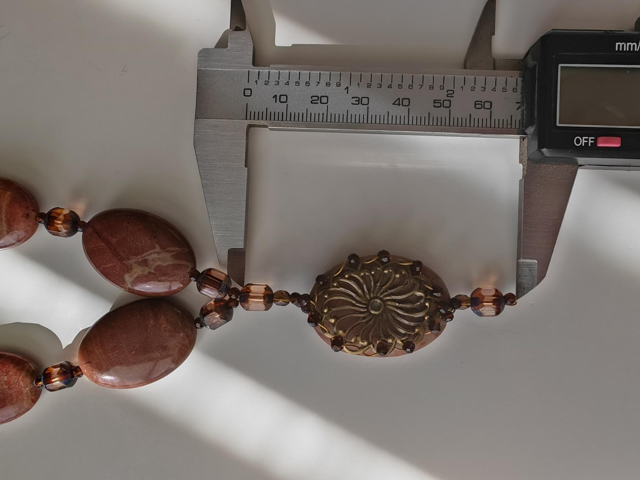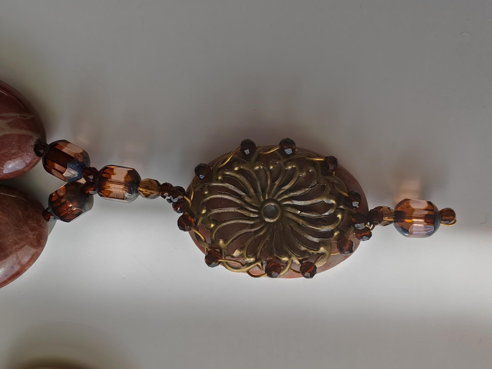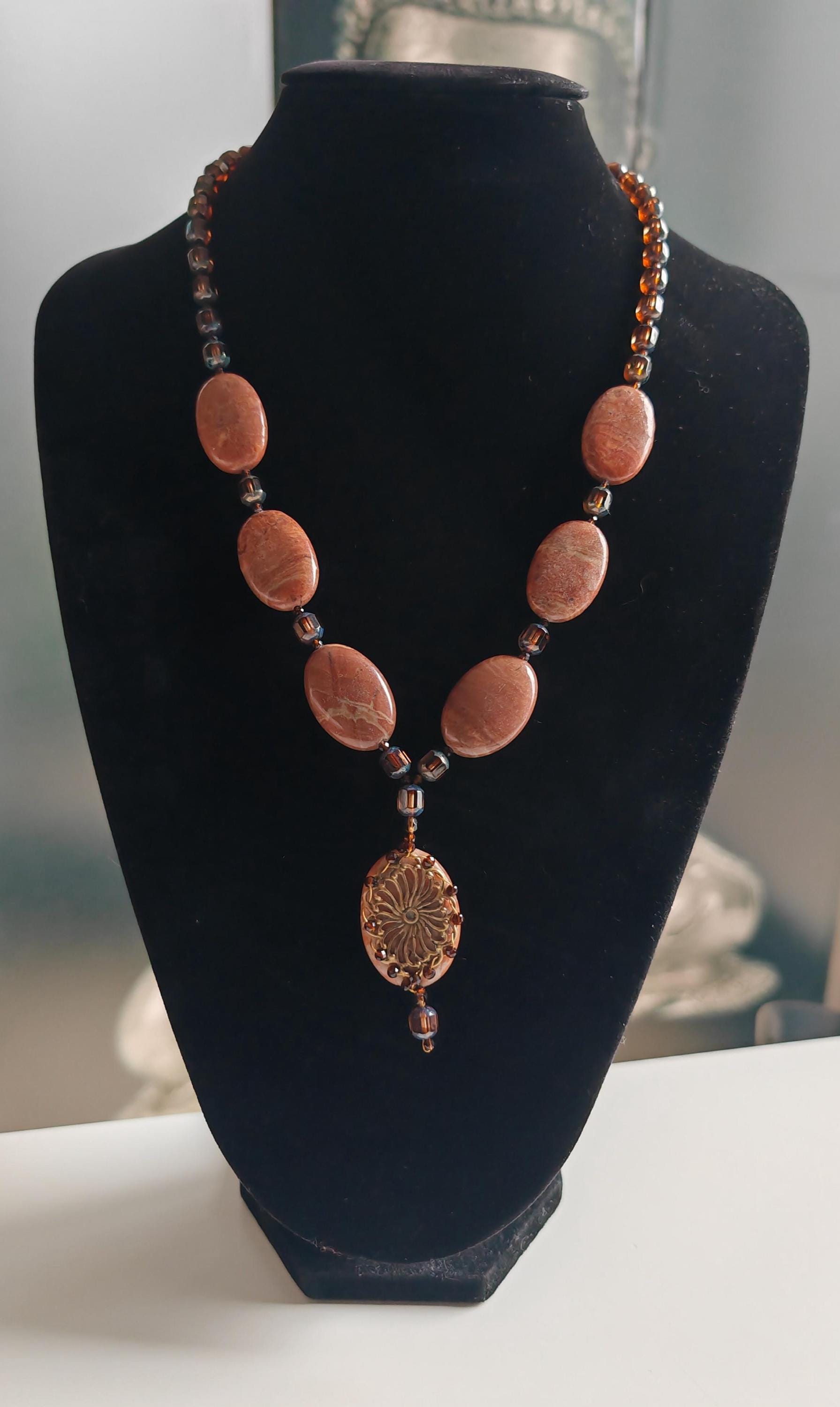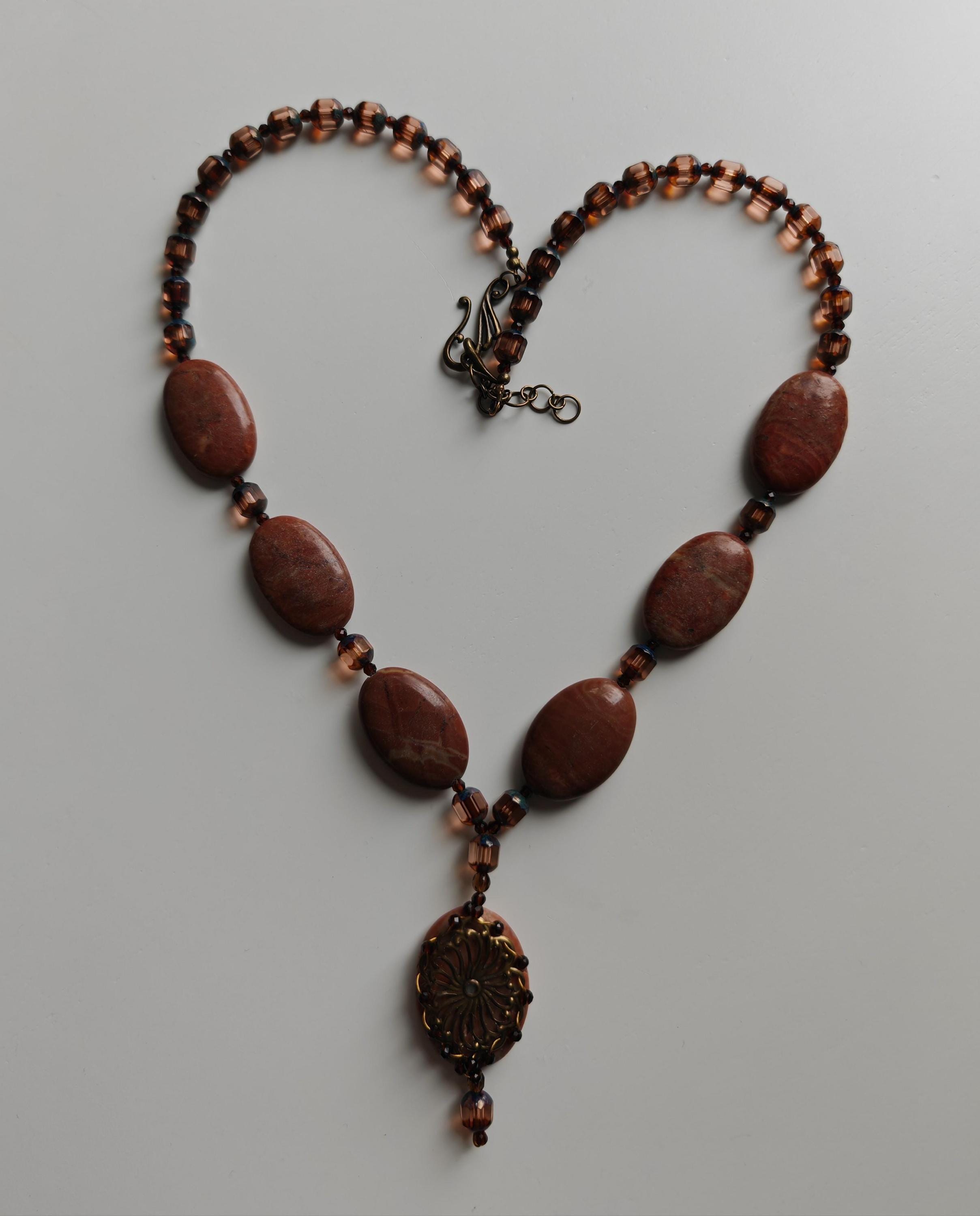 The necklace with a red/brown pendant is approximately 62 cm long, plus an extension chain. The necklace is made of oval red/brown jasper beads (30 mm x 20 mm x 7 mm), faceted brown Bohemian glass beads (8 mm x 7 mm), and faceted brown spinel beads (3 mm). The pendant is approximately 65 mm long, and the oval bead (35 mm x 25 mm x 7 mm) is adorned with a decorative, filigree metal plate.