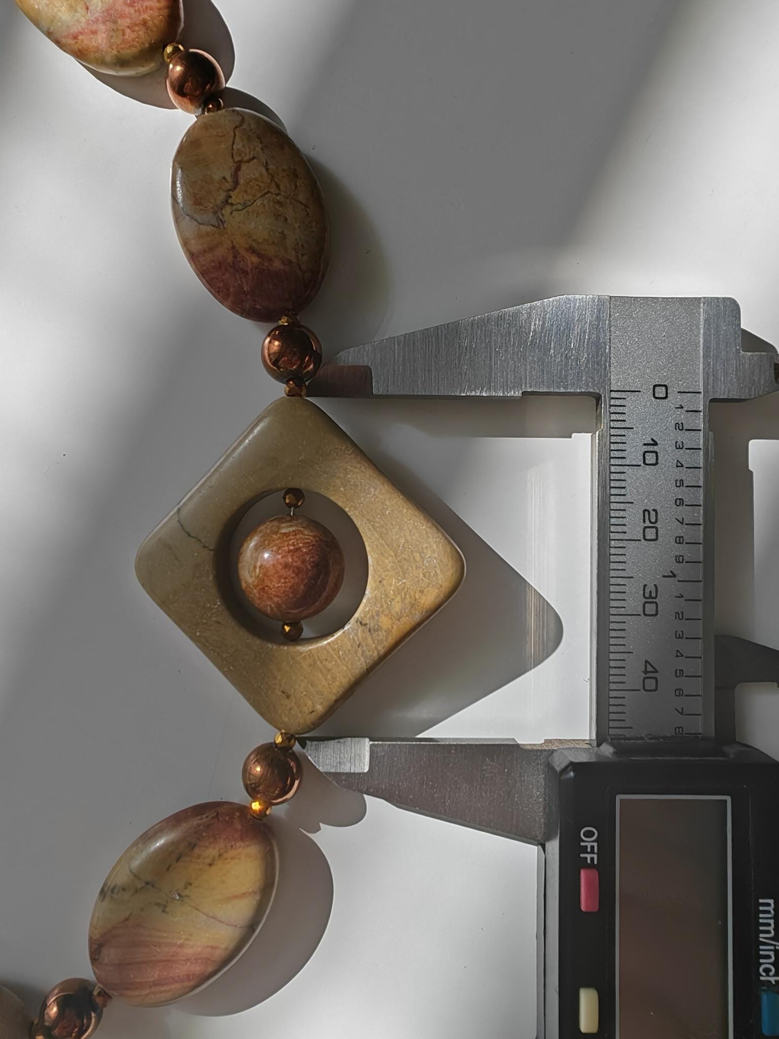 The necklace in yellow/red/brown is approximately 52 cm long. It is made from oval jasper beads in yellow/red/grey/brown (30 mm x 20 mm x 7 mm), hematite beads in brown (8 mm), and faceted spinel beads in cognac brown (3 mm). The diamond-shaped jasper ornament measures 45 mm x 45 mm x 7 mm, and the round jasper bead is 14 mm.