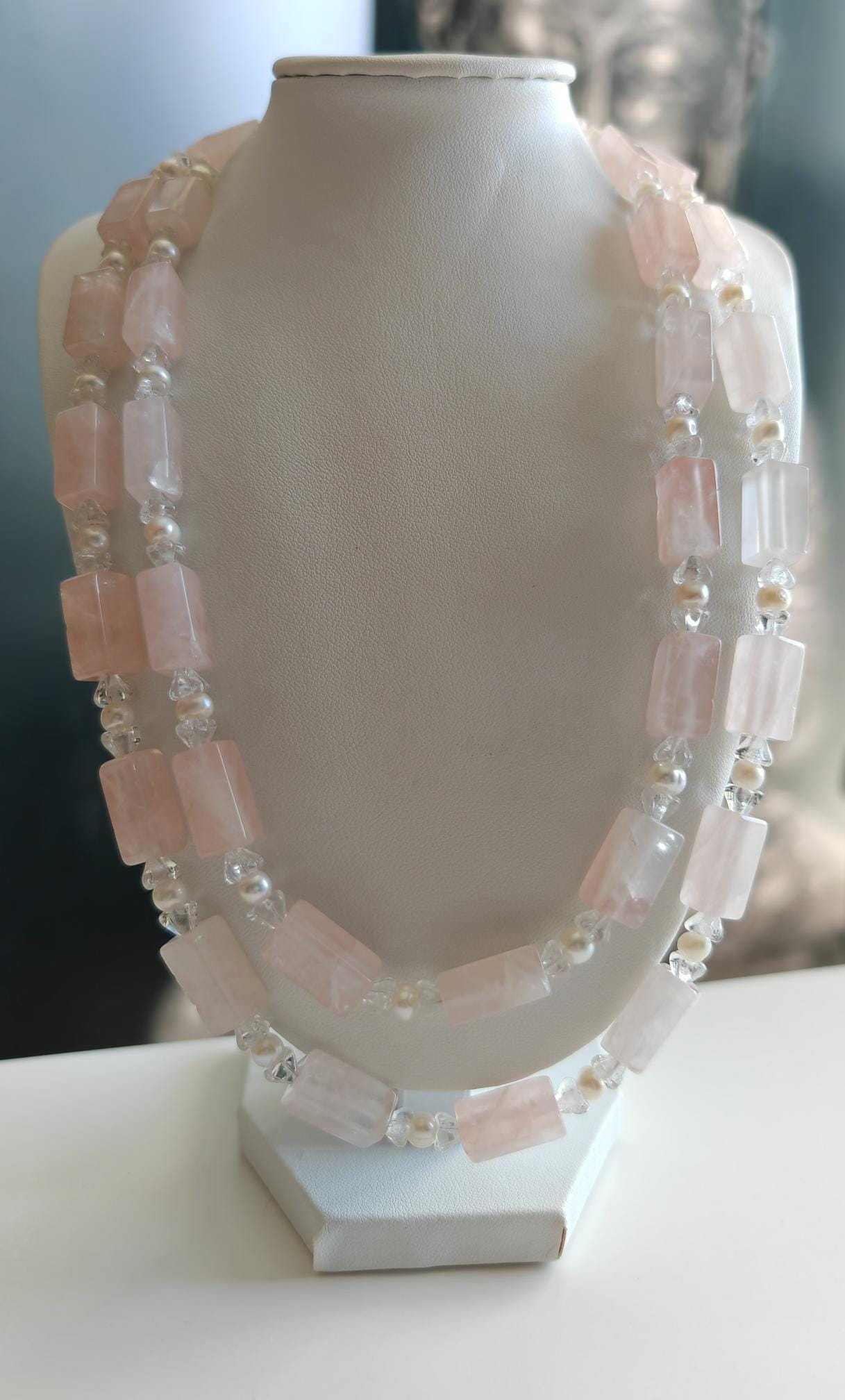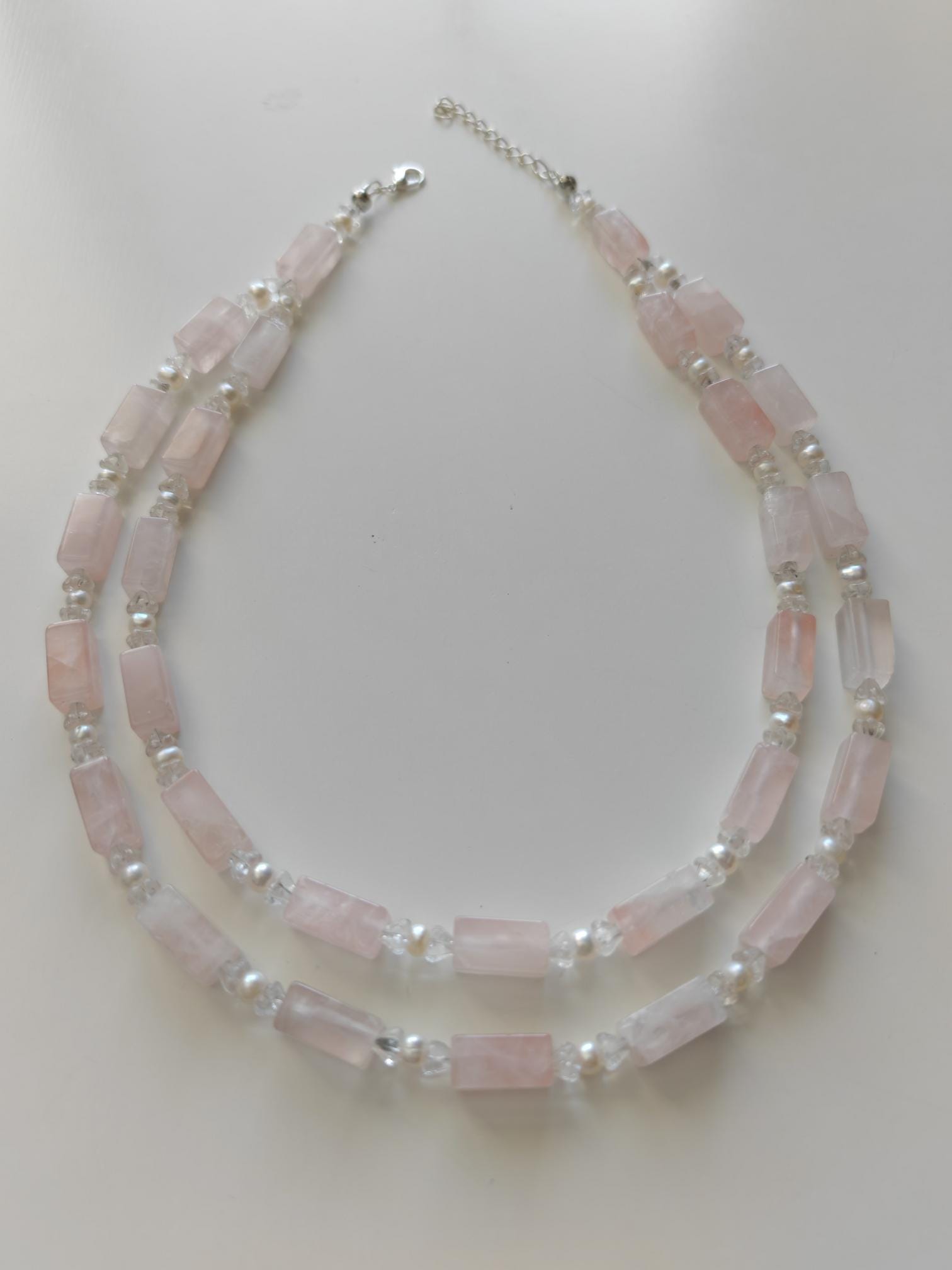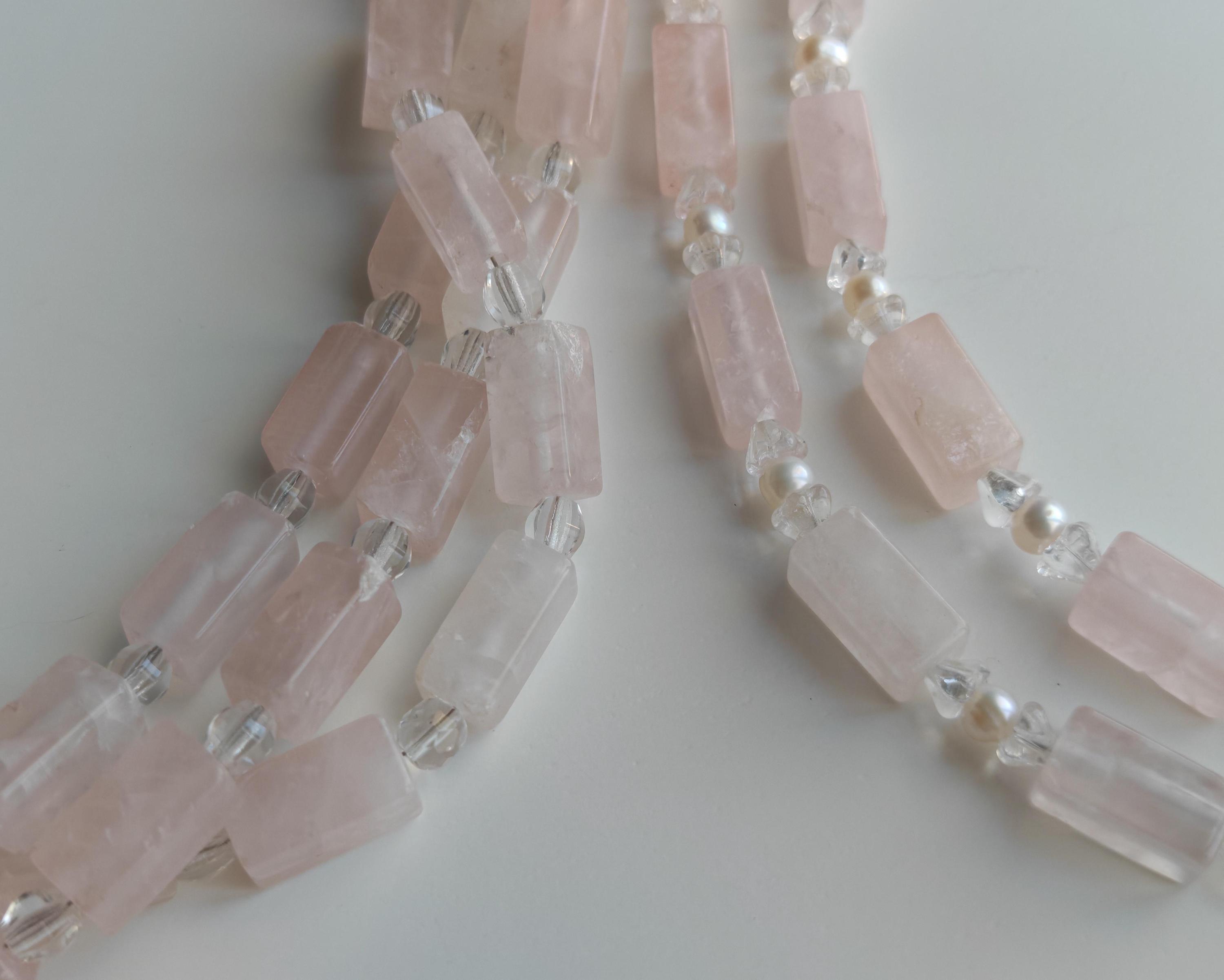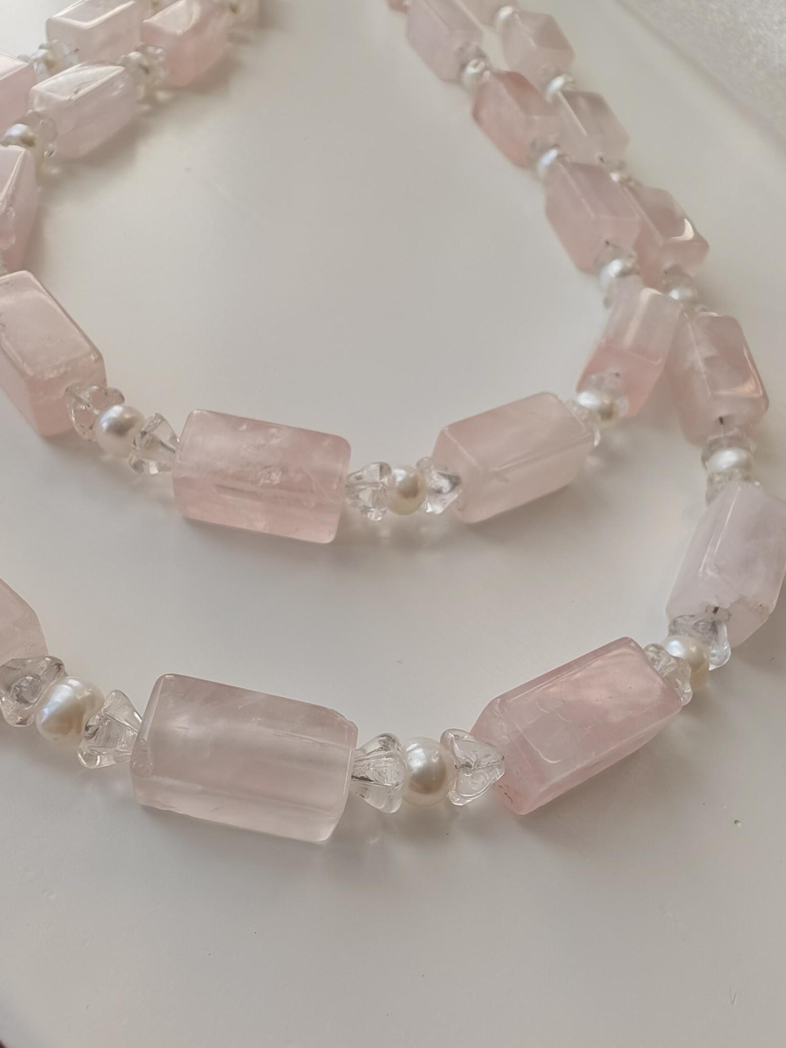This double-strand rose quartz necklace is 48 cm long, plus an extension chain. The delicate necklace, in a soft rose hue, is crafted from rectangular rose quartz beads (16 mm x 8 mm), clear Bohemian glass flower beads (5 mm x 7 mm), and white freshwater pearls (4 mm). The clasp and extension chain are silver-colored. A wonderful gift for a mother or sister. Delicate and timeless.