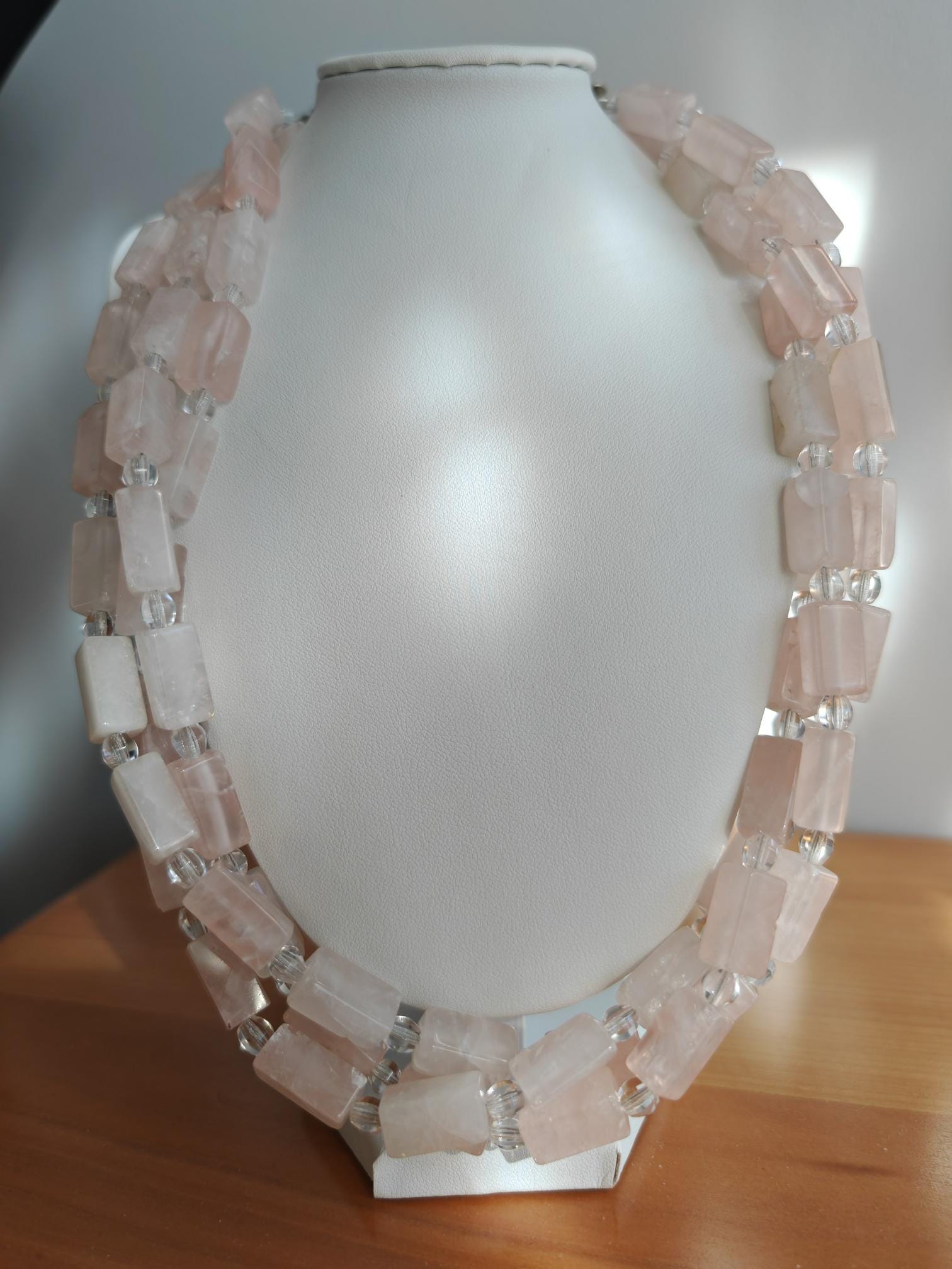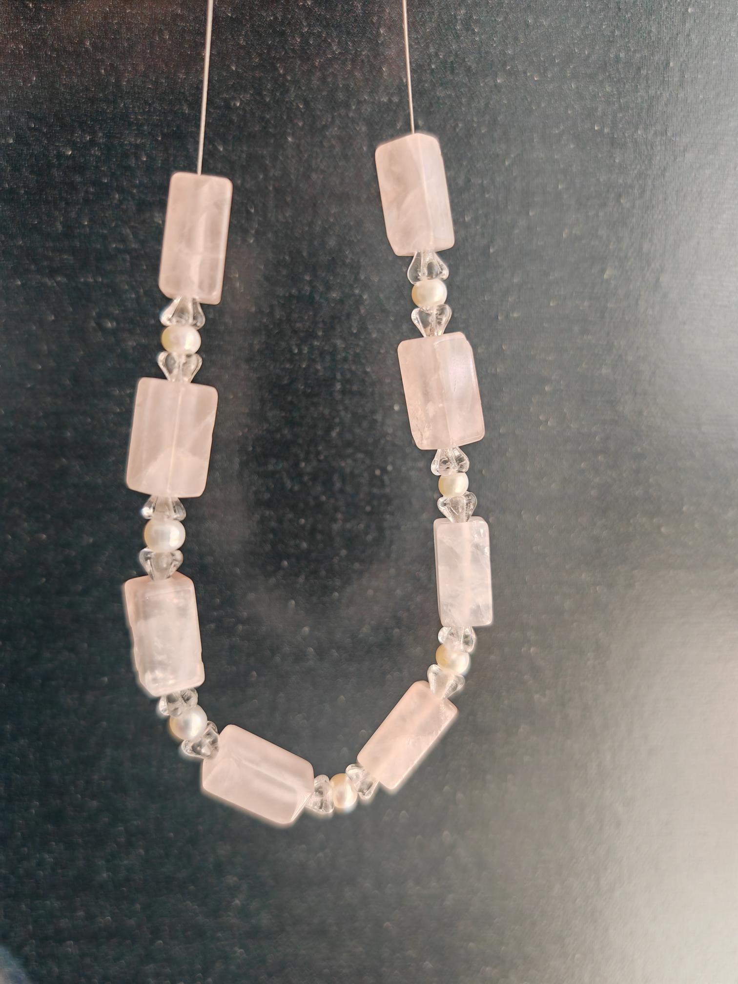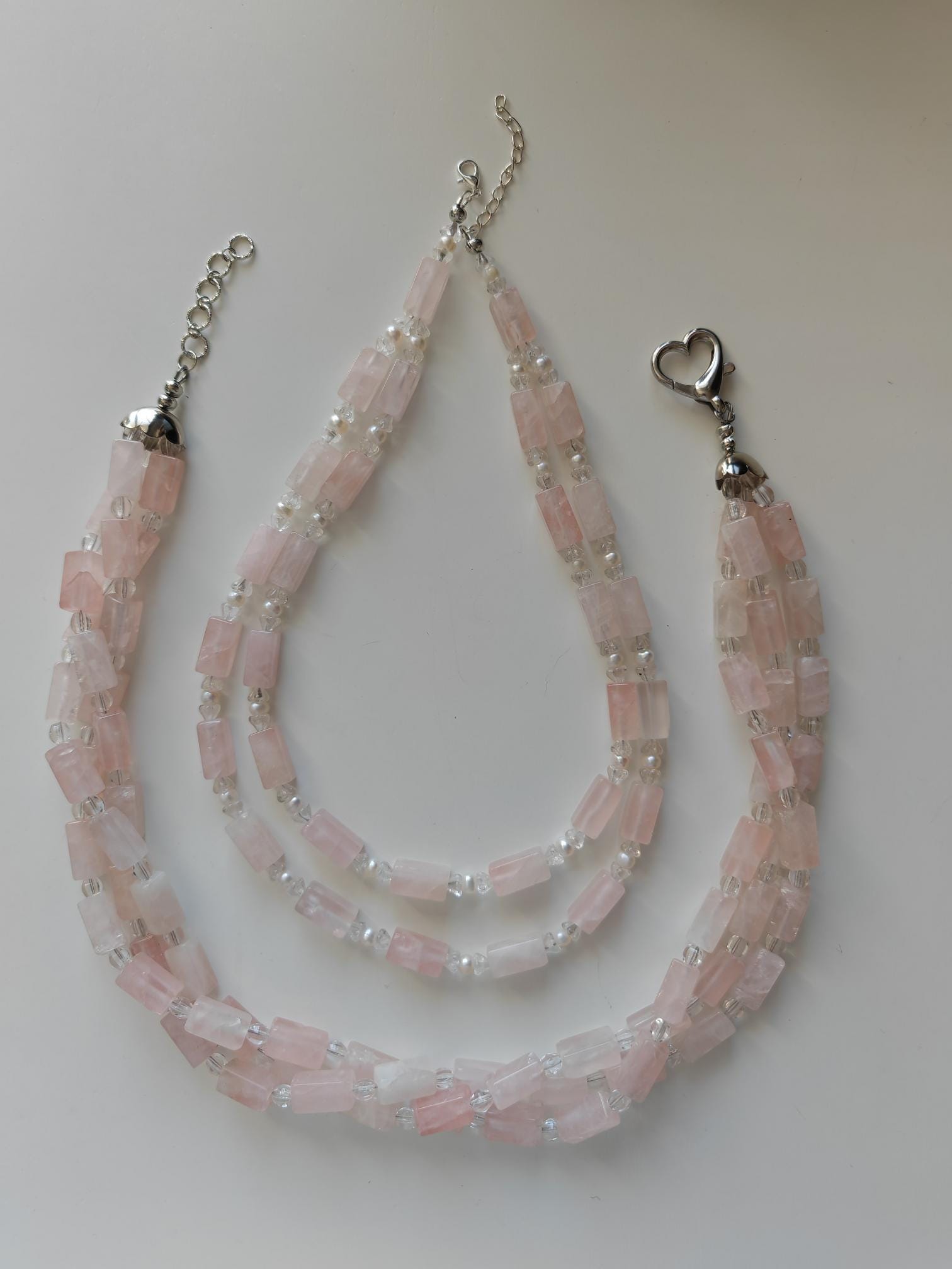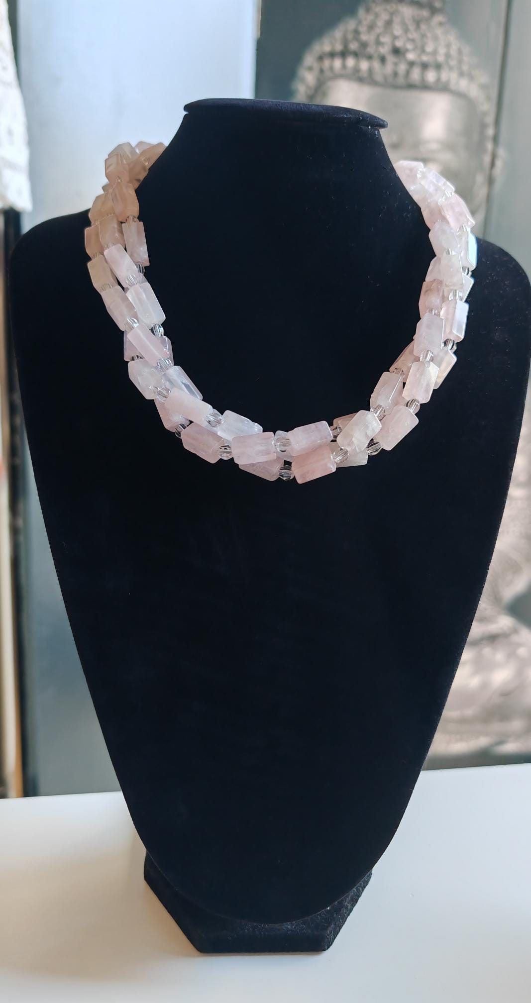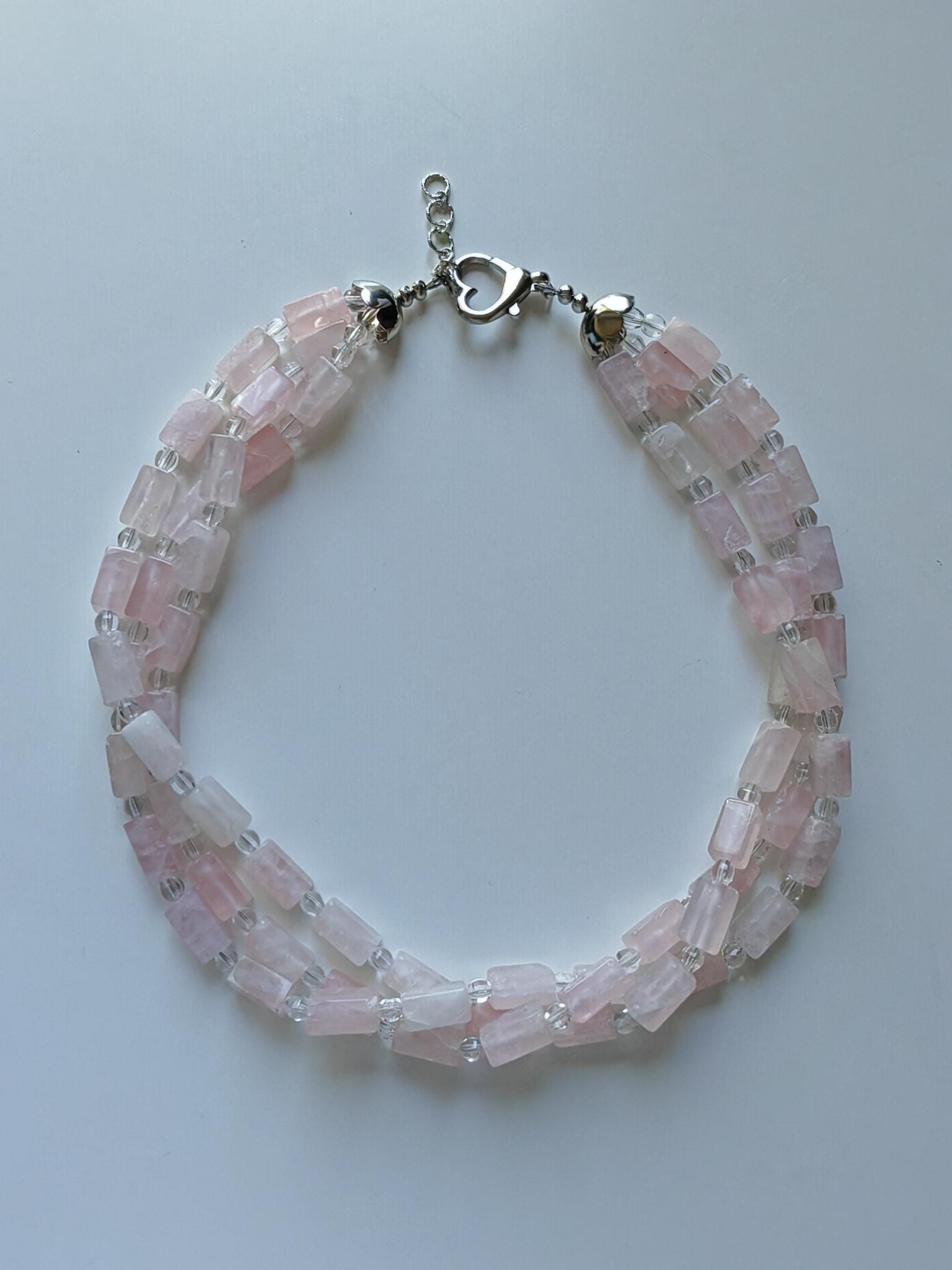 This double-strand rose quartz necklace is 48 cm long, plus an extension chain. The delicate necklace, in a soft rose hue, is crafted from rectangular rose quartz beads (16 mm x 8 mm), clear Bohemian glass flower beads (5 mm x 7 mm), and white freshwater pearls (4 mm). The clasp and extension chain are silver-colored. A wonderful gift for a mother or sister. Delicate and timeless.