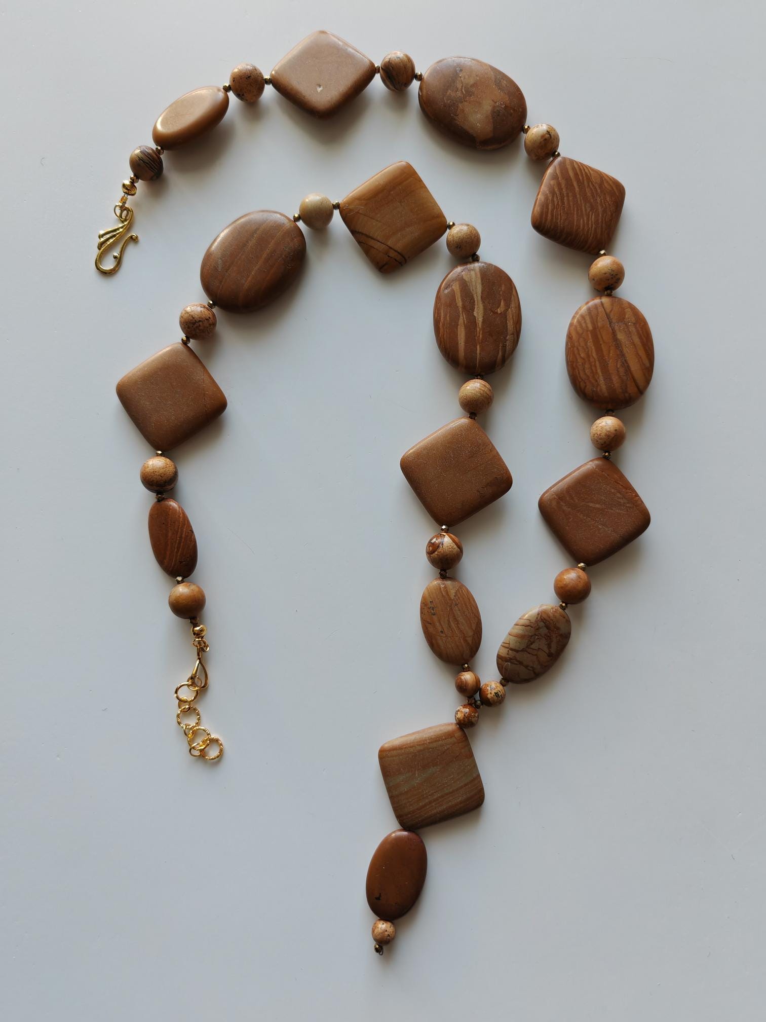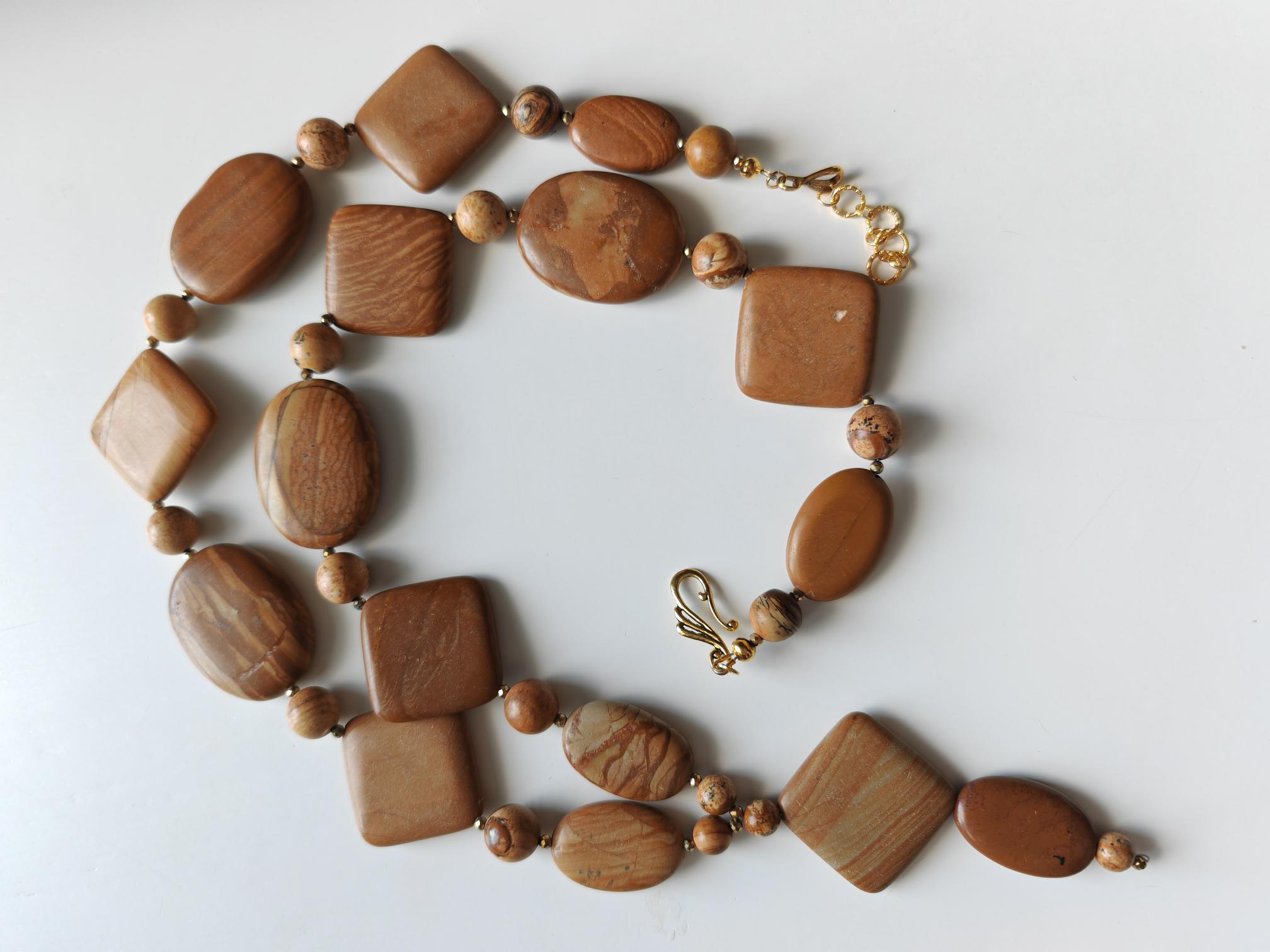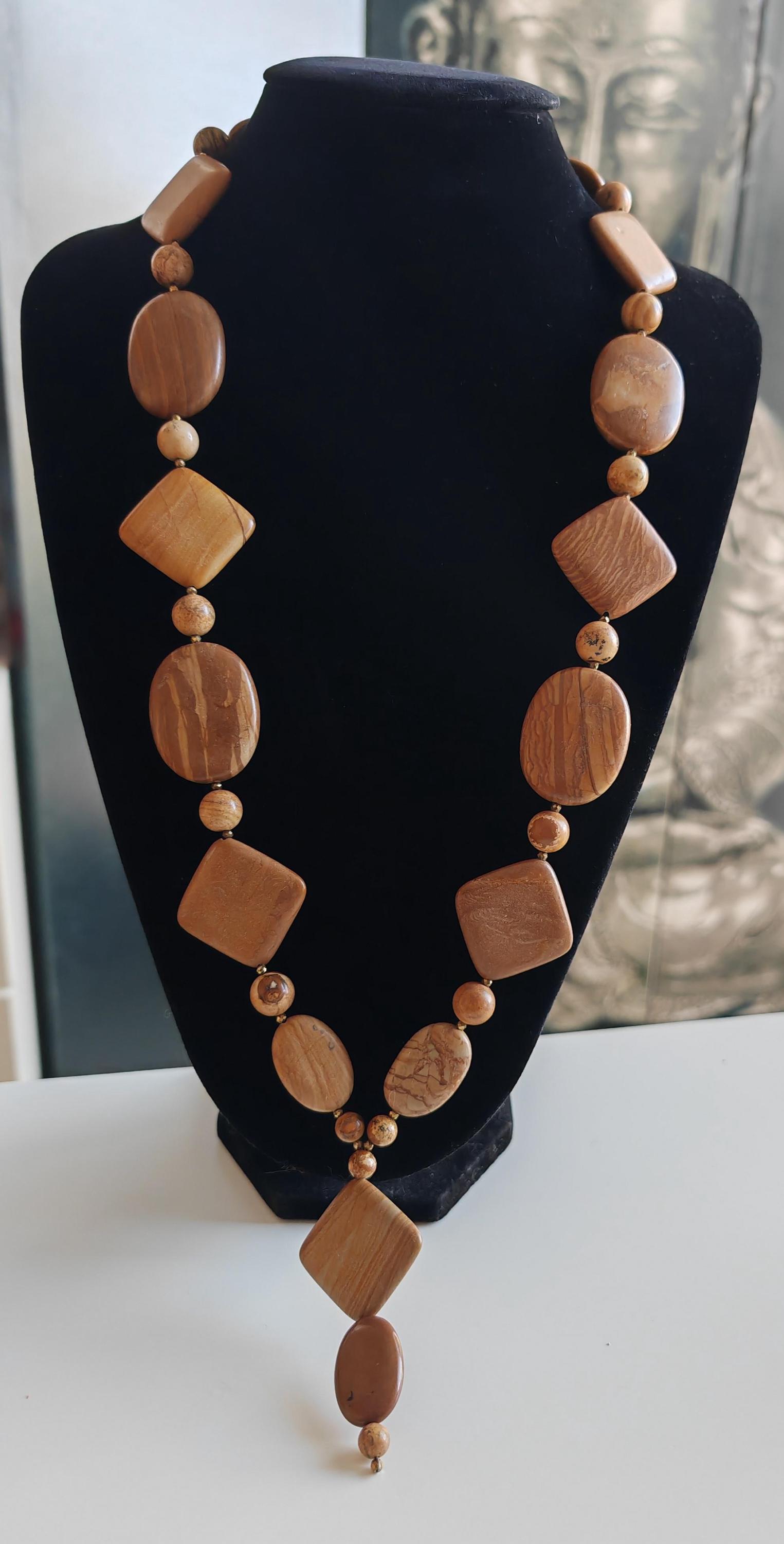 This long, solid jasper necklace with a pendant (approx. 85 mm) in brown/caramel/beige is 81 cm long plus an extension chain. The opulent caramel necklace is crafted from matte jasper beads in light brown/caramel (large oval beads 40 mm x 30 mm x 10 mm, small oval beads 30 mm x 20 mm x 8 mm, diamond-shaped beads 38 mm x 38 mm x 8 mm, round beads 12 mm, 8 mm) and faceted spinel beads in gold (3 mm). The S-shaped clasp and the extension chain are gold-colored.