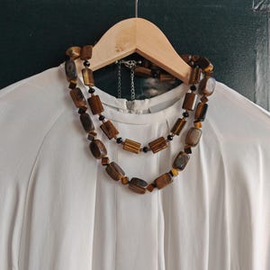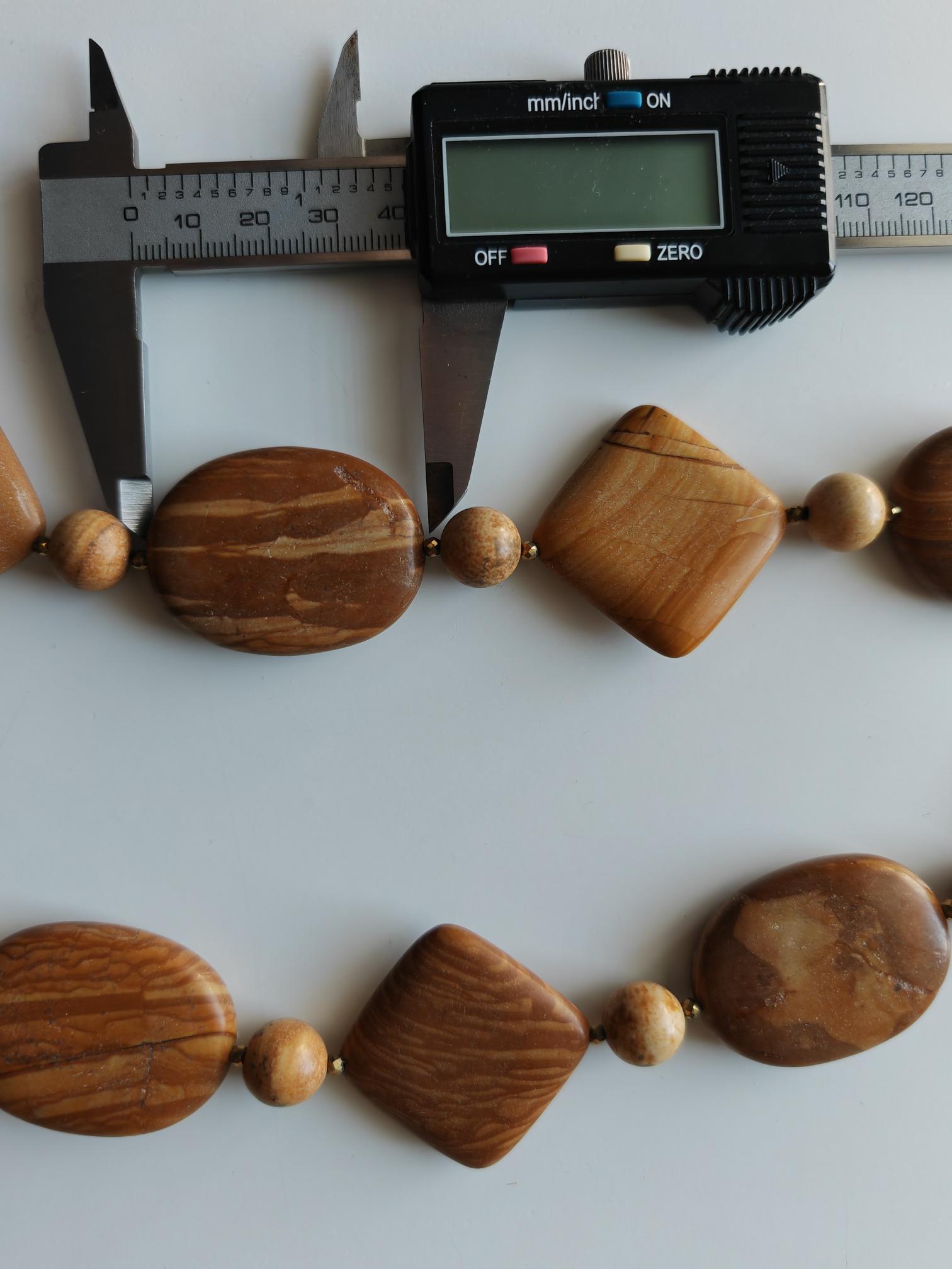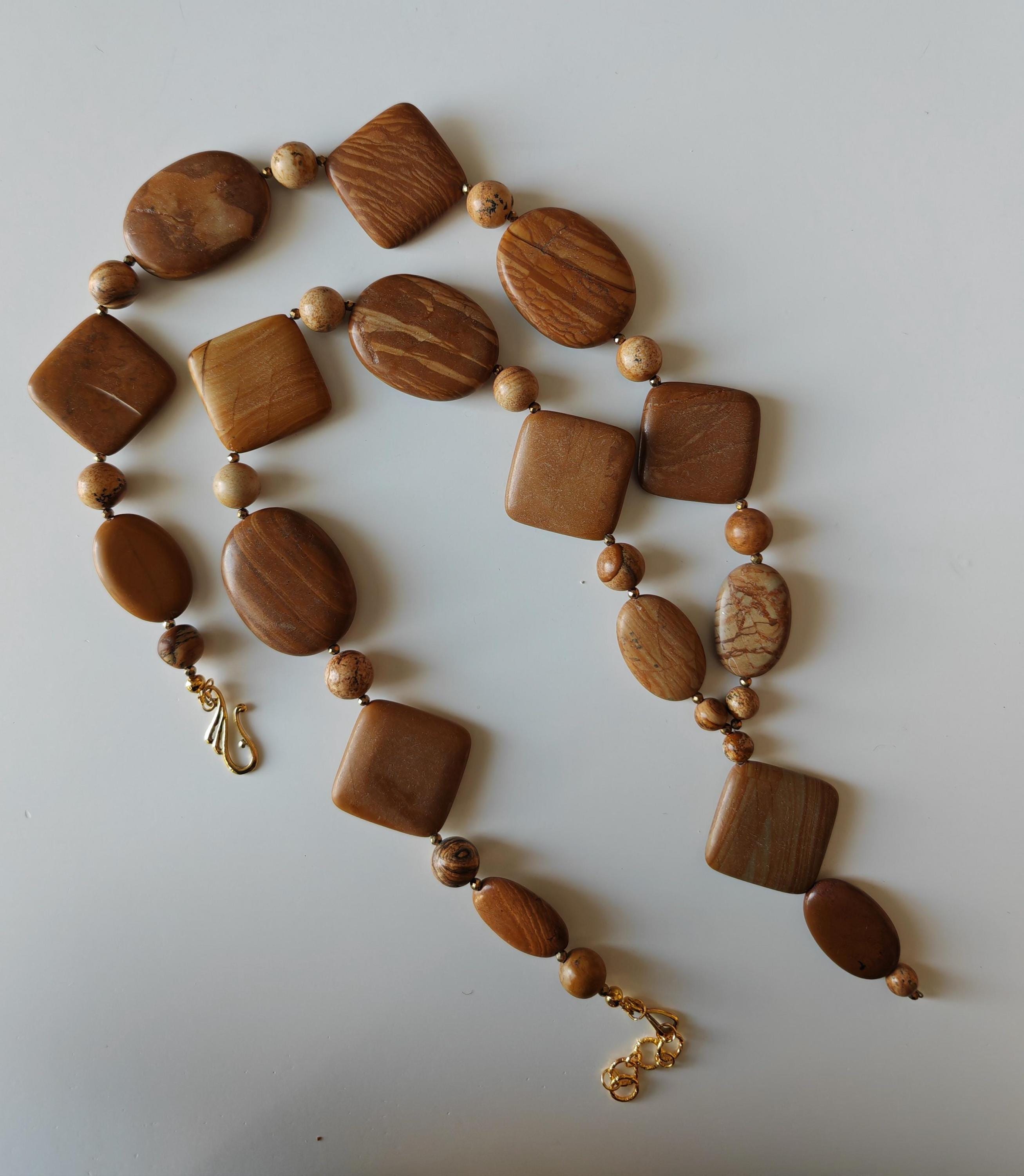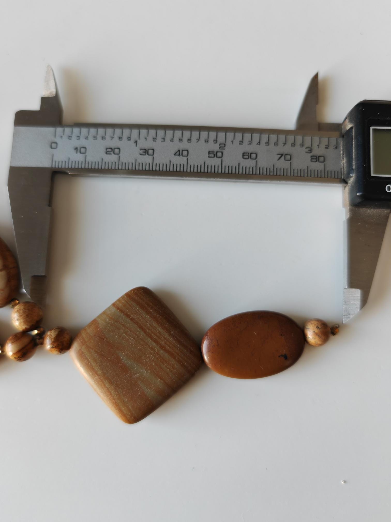 This long, solid jasper necklace with a pendant (approx. 85 mm) in brown/caramel/beige is 81 cm long plus an extension chain. The opulent caramel necklace is crafted from matte jasper beads in light brown/caramel (large oval beads 40 mm x 30 mm x 10 mm, small oval beads 30 mm x 20 mm x 8 mm, diamond-shaped beads 38 mm x 38 mm x 8 mm, round beads 12 mm, 8 mm) and faceted spinel beads in gold (3 mm). The S-shaped clasp and the extension chain are gold-colored.