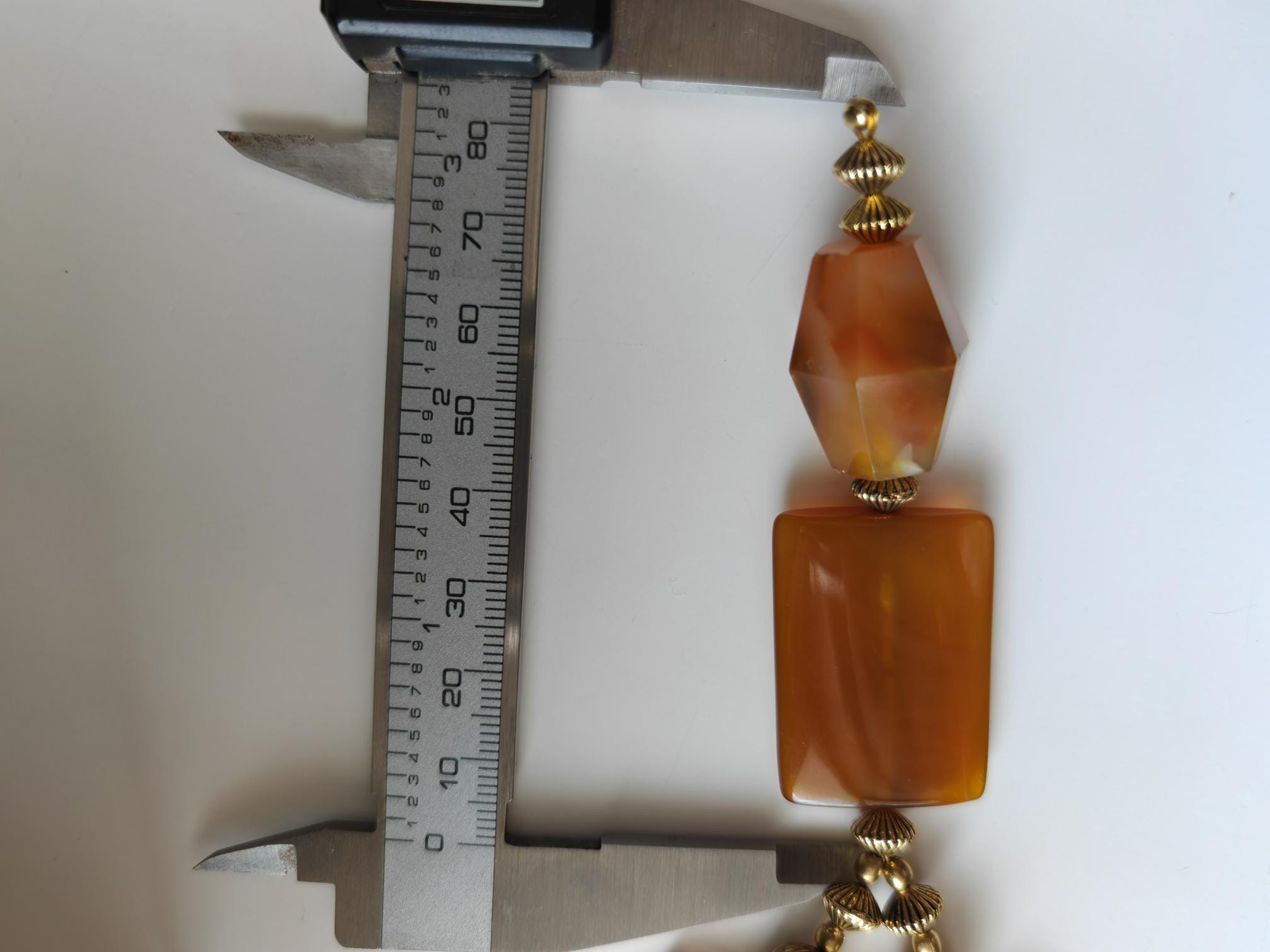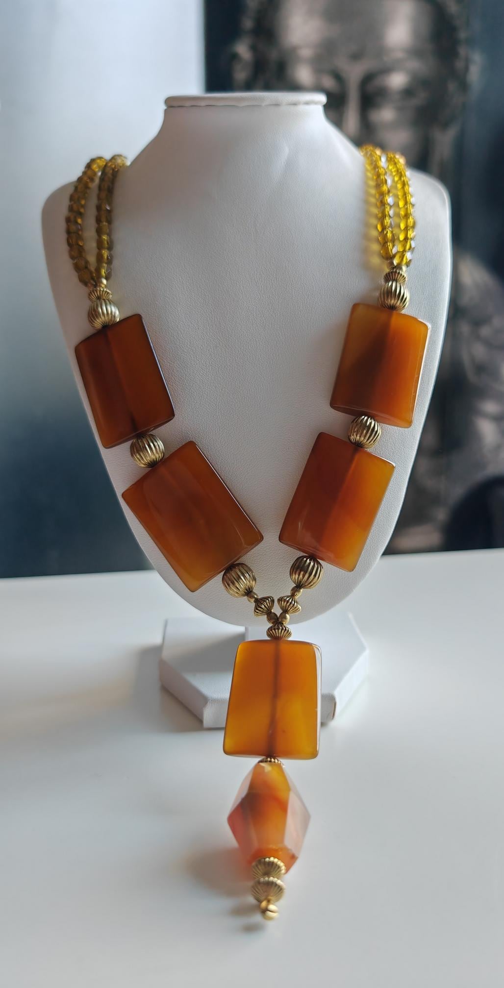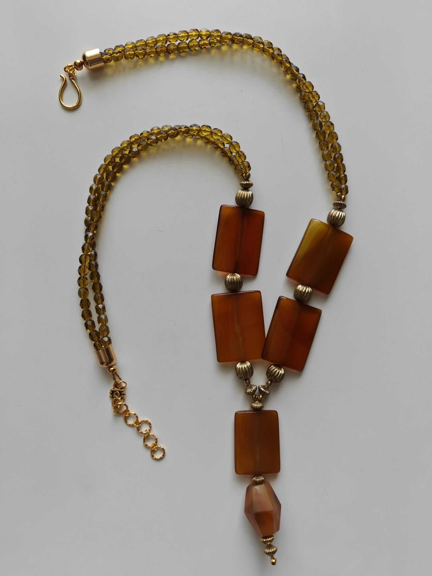 This elegant cognac/gold necklace with a pendant is 71 cm long, plus an extension chain. The necklace is crafted from large carnelian beads (large square beads 35 mm x 25 mm x 7 mm, faceted carnelian bead 25 mm x 23 mm) and faceted Bohemian glass beads (two strands) in cognac (8 mm). The pendant is 85 mm long. The S-clasp, extension chain, bead caps, and metal beads (3 mm, 10 mm, 8 mm x 7 mm) are gold-colored. Available immediately.