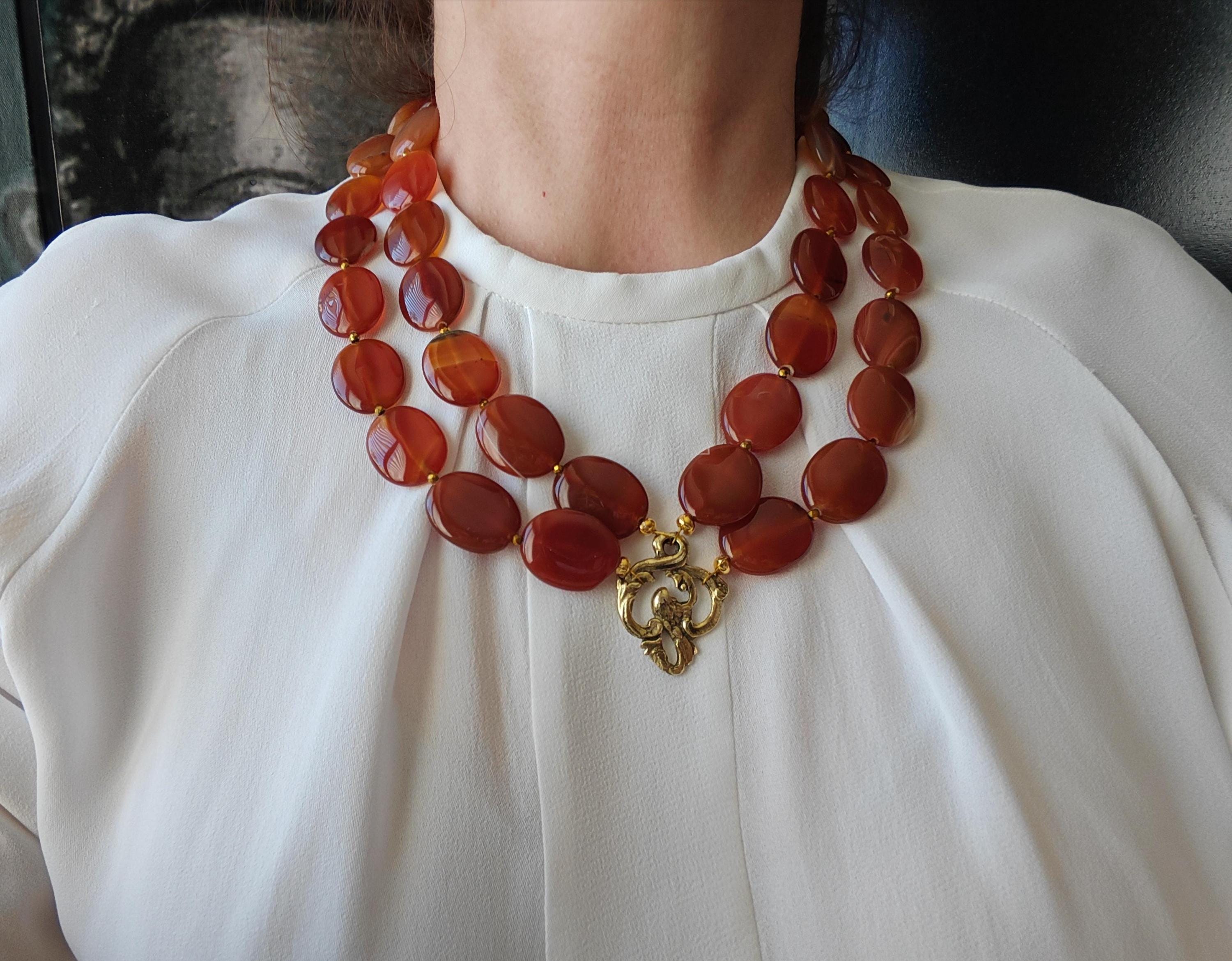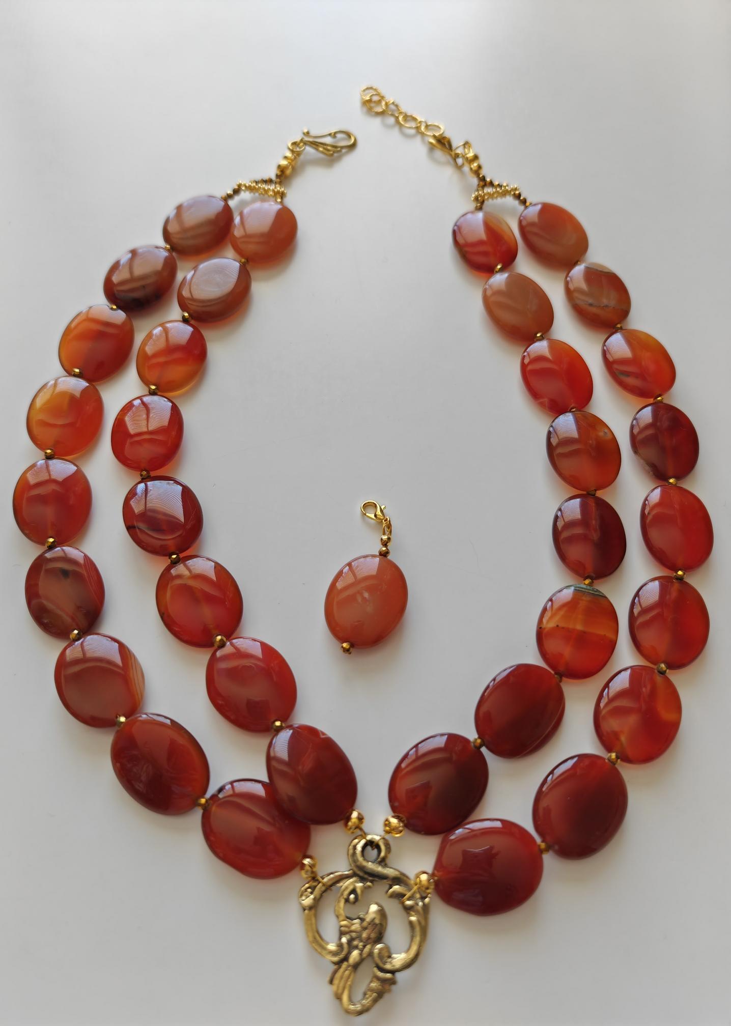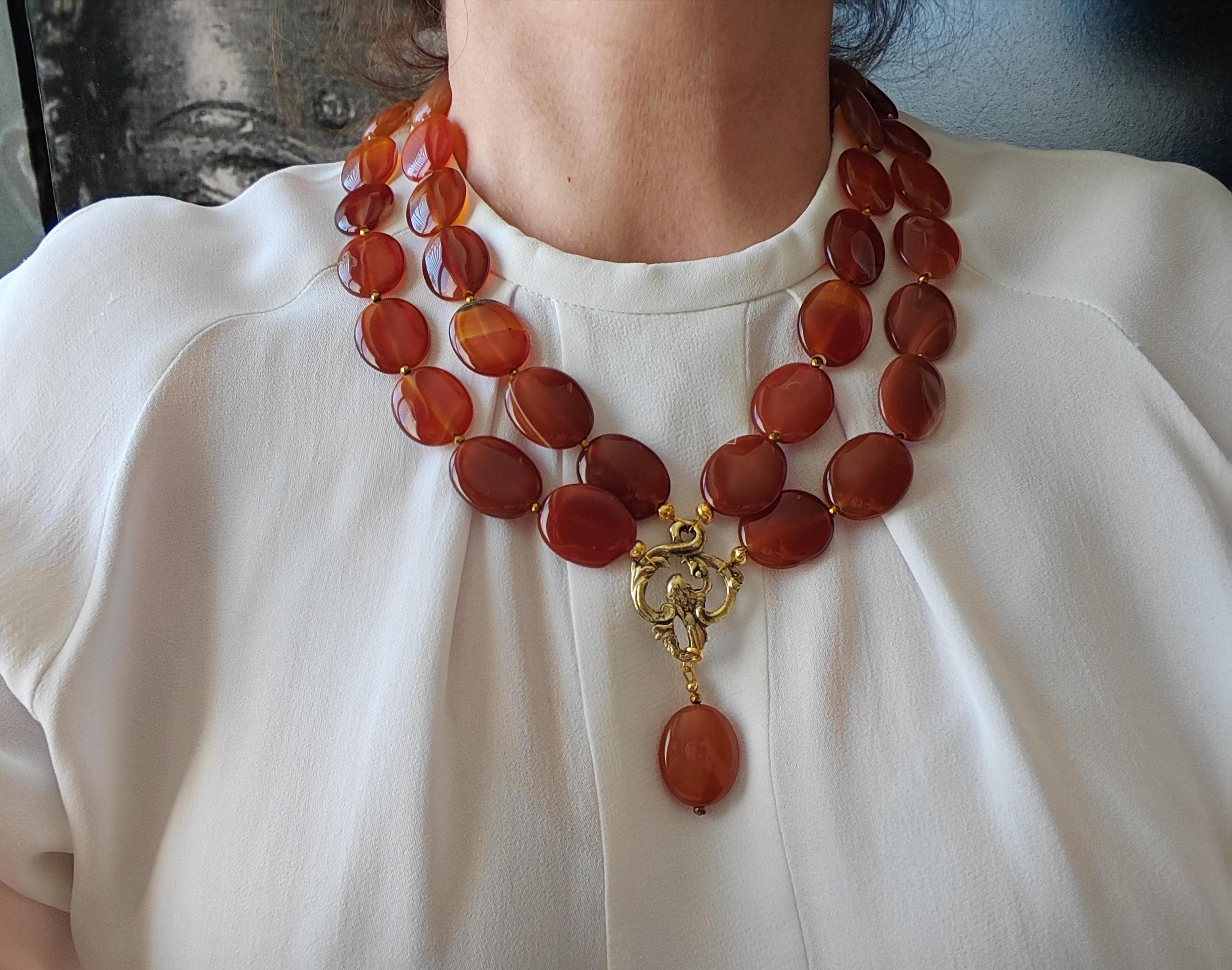 This handmade, double-strand carnelian necklace in shades of brown is 52 cm long, plus an extension chain. The opulent necklace, featuring a charm and detachable pendant, is crafted from oval carnelian beads in brown tones (25 mm x 20 mm x 6 mm) and faceted cognac-colored spinel beads (3 mm). The S-shaped clasp, extension chain, and dividers are gold-colored. Rich, vibrant colors! The metal chain (35 mm x 25 mm) is gold-colored. The pendant is almost 5 cm long. A beautiful, opulent necklace perfect for special occasions!
