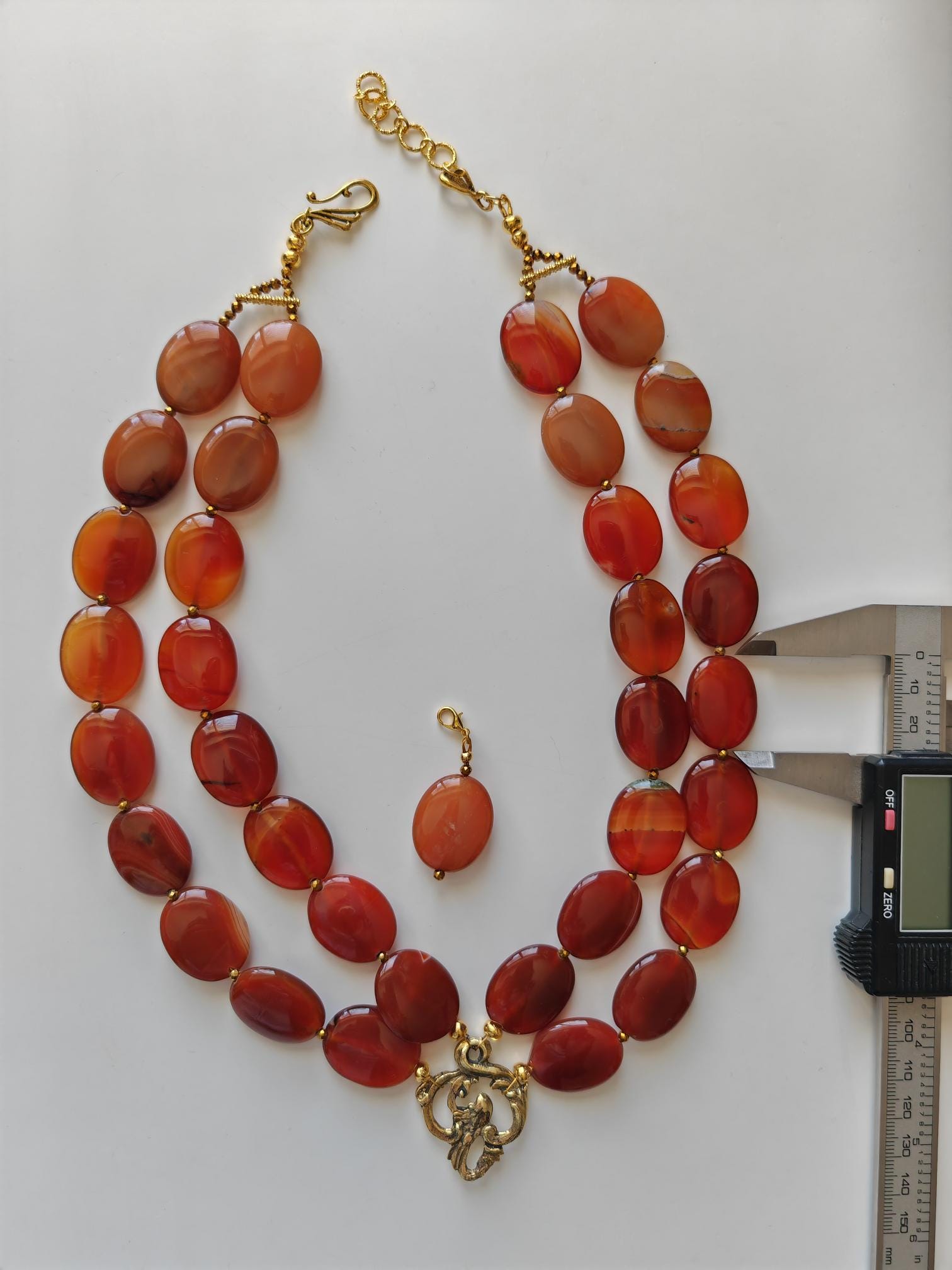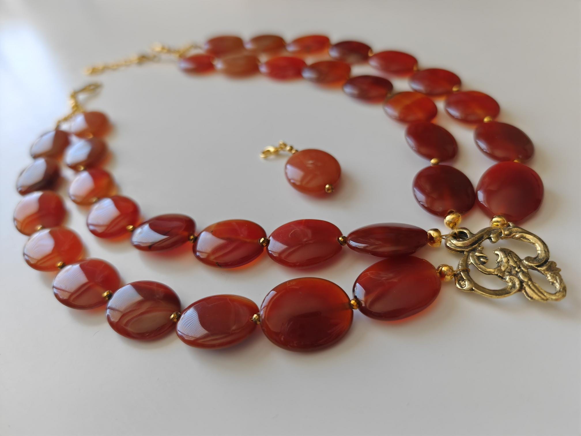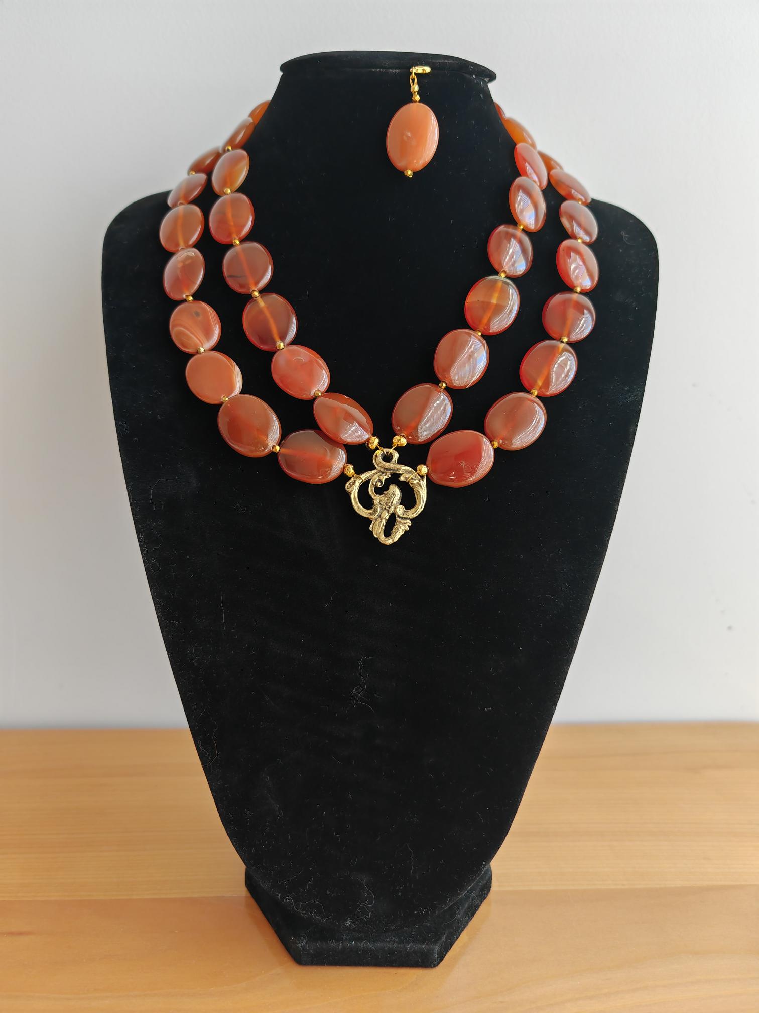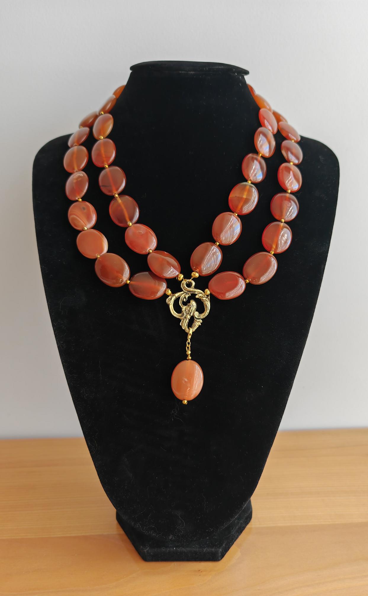 This handmade, double-strand carnelian necklace in shades of brown is 52 cm long, plus an extension chain. The opulent necklace, featuring a charm and detachable pendant, is crafted from oval carnelian beads in brown tones (25 mm x 20 mm x 6 mm) and faceted cognac-colored spinel beads (3 mm). The S-shaped clasp, extension chain, and dividers are gold-colored. Rich, vibrant colors! The metal chain (35 mm x 25 mm) is gold-colored. The pendant is almost 5 cm long. A beautiful, opulent necklace perfect for special occasions!