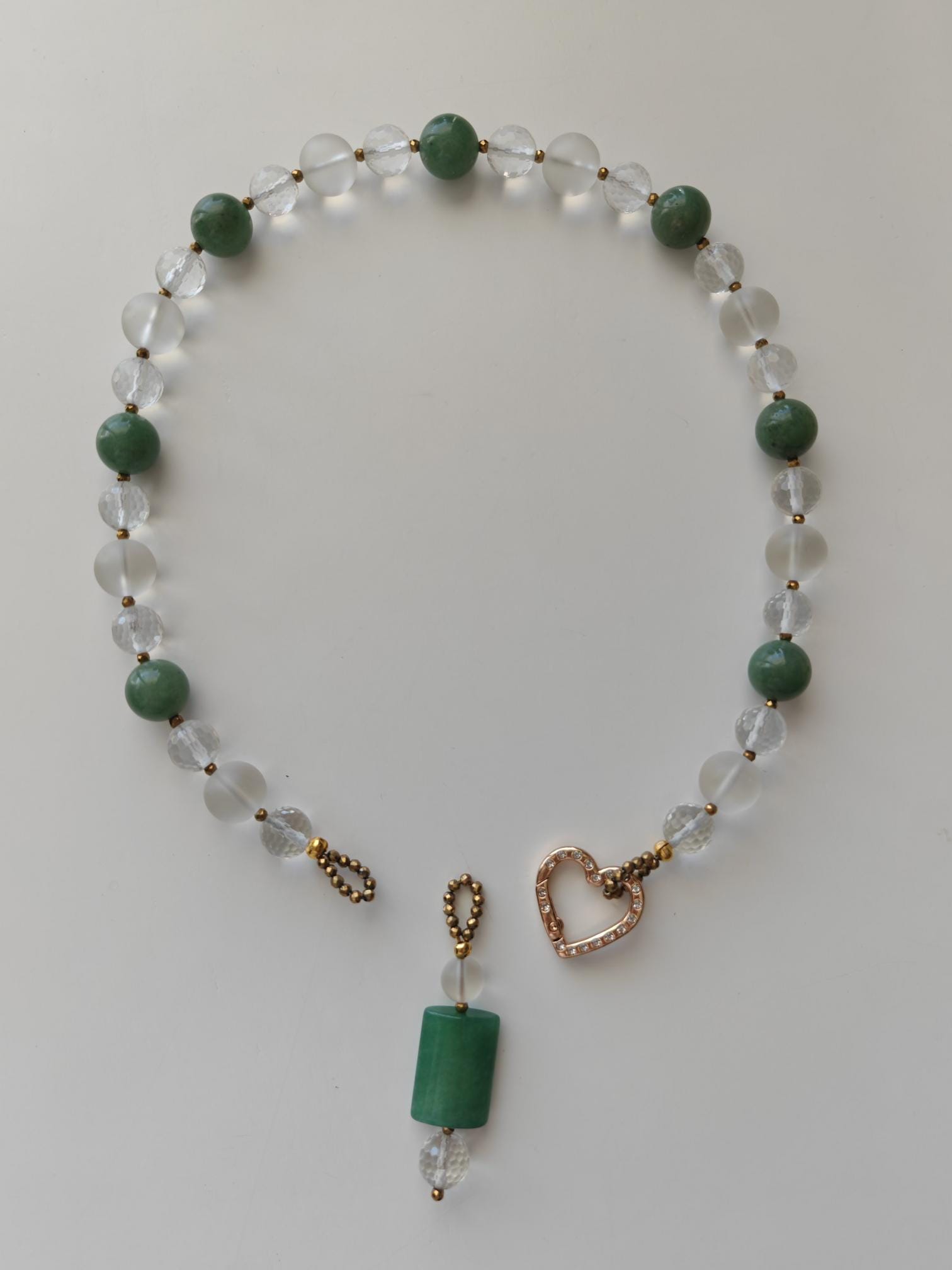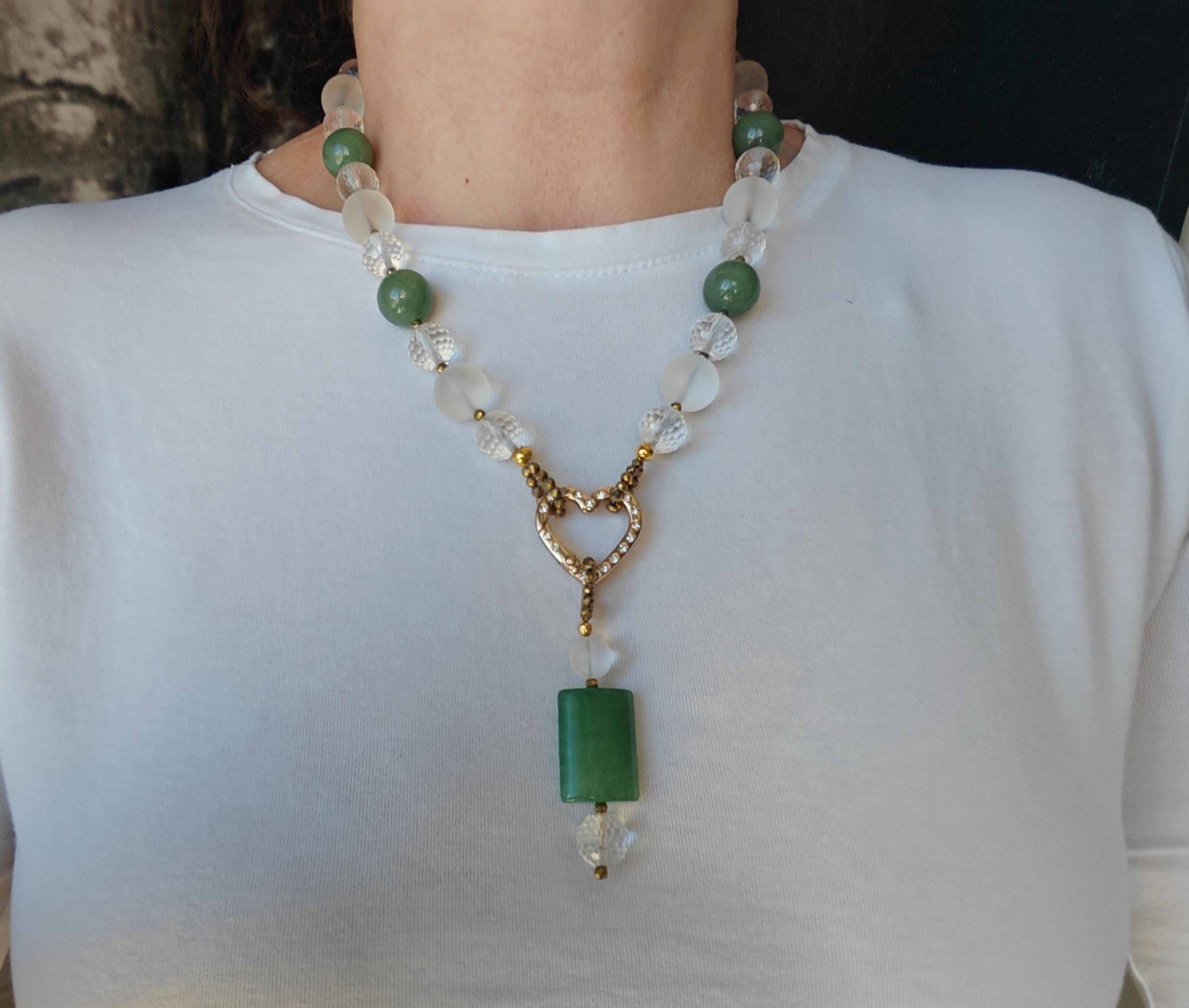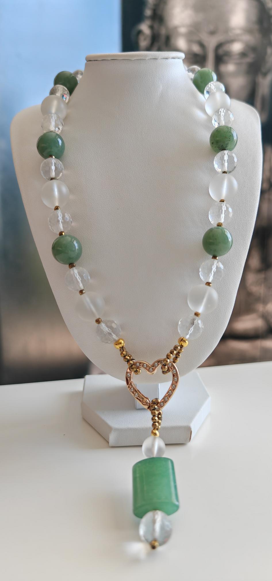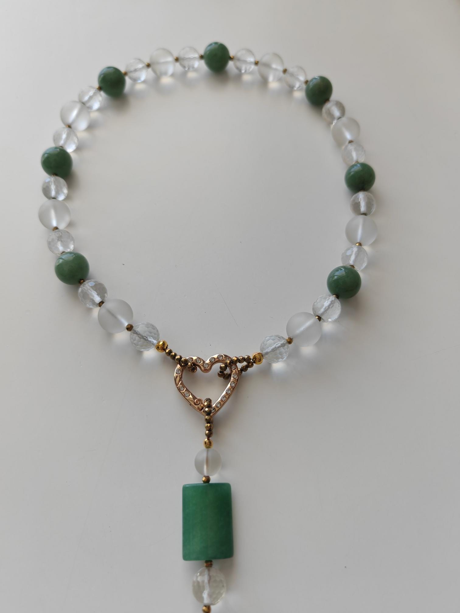 This elegant, handmade necklace with a detachable pendant is 54 cm long. The necklace is crafted from round green aventurine beads (14 mm), rock crystal beads (matte beads 14 mm, 8 mm, and faceted beads 12 mm), and faceted spinel beads in gold (3 mm). The detachable pendant is over 7 cm long (the aventurine bead measures 25 mm x 20 mm x 8 mm). The gold-colored heart-shaped clasp (sharp) is approximately 25 mm x 25 mm. You can wear this beautiful necklace in various ways (see photos), both for everyday wear and for special occasions. It can also be combined with other jewelry.