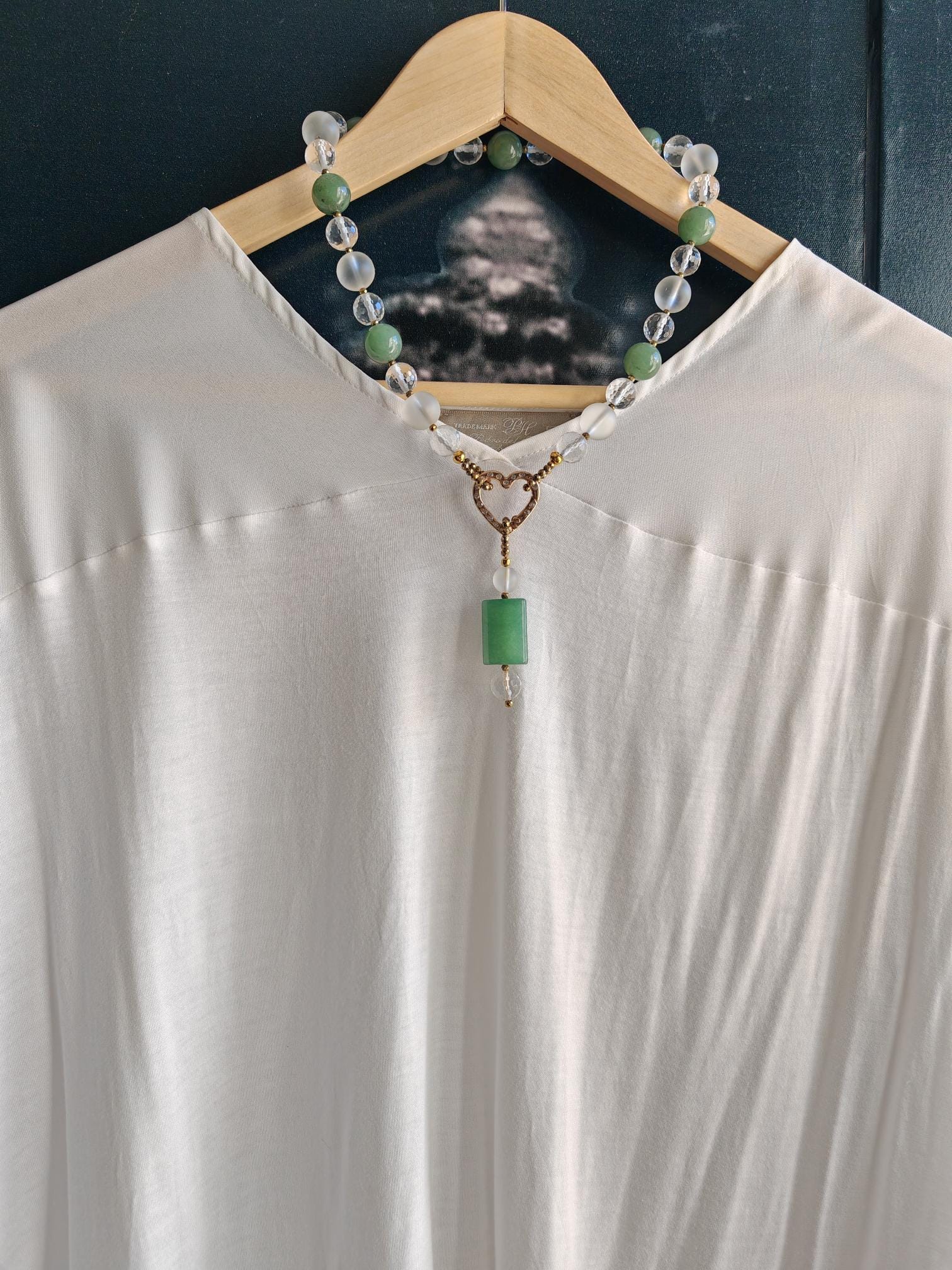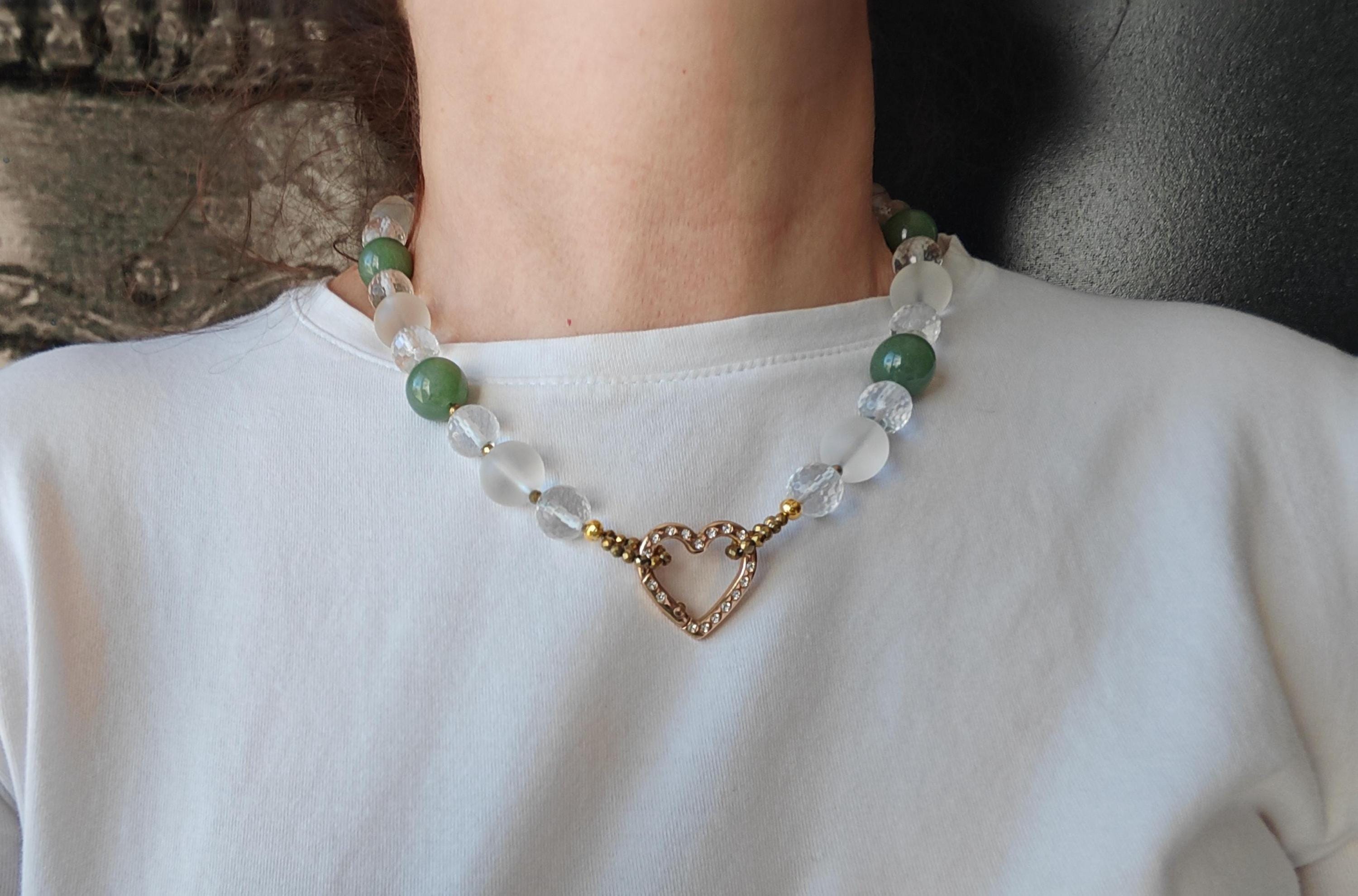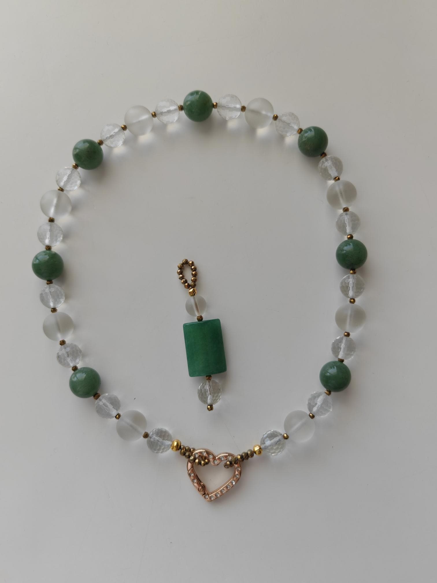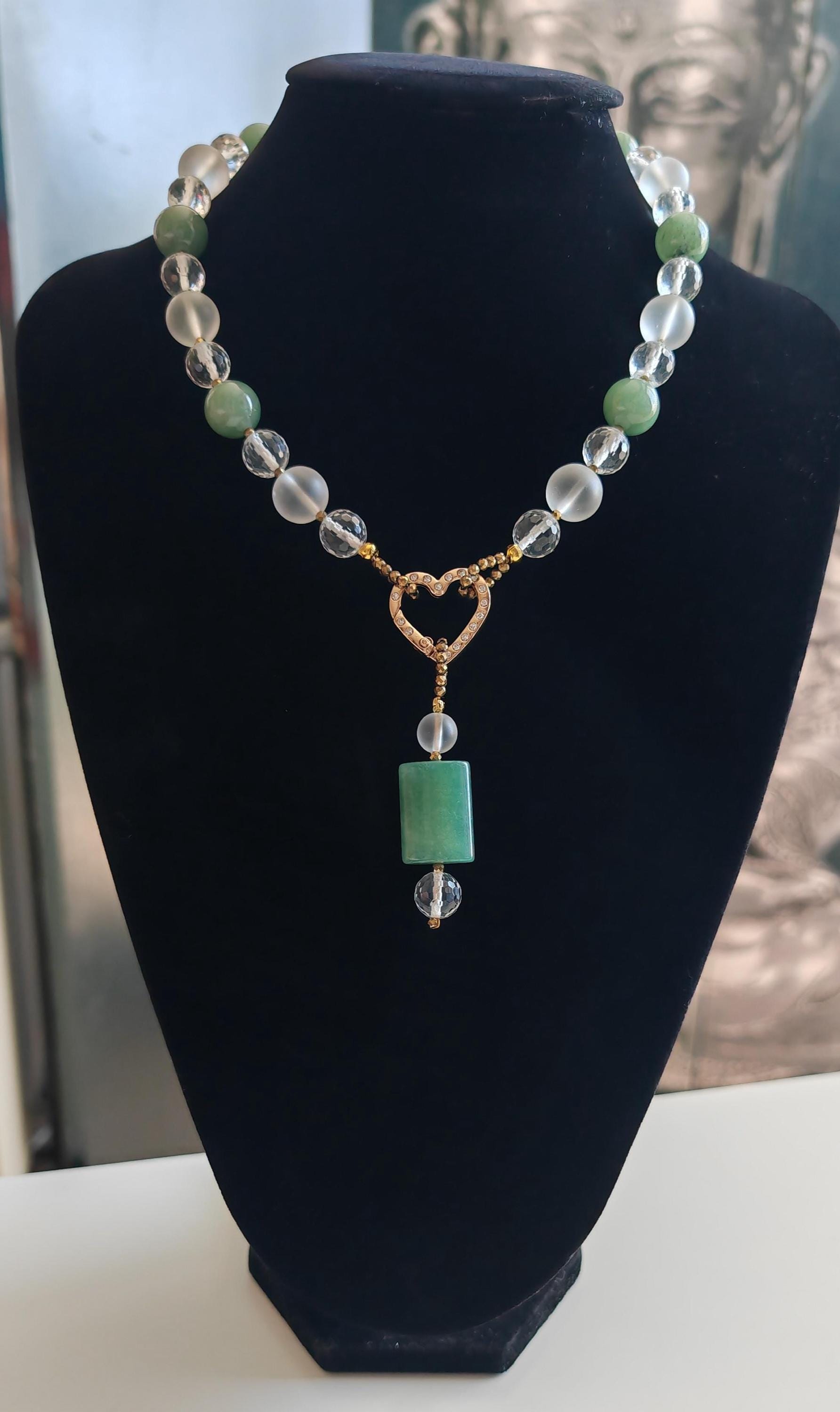 This elegant, handmade necklace with a detachable pendant is 54 cm long. The necklace is crafted from round green aventurine beads (14 mm), rock crystal beads (matte beads 14 mm, 8 mm, and faceted beads 12 mm), and faceted spinel beads in gold (3 mm). The detachable pendant is over 7 cm long (the aventurine bead measures 25 mm x 20 mm x 8 mm). The gold-colored heart-shaped clasp (sharp) is approximately 25 mm x 25 mm. You can wear this beautiful necklace in various ways (see photos), both for everyday wear and for special occasions. It can also be combined with other jewelry.