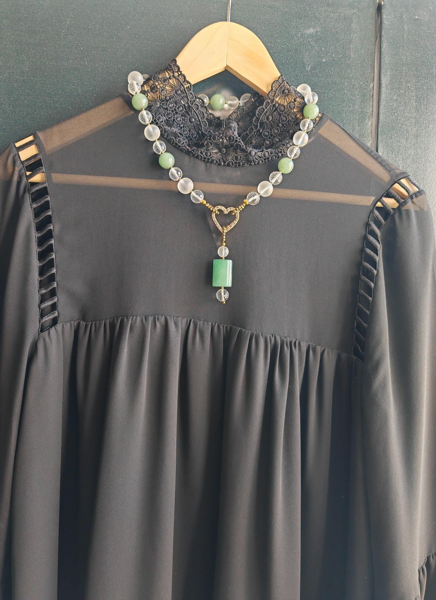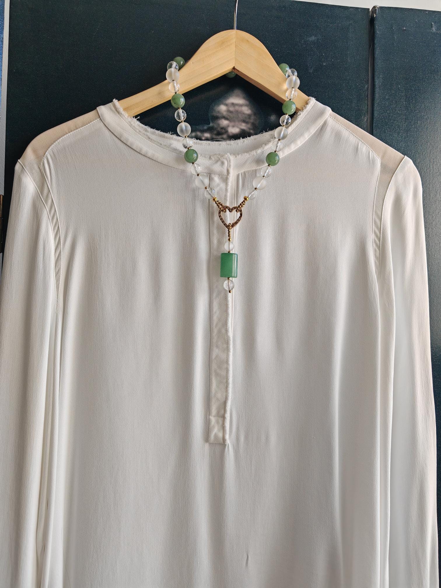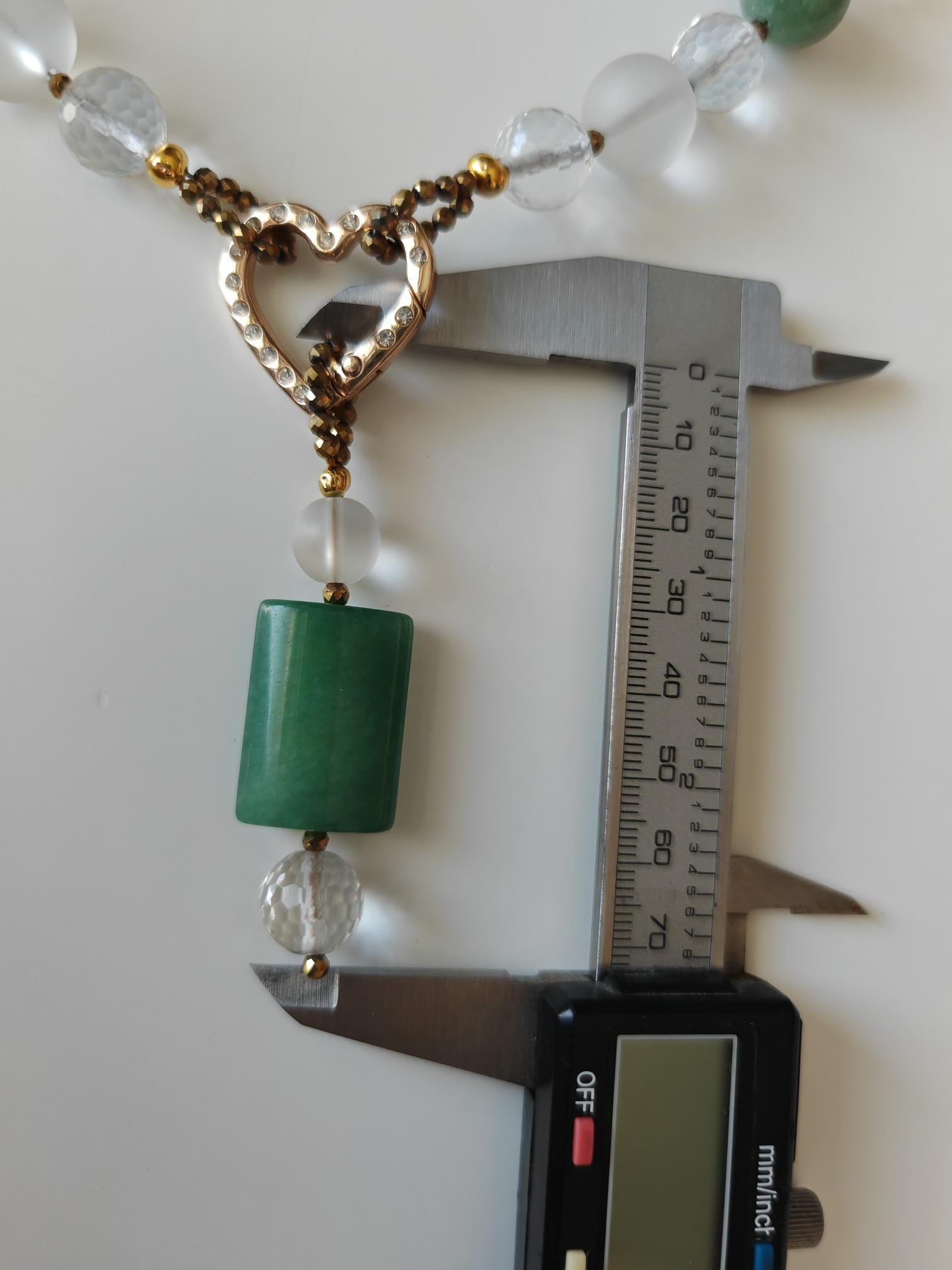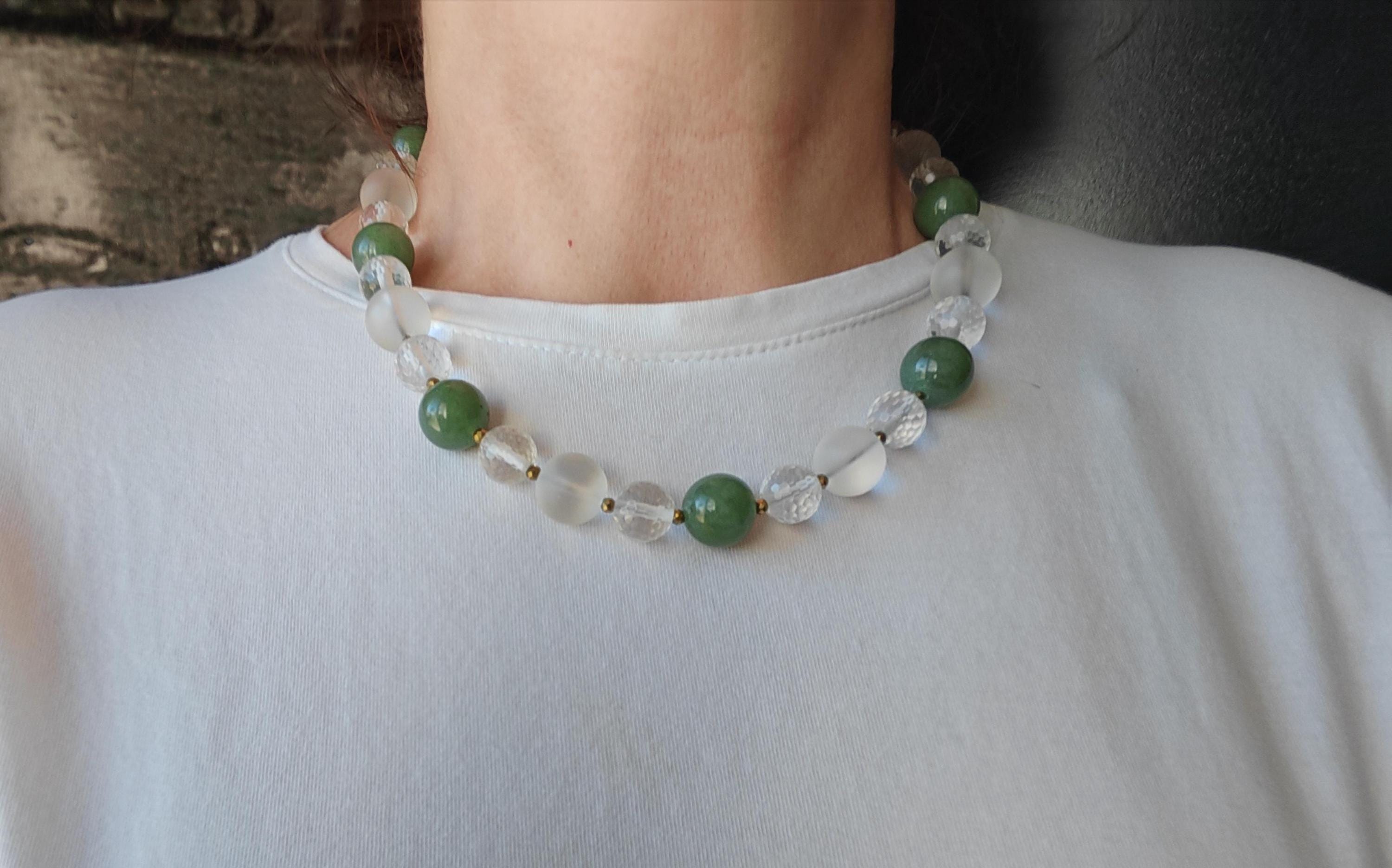 This elegant, handmade necklace with a detachable pendant is 54 cm long. The necklace is crafted from round green aventurine beads (14 mm), rock crystal beads (matte beads 14 mm, 8 mm, and faceted beads 12 mm), and faceted spinel beads in gold (3 mm). The detachable pendant is over 7 cm long (the aventurine bead measures 25 mm x 20 mm x 8 mm). The gold-colored heart-shaped clasp (sharp) is approximately 25 mm x 25 mm. You can wear this beautiful necklace in various ways (see photos), both for everyday wear and for special occasions. It can also be combined with other jewelry.