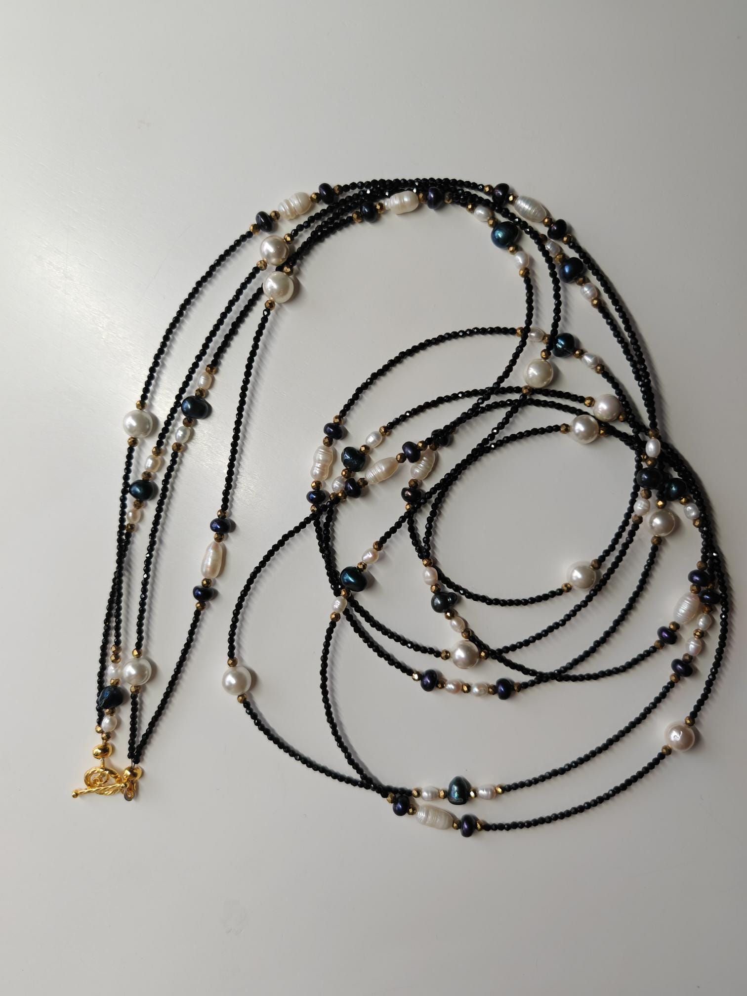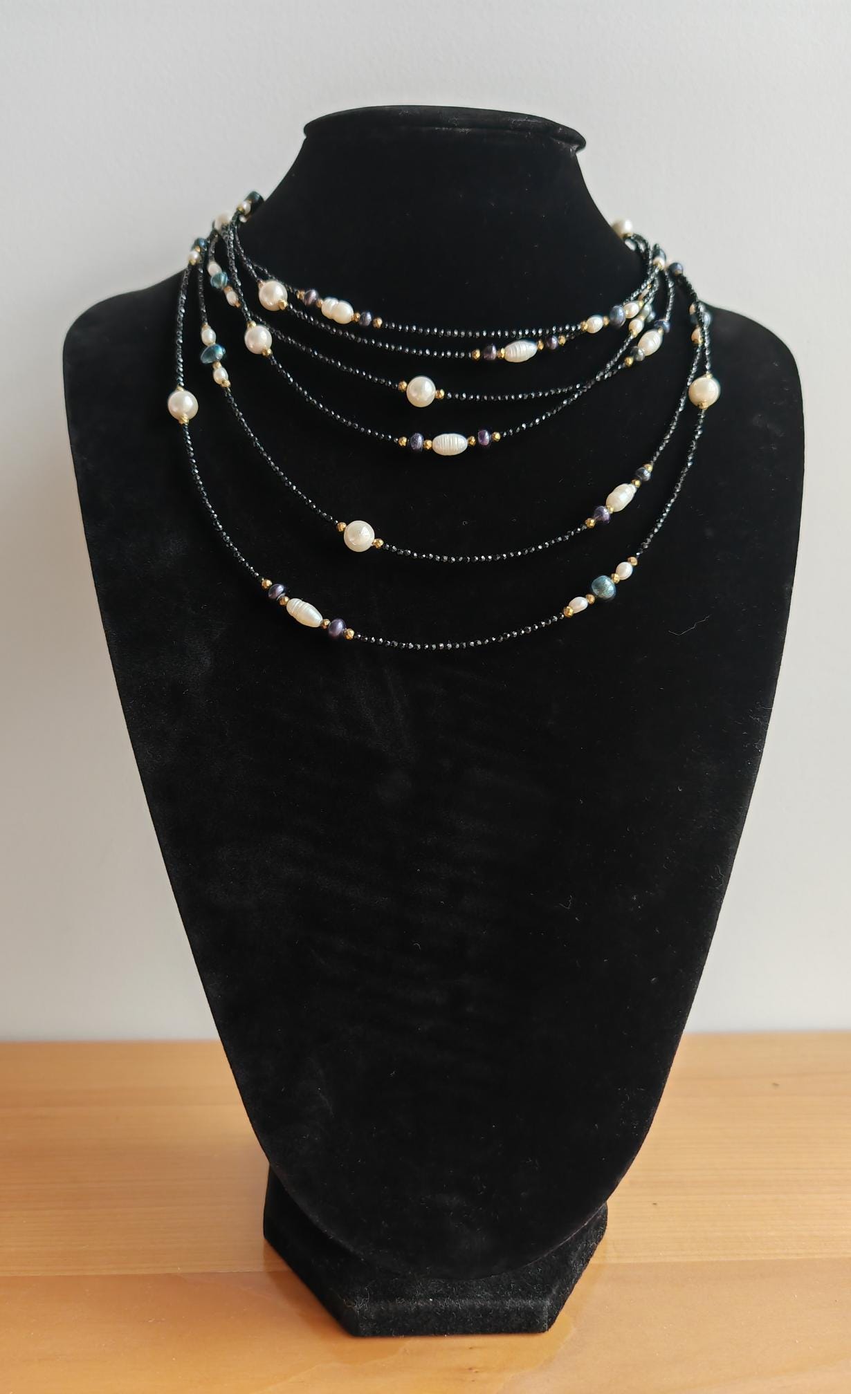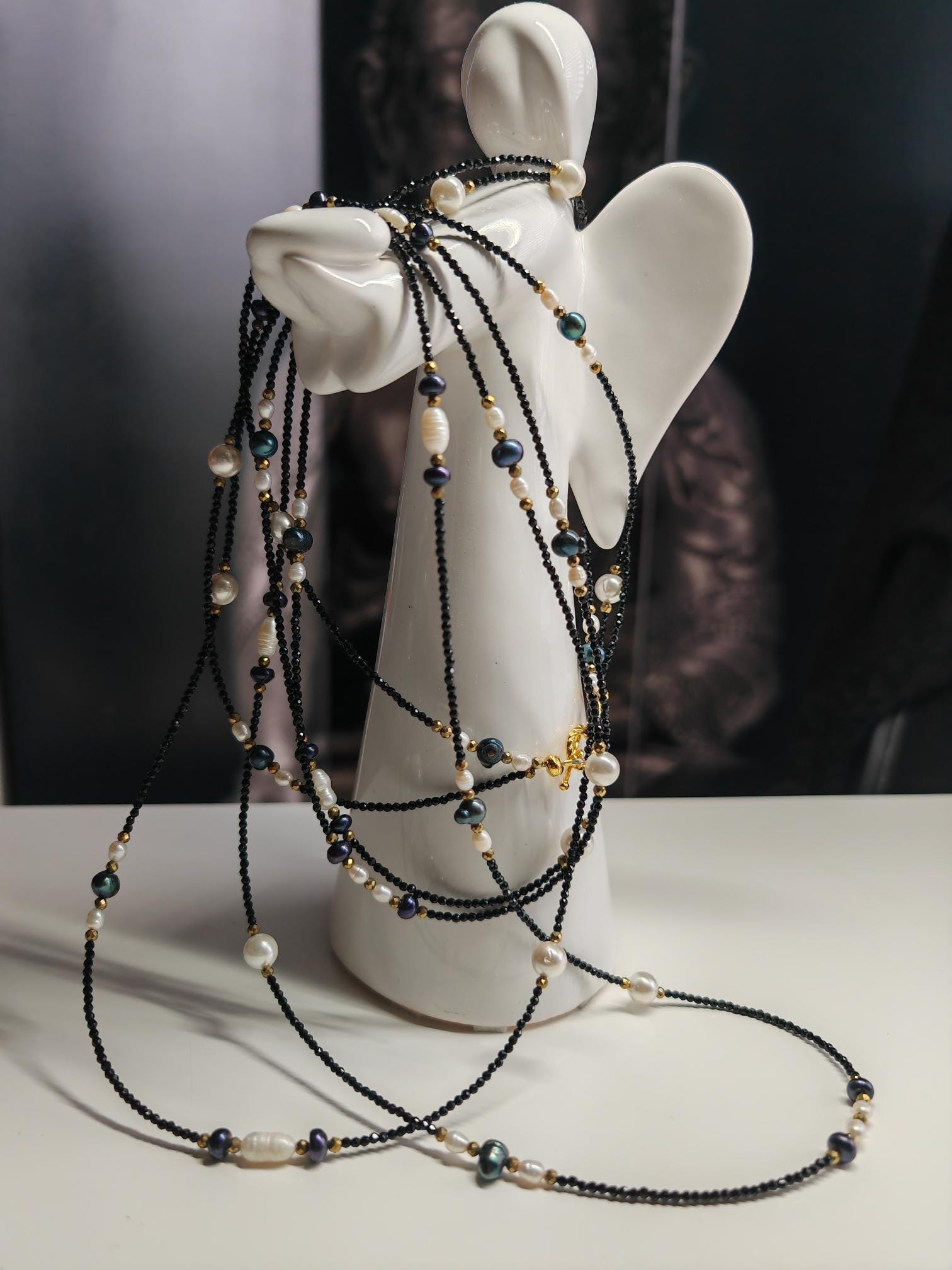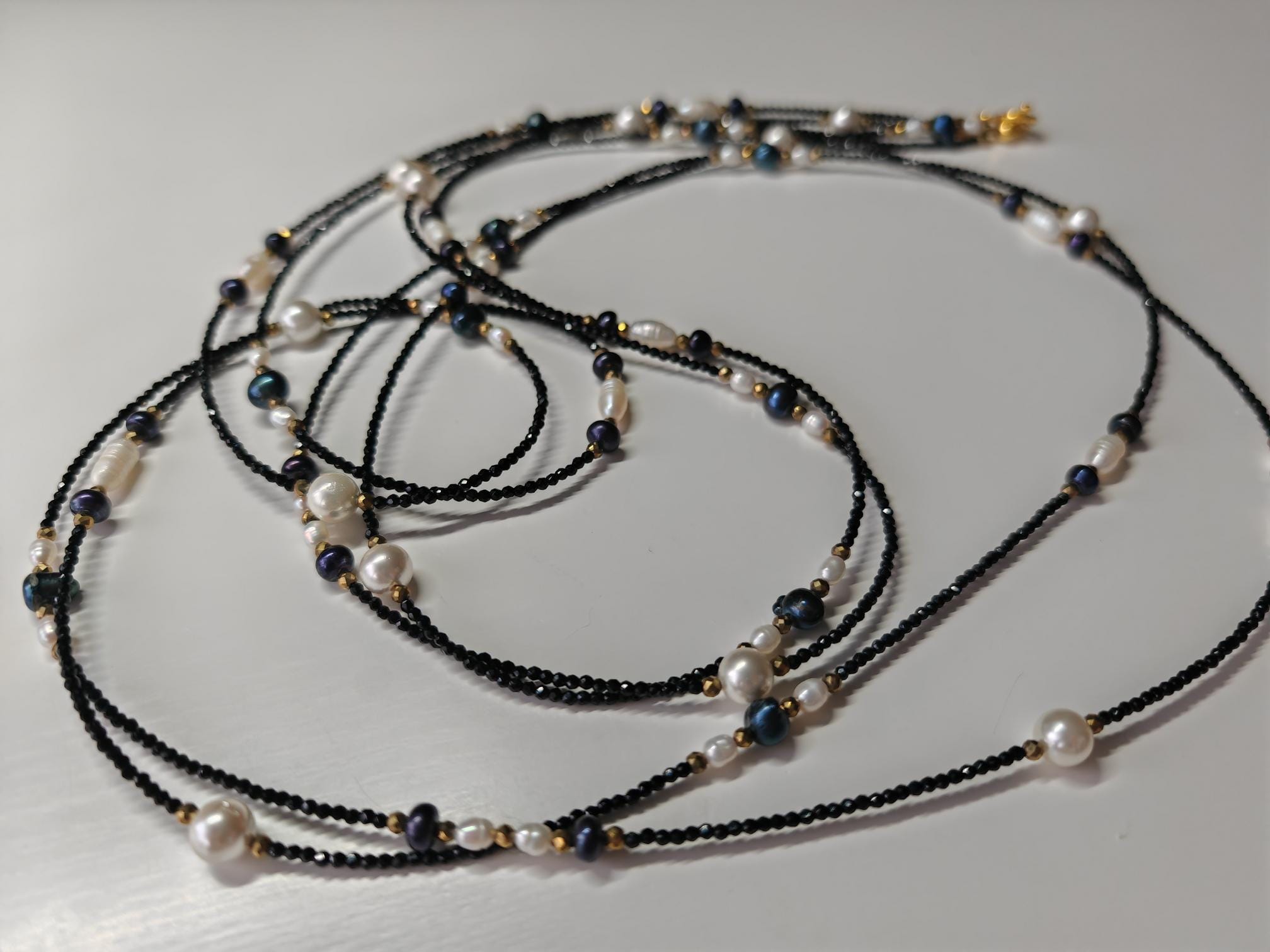 Handgemachte 145 - 147 cm etralange feine Kette mit Süsswasserperlen. Die 2-reihige Kette wurde aus Süsswasserperlen (in der Farbe Wasserblau ca 6 - 8 mm groß, in der Farbe Nachtblau ca 4 - 6 mm groß, in der Farbe Weiß ca 4 mm -5 mm, 9 - 11 mm), Muschelkernperlen in Weiß (8mm ), facettierten Spinell Perlen ( 2 mm in Schwarz und 3 mm in Gold) gefertigt. Knebelverschluß ist in der Farbe Gold.