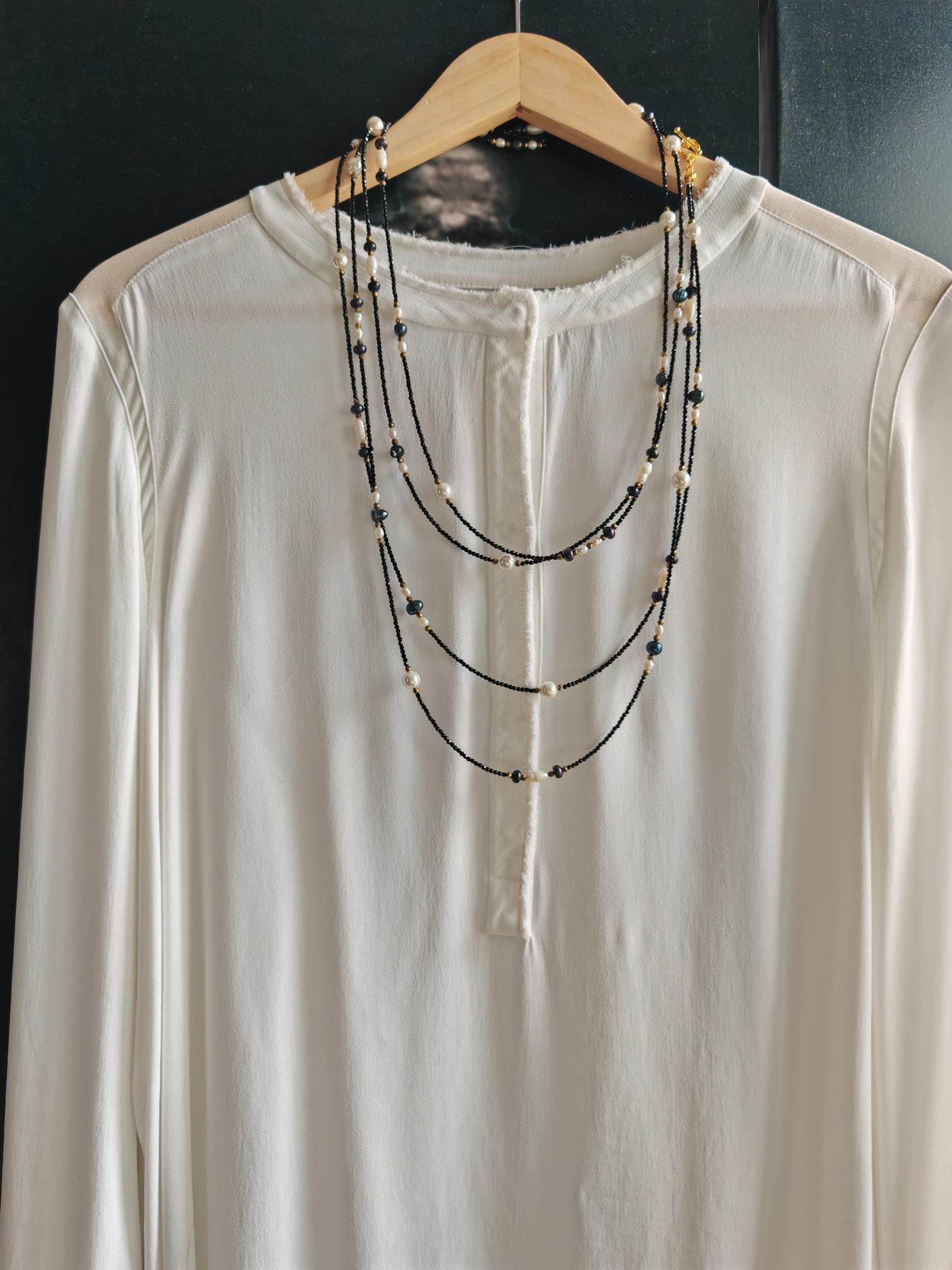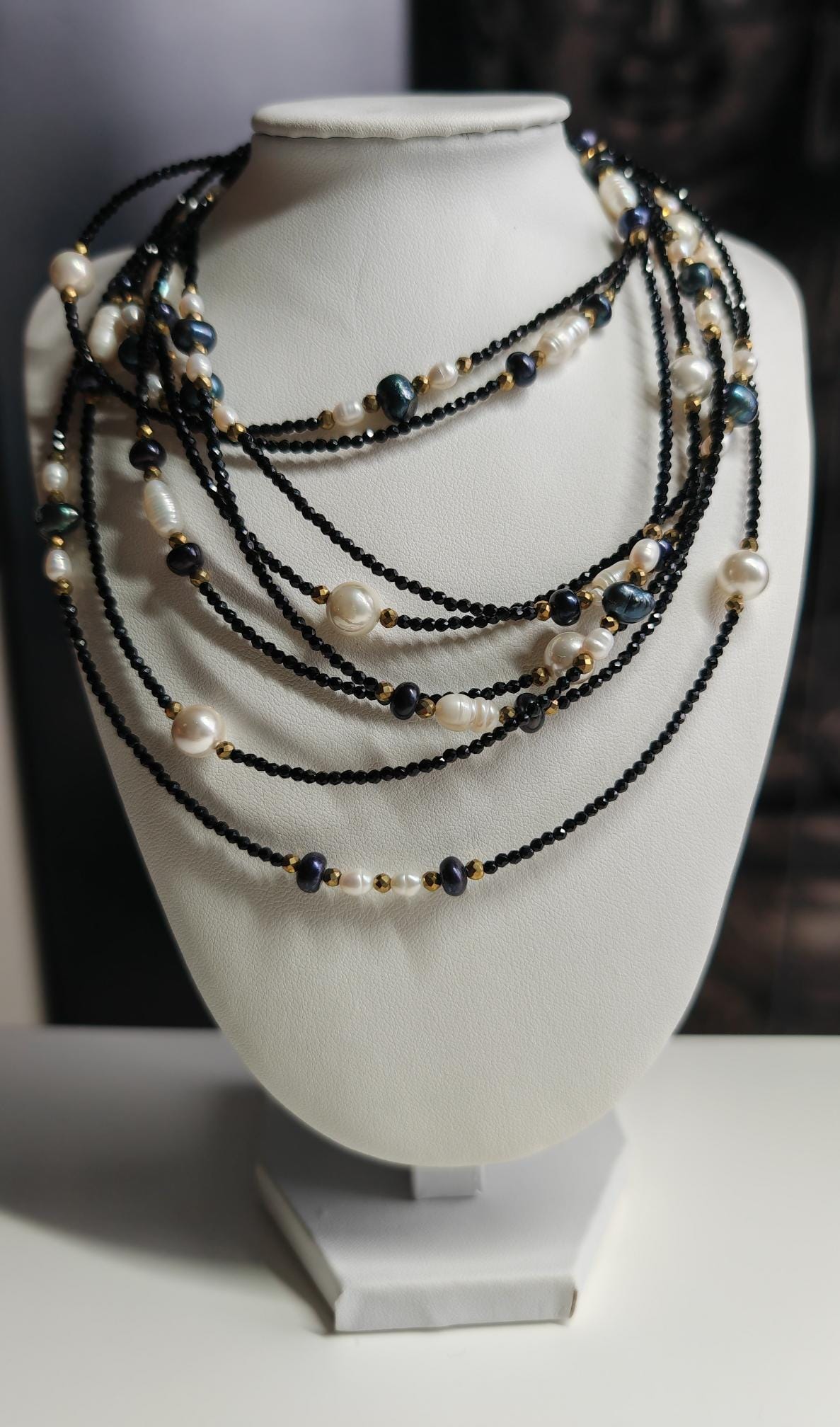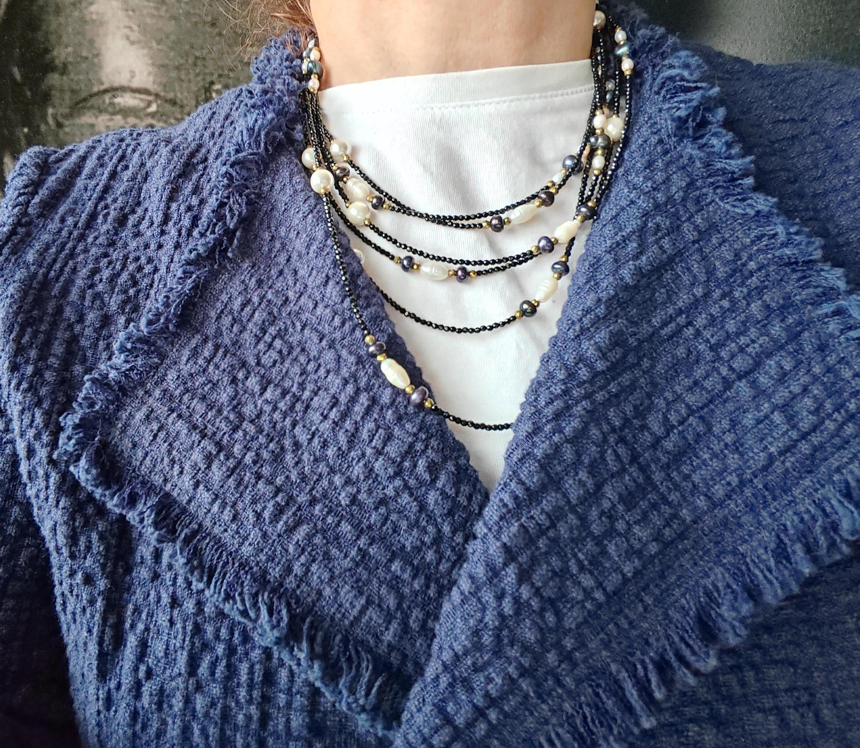 Handgemachte 145 - 147 cm etralange feine Kette mit Süsswasserperlen. Die 2-reihige Kette wurde aus Süsswasserperlen (in der Farbe Wasserblau ca 6 - 8 mm groß, in der Farbe Nachtblau ca 4 - 6 mm groß, in der Farbe Weiß ca 4 mm -5 mm, 9 - 11 mm), Muschelkernperlen in Weiß (8mm ), facettierten Spinell Perlen ( 2 mm in Schwarz und 3 mm in Gold) gefertigt. Knebelverschluß ist in der Farbe Gold.