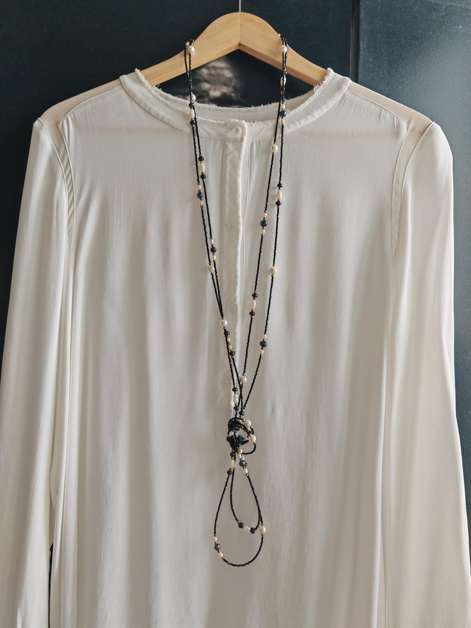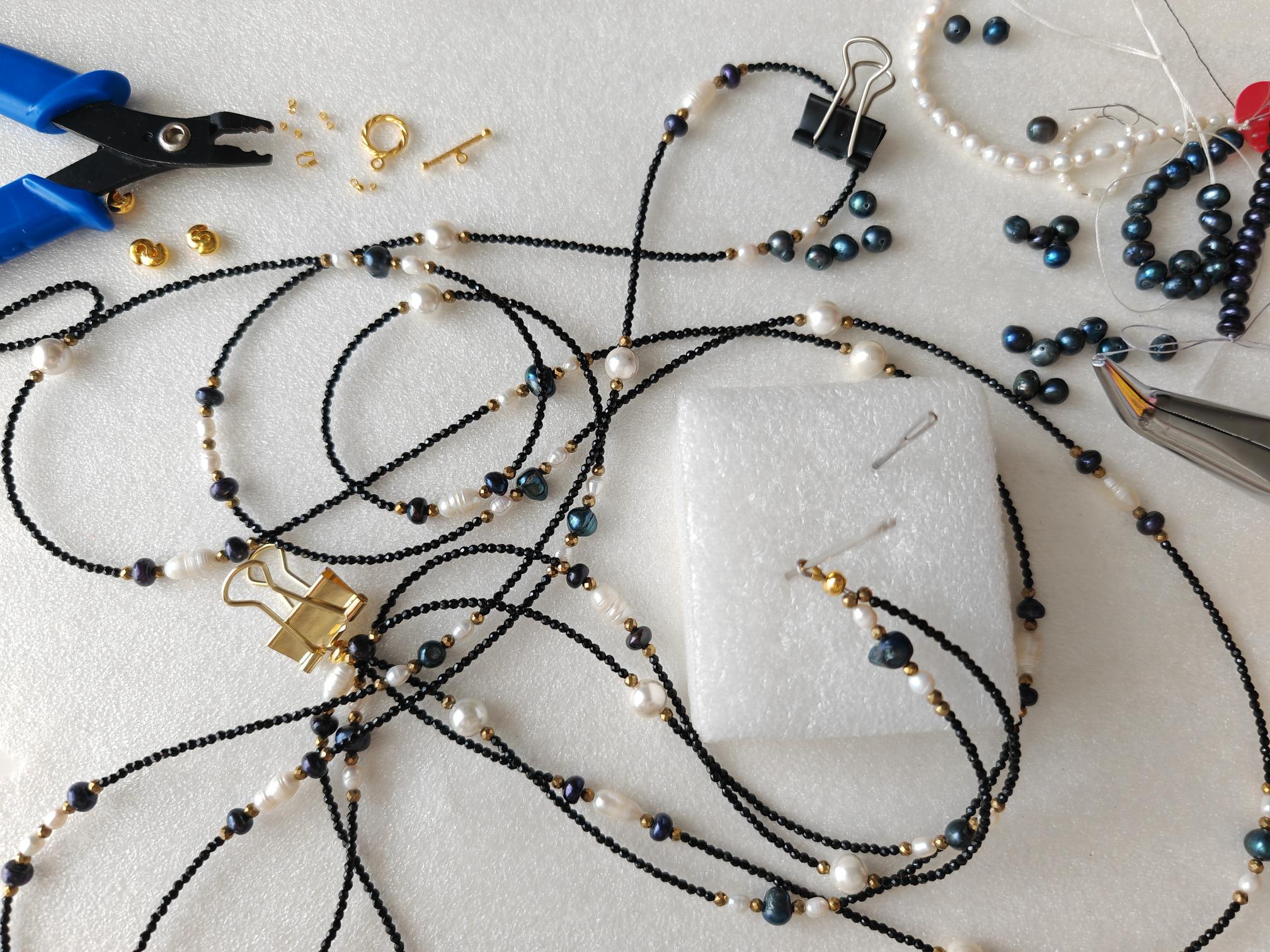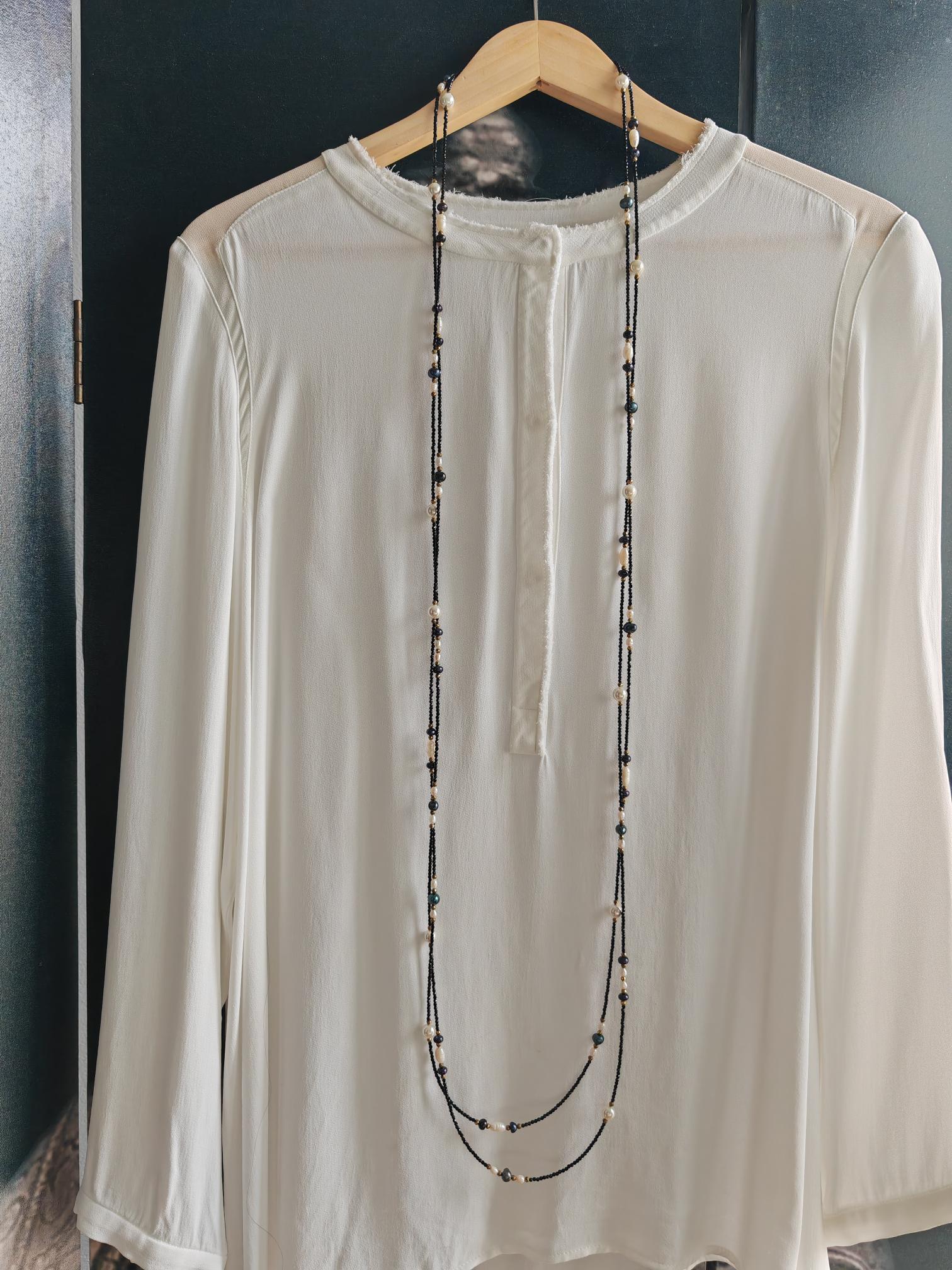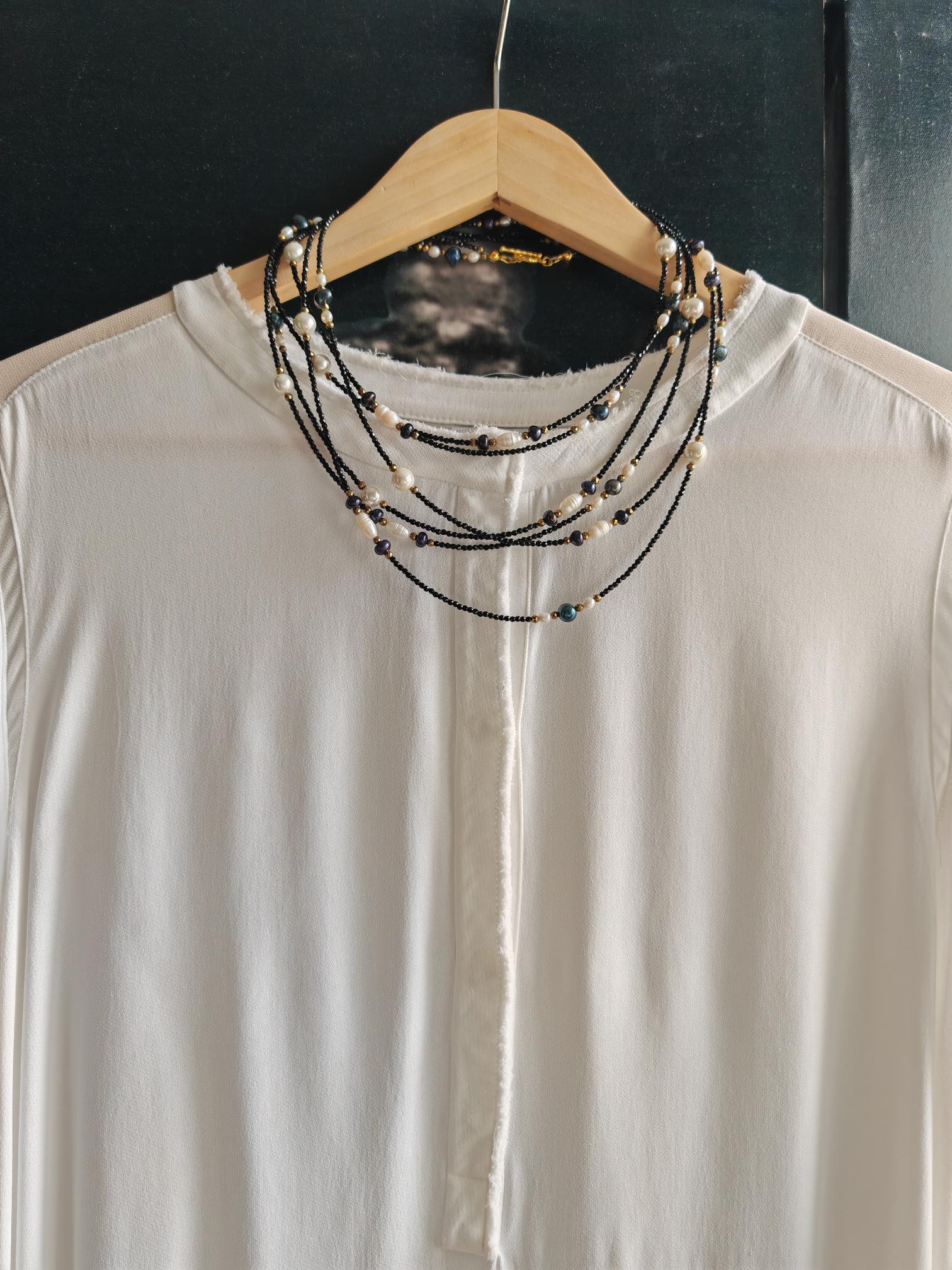Handgemachte 145 - 147 cm etralange feine Kette mit Süsswasserperlen. Die 2-reihige Kette wurde aus Süsswasserperlen (in der Farbe Wasserblau ca 6 - 8 mm groß, in der Farbe Nachtblau ca 4 - 6 mm groß, in der Farbe Weiß ca 4 mm -5 mm, 9 - 11 mm), Muschelkernperlen in Weiß (8mm ), facettierten Spinell Perlen ( 2 mm in Schwarz und 3 mm in Gold) gefertigt. Knebelverschluß ist in der Farbe Gold.